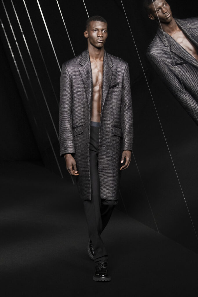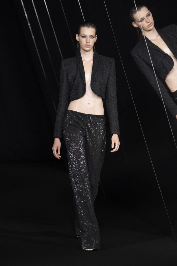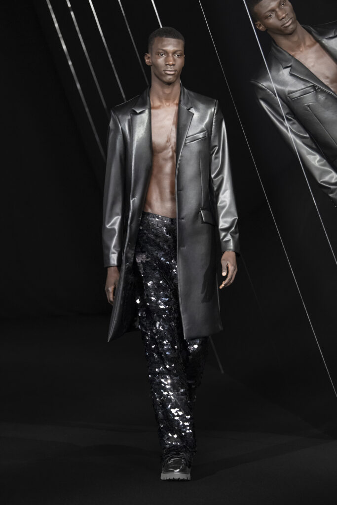 Les silhouettes féminines et masculines se répondent dans les matières à reflets brillants ou glacés dans une palette sobre de noirs ponctuée d’argent, d’iridescence et de blanc pur. Le costume de l’homme se pare de microlames de sequins étincelants que l’on retrouve dans une série de micro-robes bijoux.