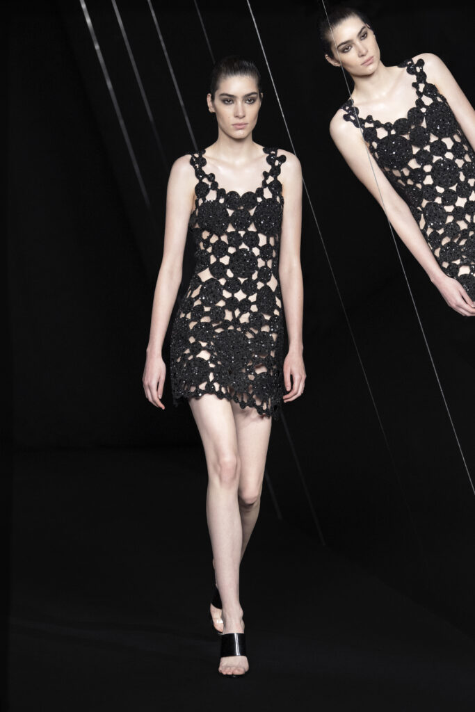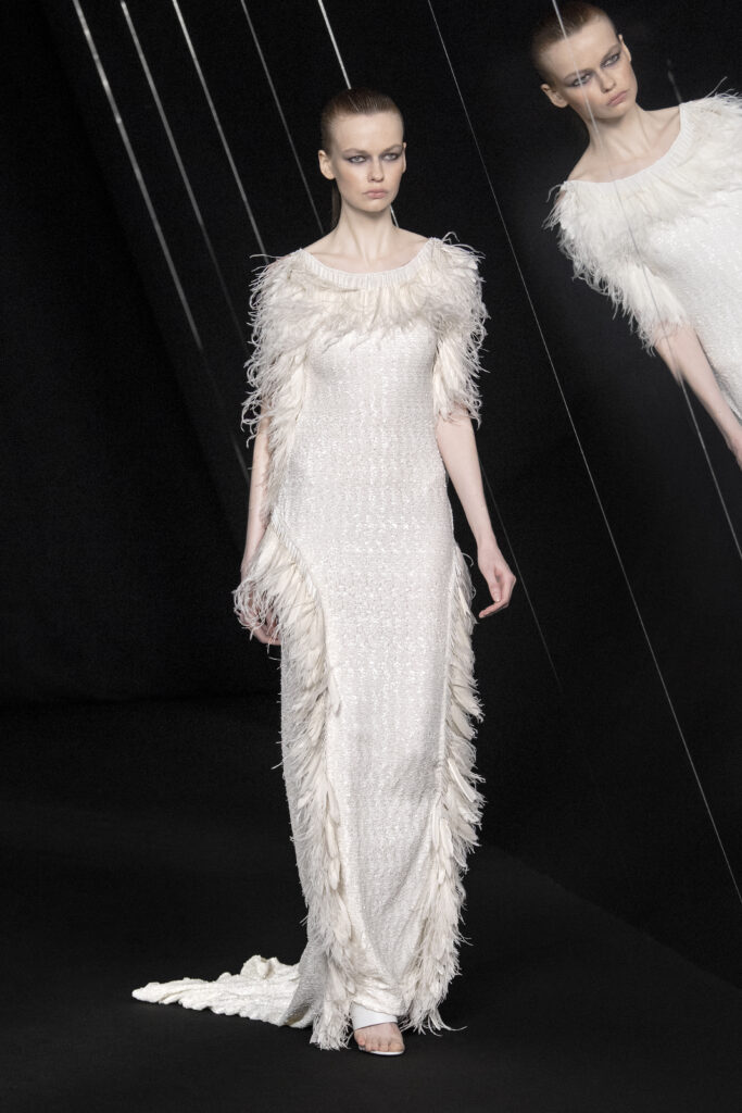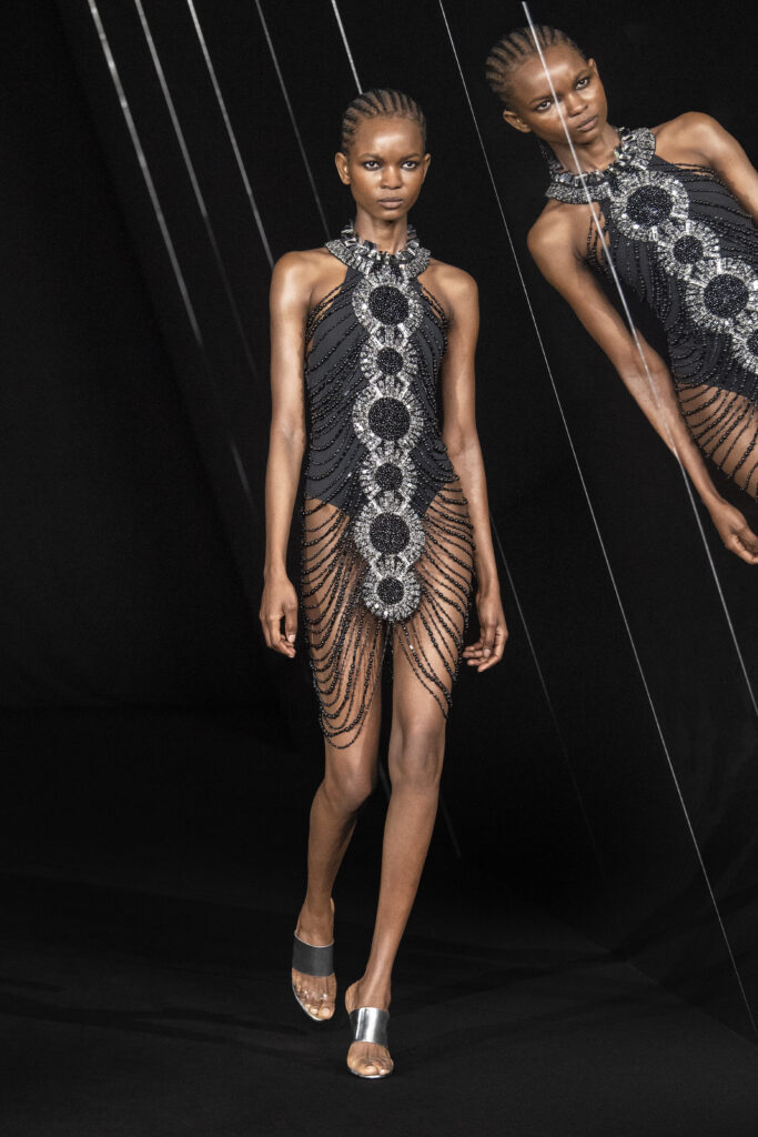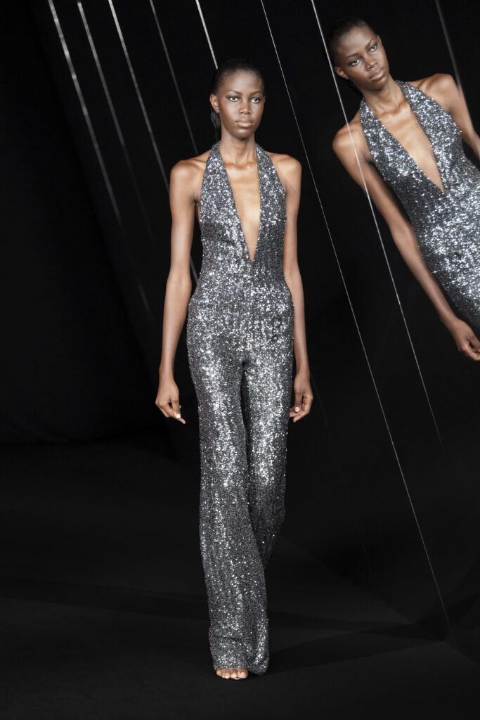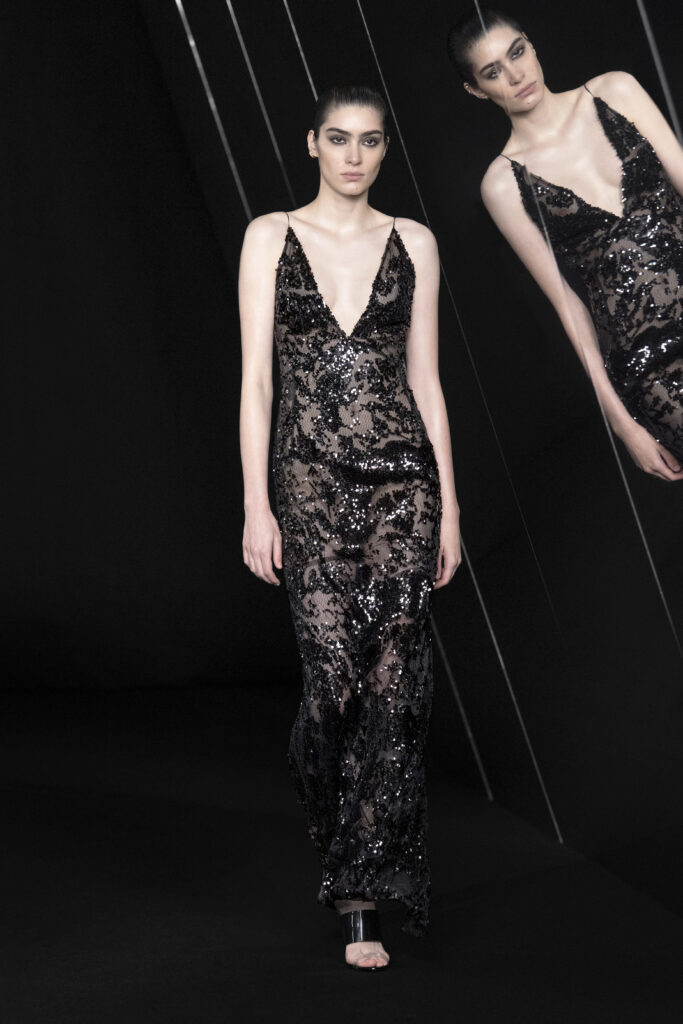 Des jeux d’asymétrie tranchés découpent la silhouette dans un entrelacs de lignes modernistes épurées. Des épaules marquées ou un décolleté abyssal répondent à une fente longiligne s’étirant du bas en haut des robes. Parsemant la collection de leurs éclats multiples, les broderies de perles, cristaux et sequins de toutes tailles le disputent à la brillance d’un lamé liquide, les ornements de colliers et de chaînes s’animent le long des échancrures de modèles en crêpe de soie sombres.