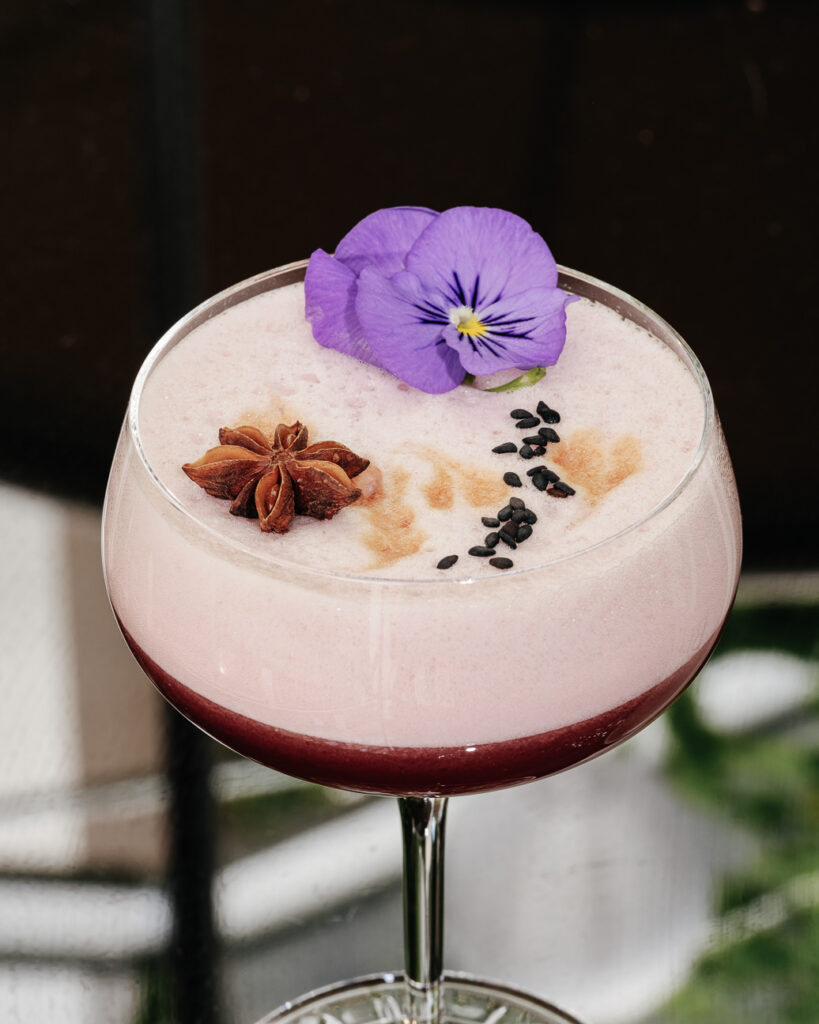 Vodka Belvedere, liqueur de framboise Chambord, framboises fraiches, sirop de rose, blancs d’oeuf, bitter cerise