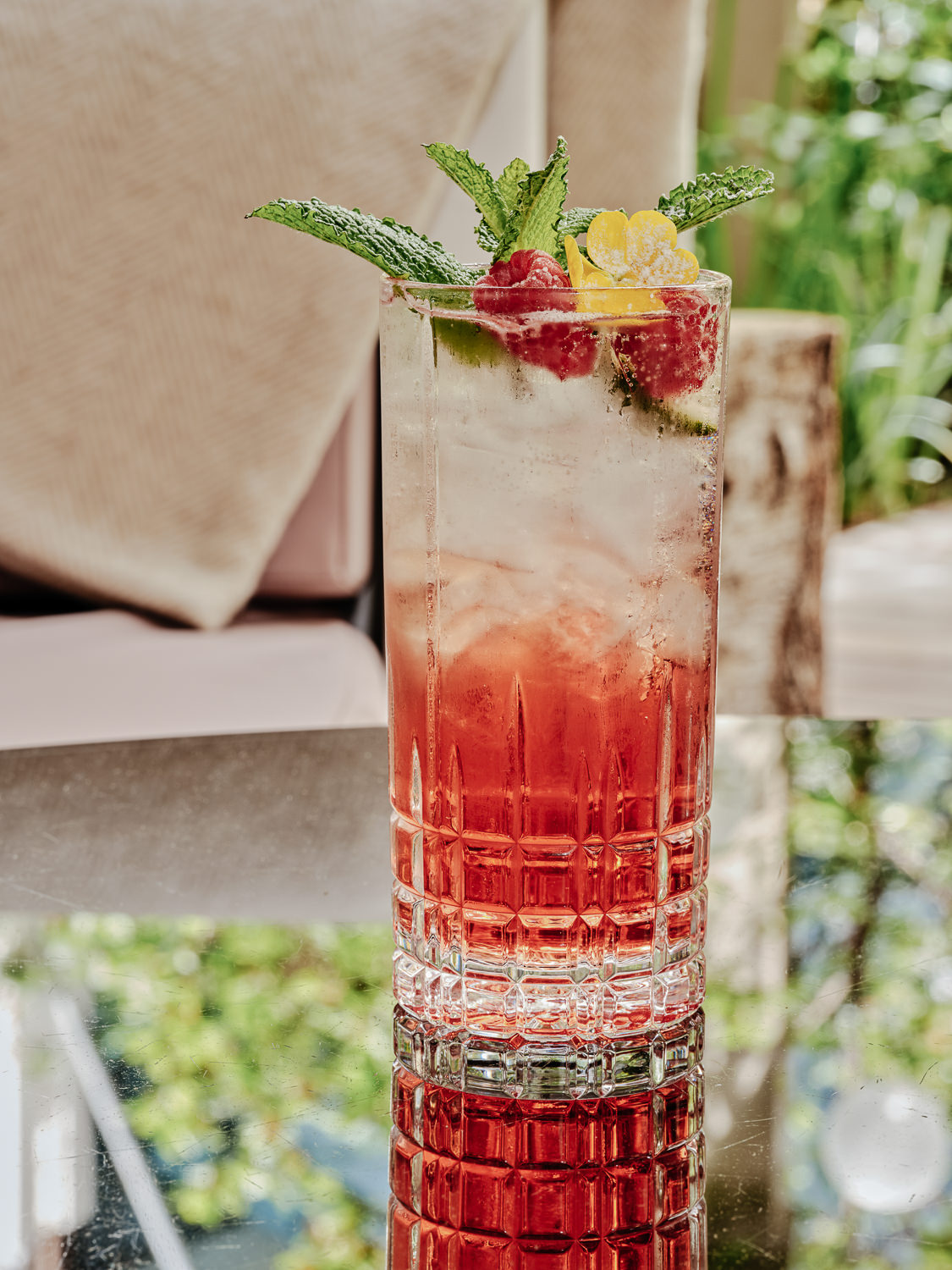 La terrasse du bar 8 est une véritable oasis nichée au cœur du jardin intérieur de l’hôtel. Il fait bon se détendre et déguster un cocktail rafraichissant à l’ombre de sa luxuriante végétation, ou à l’abri des caprices de la météo grâce à la tente qui la recouvre. Cet été, sa décoration éphémère reflète la nouvelle signature Made With Nature de Belvedere : une immersion au cœur de la nature et des éléments qui la composent comme le seigle de Pologne et l’eau purifiée, distillés au feu.
