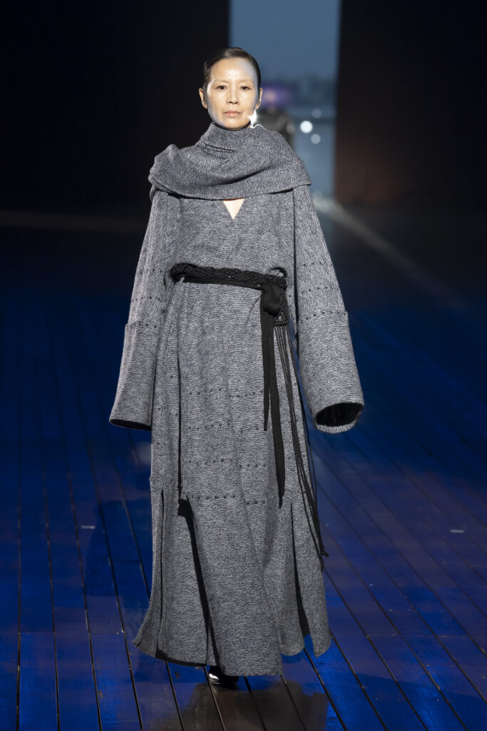 Many of the looks from the collection are, like kimono, made only with square patterns provoking the form that covers