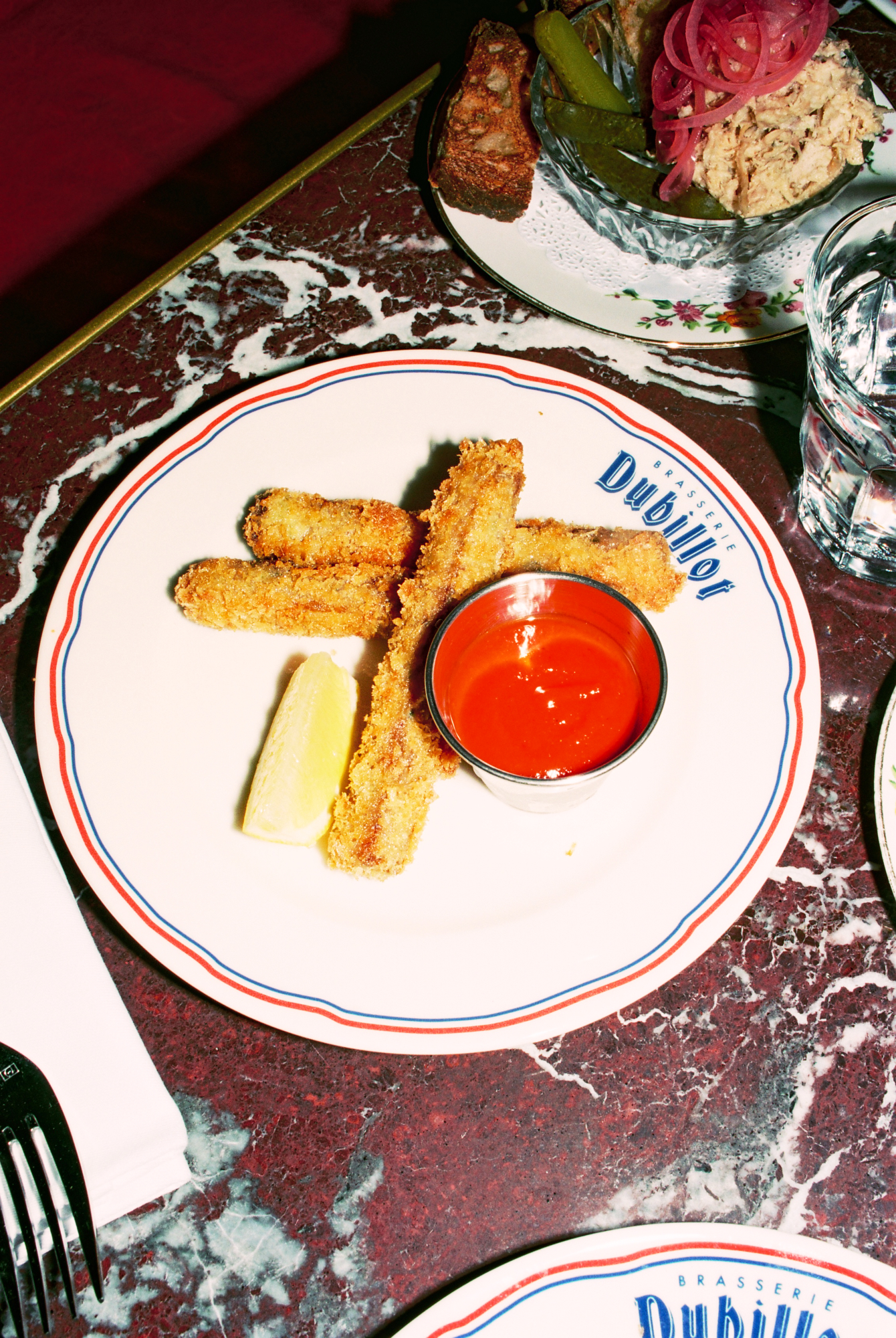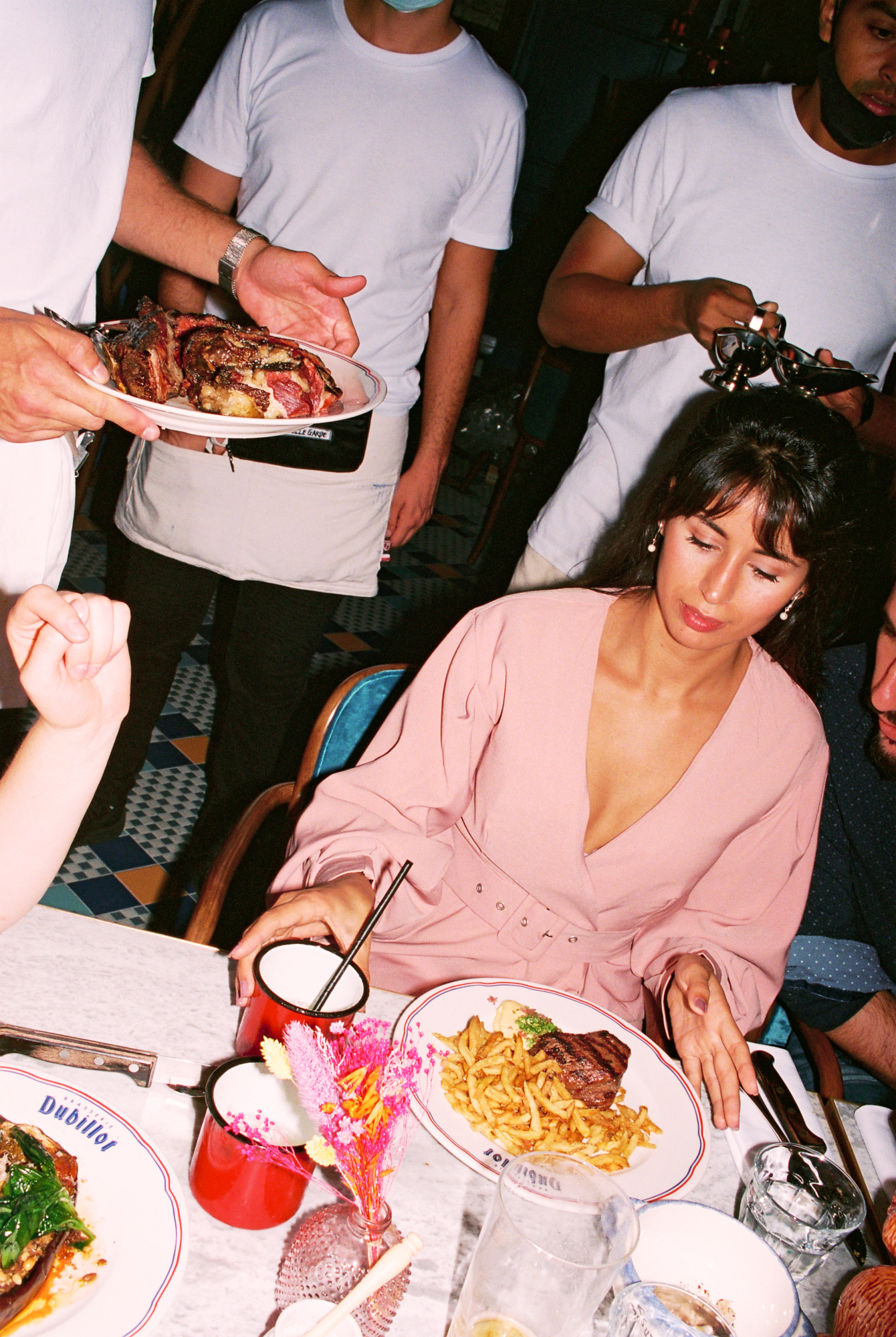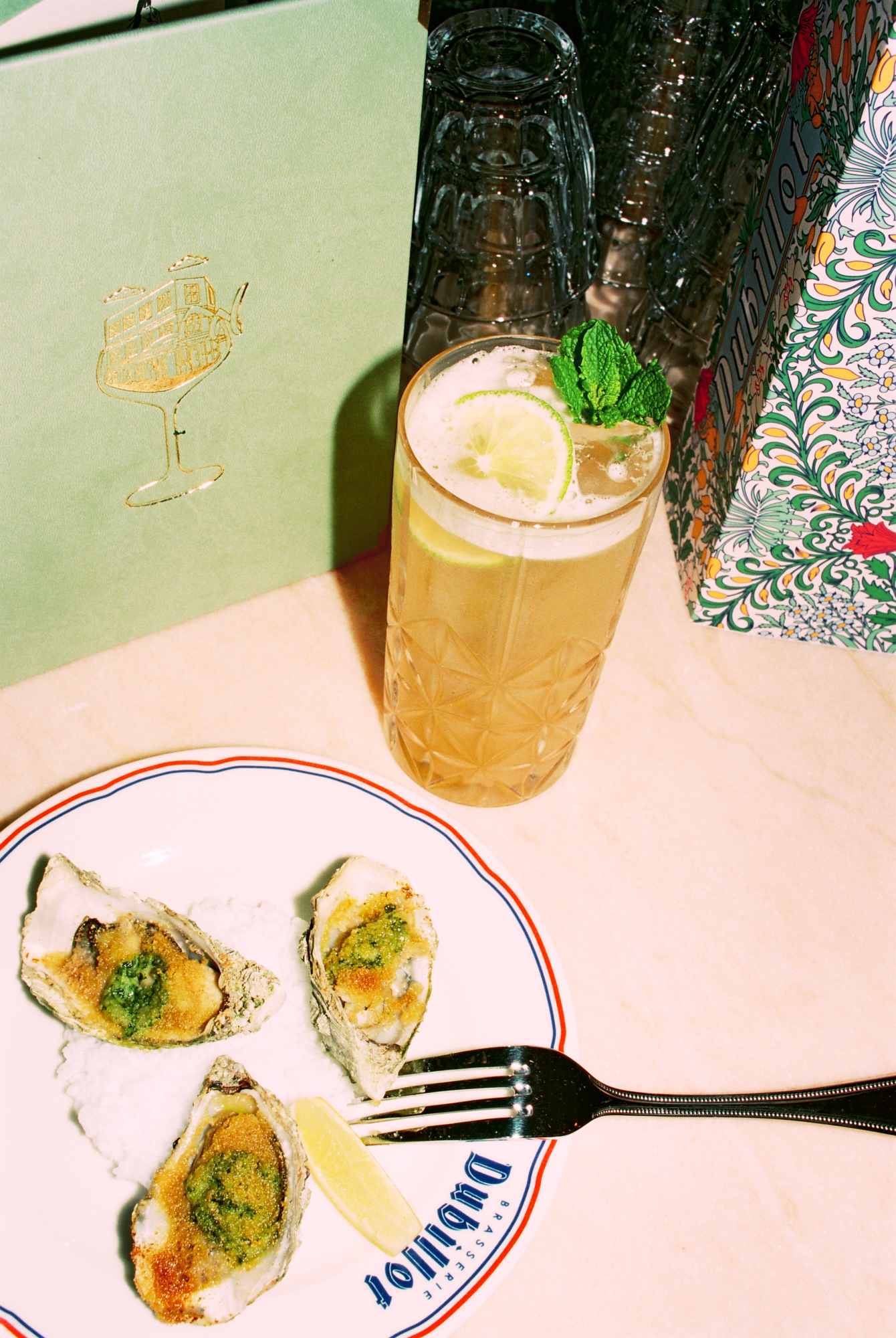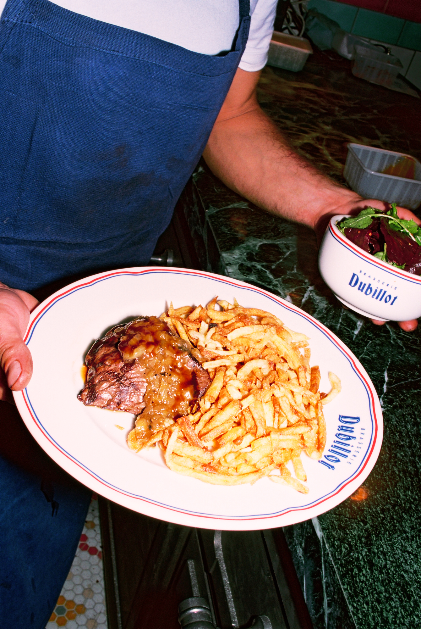 222 rue Saint-Denis, au beau milieu des ateliers de tissus qui faisaient la renommée de ce quartier ouvrier dans les années 70, l’enseigne champêtre « Dubillot » a fière allure. Elle est surmontée par 6m² de fresque en mosaïque style iconographie à la Alphonse de Muchat qui trône au-dessus de la terrasse. Stupéfiant. L’artisanat français dans toute sa splendeur qui sort d’un atelier d’artiste du 12ème arrondissement. Sur les protes, deux « à table ! » fièrement sérigraphiés à la feuille d’or laissent présager la suite. Dubillot apparait dès l’entrée, mosaïque folklo sous les pieds, comme étant un haut lieu des Années Folles.