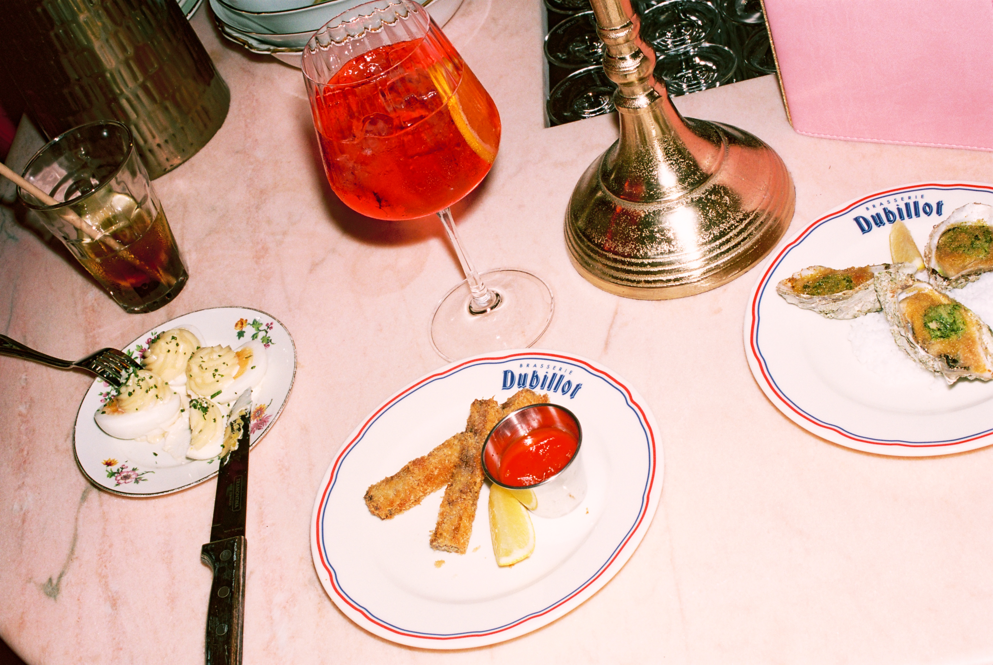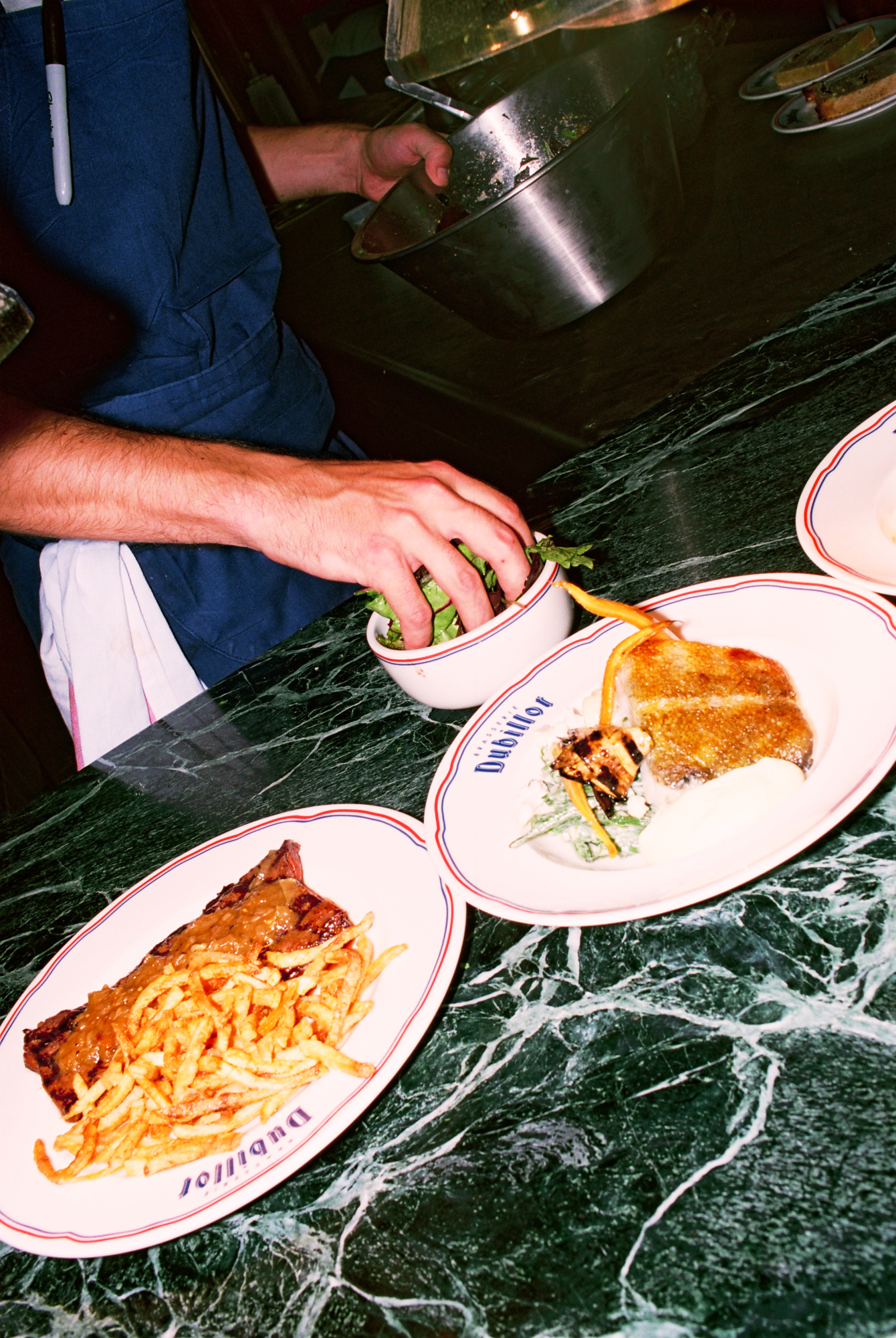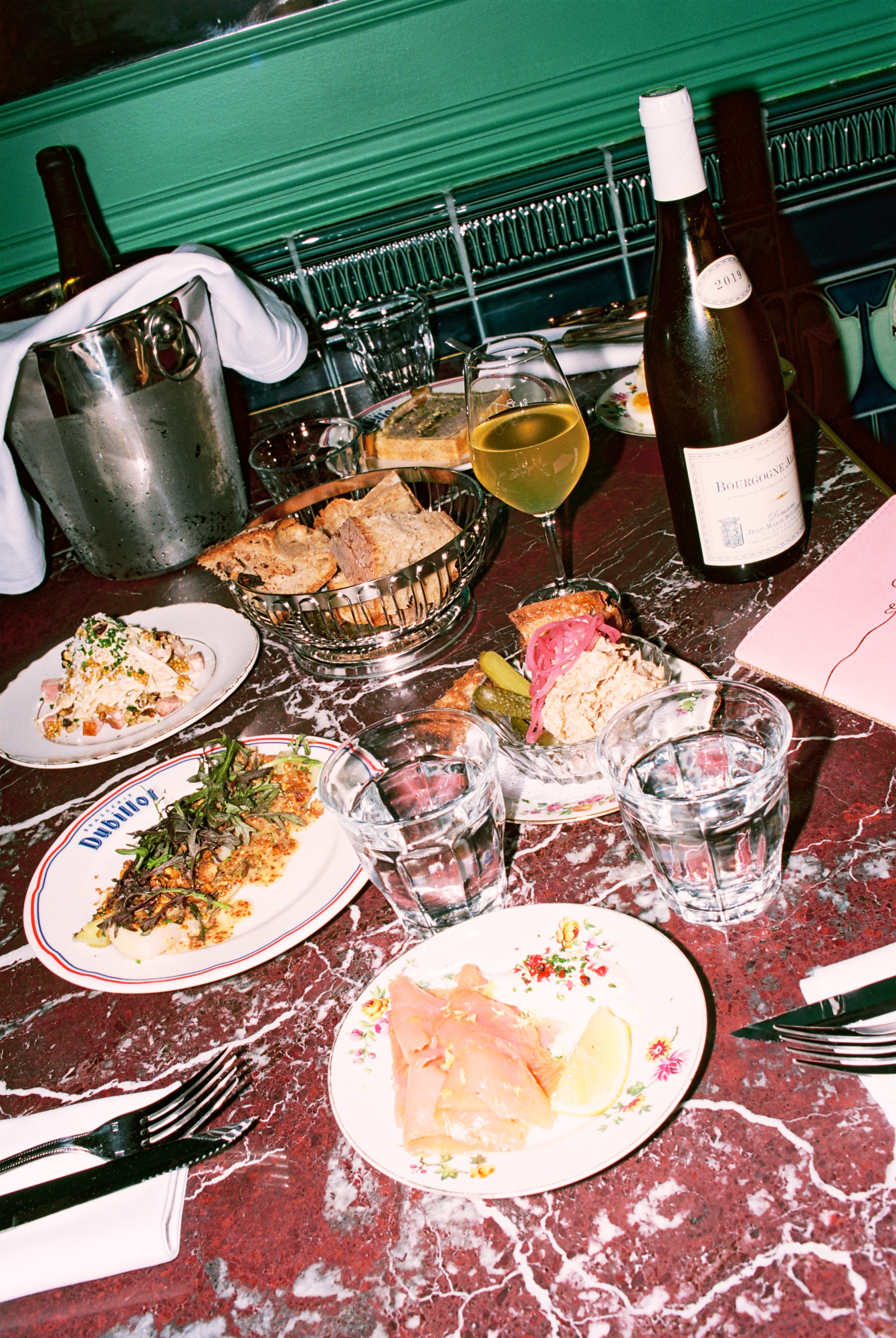 222 rue Saint-Denis, au beau milieu des ateliers de tissus qui faisaient la renommée de ce quartier ouvrier dans les années 70, l’enseigne champêtre « Dubillot » a fière allure. Elle est surmontée par 6m² de fresque en mosaïque style iconographie à la Alphonse de Muchat qui trône au-dessus de la terrasse. Stupéfiant. L’artisanat français dans toute sa splendeur qui sort d’un atelier d’artiste du 12ème arrondissement. Sur les protes, deux « à table ! » fièrement sérigraphiés à la feuille d’or laissent présager la suite. Dubillot apparait dès l’entrée, mosaïque folklo sous les pieds, comme étant un haut lieu des Années Folles.