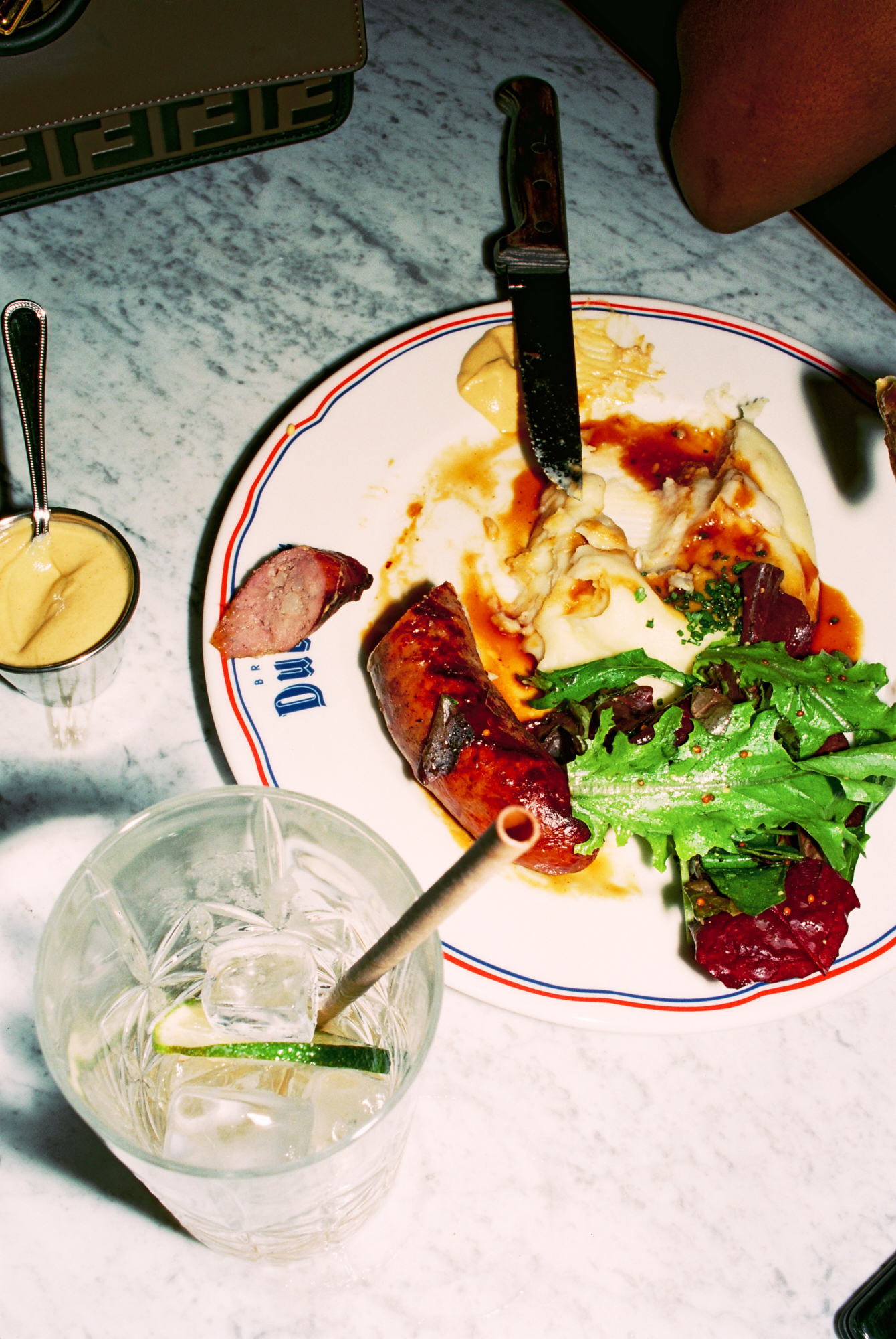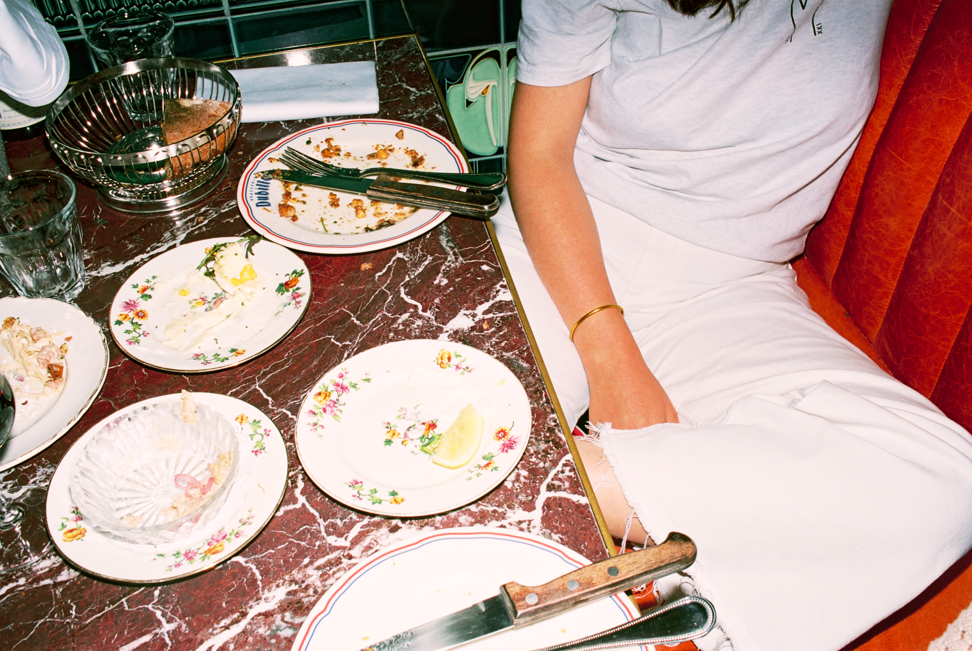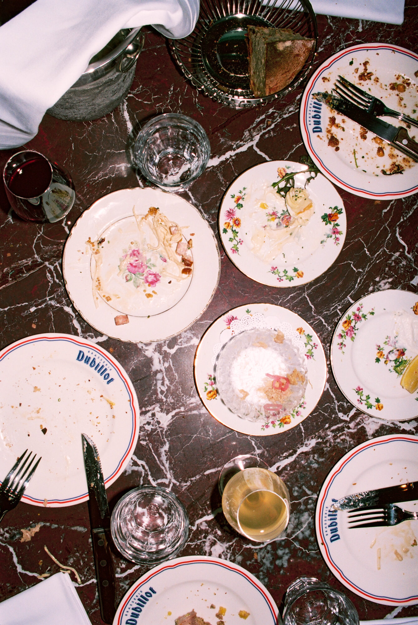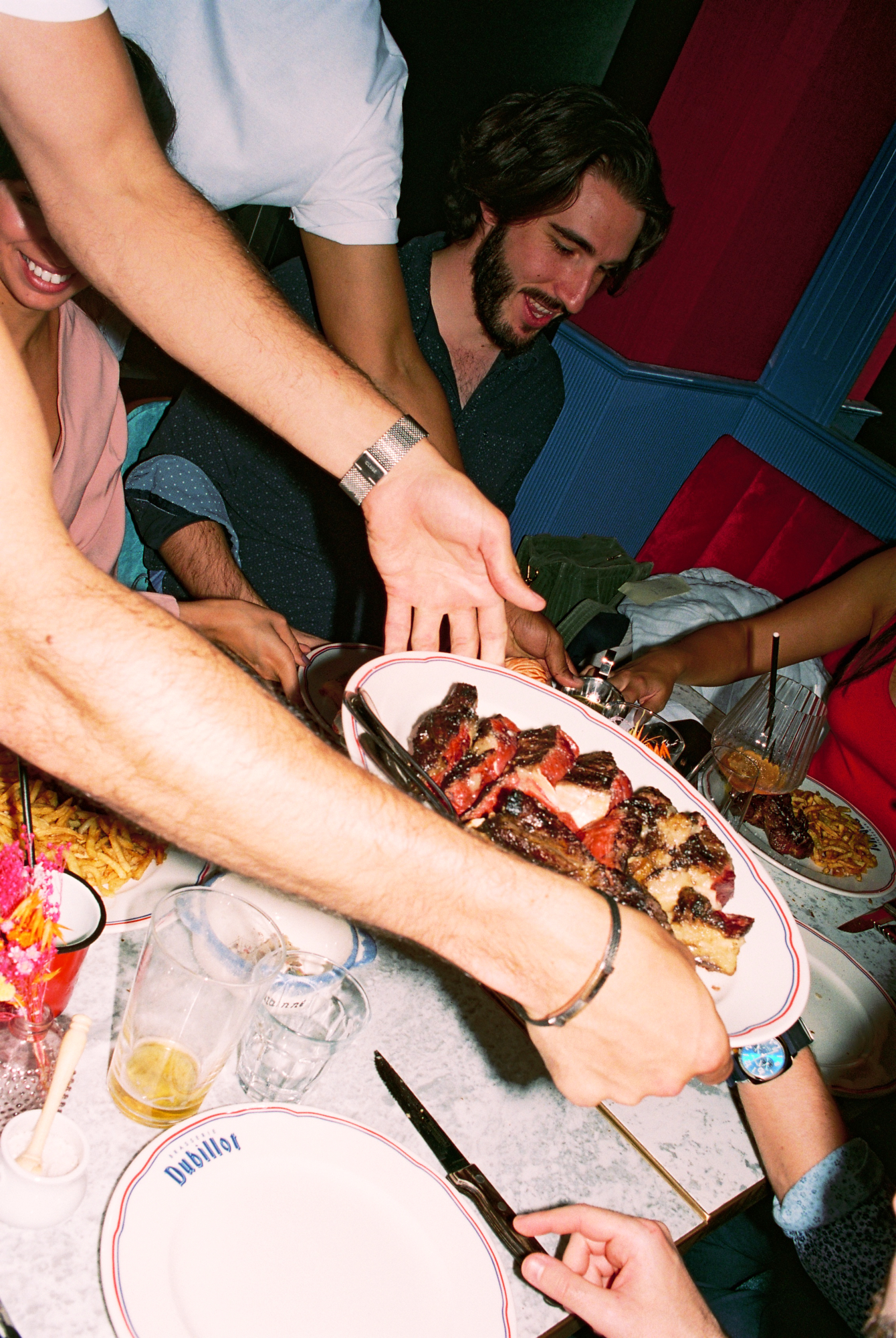 222 rue Saint-Denis, au beau milieu des ateliers de tissus qui faisaient la renommée de ce quartier ouvrier dans les années 70, l’enseigne champêtre « Dubillot » a fière allure. Elle est surmontée par 6m² de fresque en mosaïque style iconographie à la Alphonse de Muchat qui trône au-dessus de la terrasse. Stupéfiant. L’artisanat français dans toute sa splendeur qui sort d’un atelier d’artiste du 12ème arrondissement. Sur les protes, deux « à table ! » fièrement sérigraphiés à la feuille d’or laissent présager la suite. Dubillot apparait dès l’entrée, mosaïque folklo sous les pieds, comme étant un haut lieu des Années Folles.