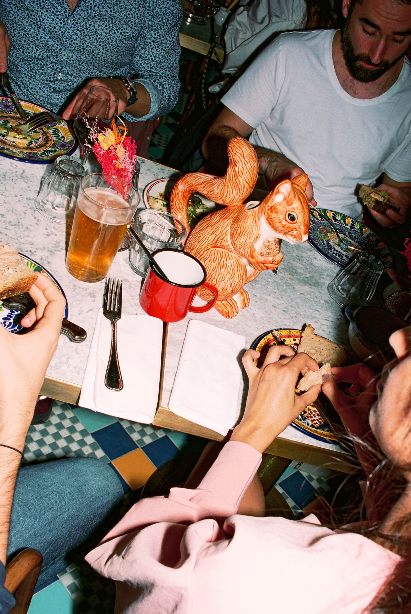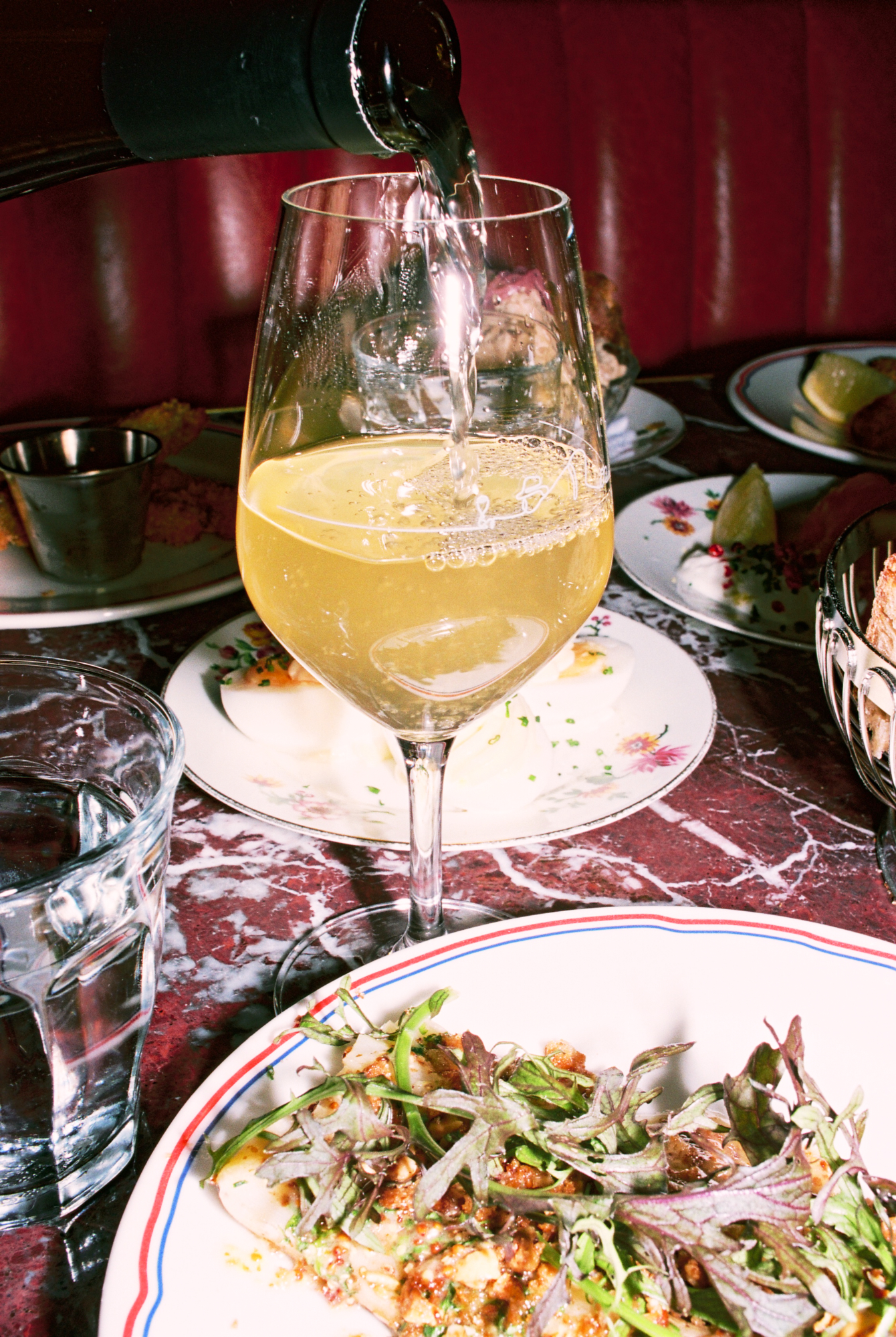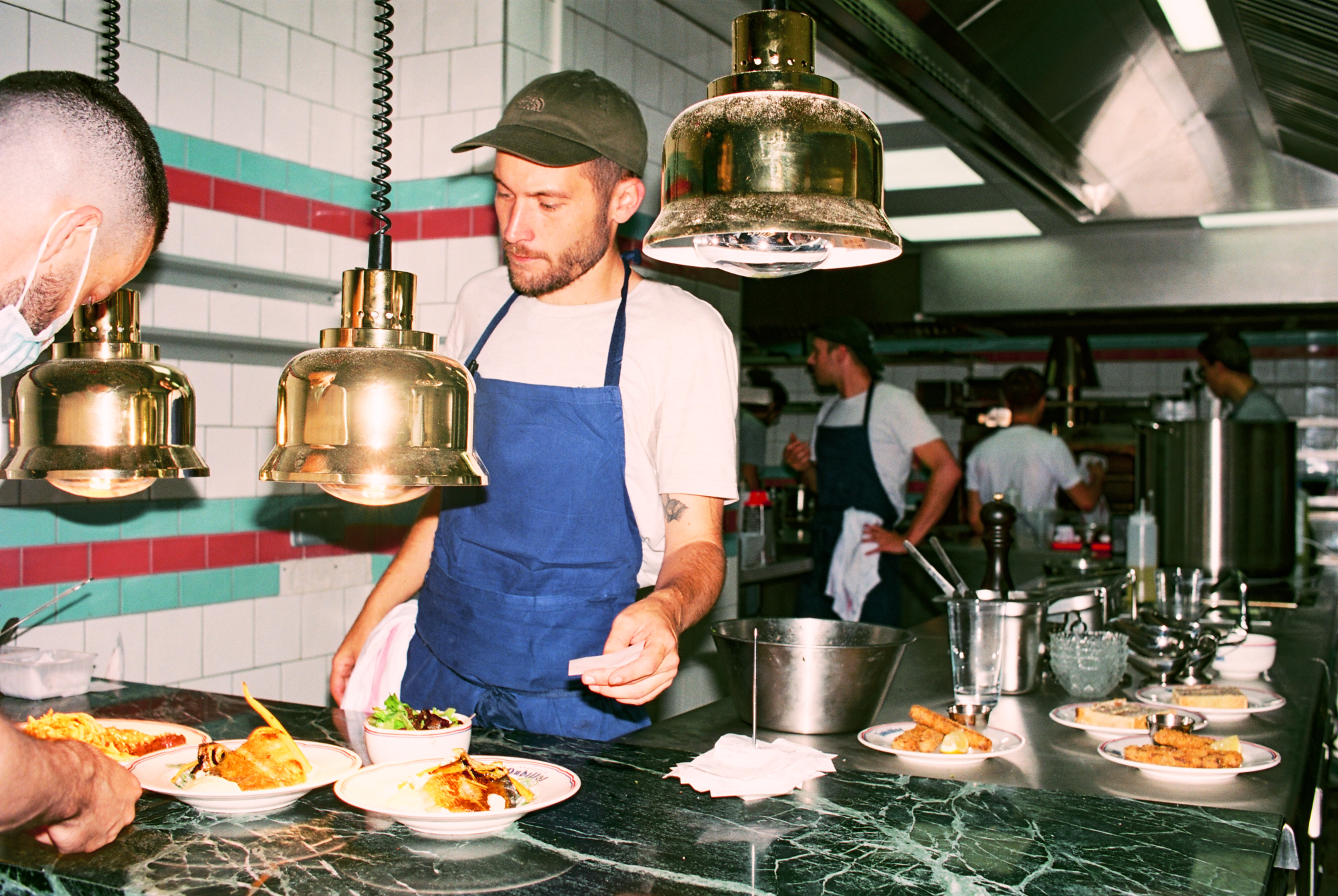A peine passé le pas de la porte on fait face à un bar en marbre rose au charme entêtant. Pour complaire l’ensemble, comptoir en chêne naturel et faïence émaillée qu’on croirait venir tout droit d’une officine du début du XXème siècle. Les architectes de B3 Designers et de Dorénavant Studio n’ont rien laissé au hasard.