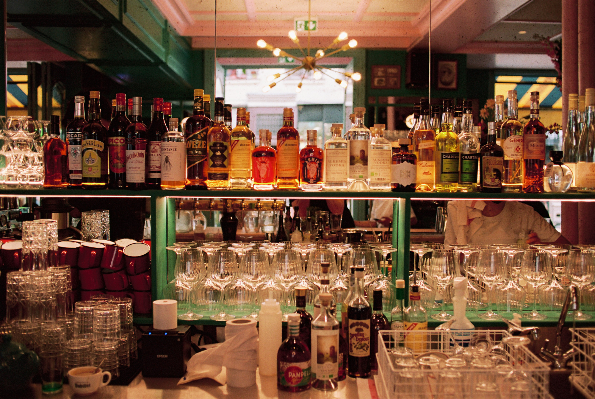 L’étage rivalise de beauté avec le rez-de-chaussée. A mi-chemin, on tombe nez-à-nez avec une immense et électrisante arcade de bouteilles. On déboule sur un palier en parquet massif dans une pose Versailles revisitée, pleine vue sur la verrière en vitrail cathédrale aux tons chamarrés.