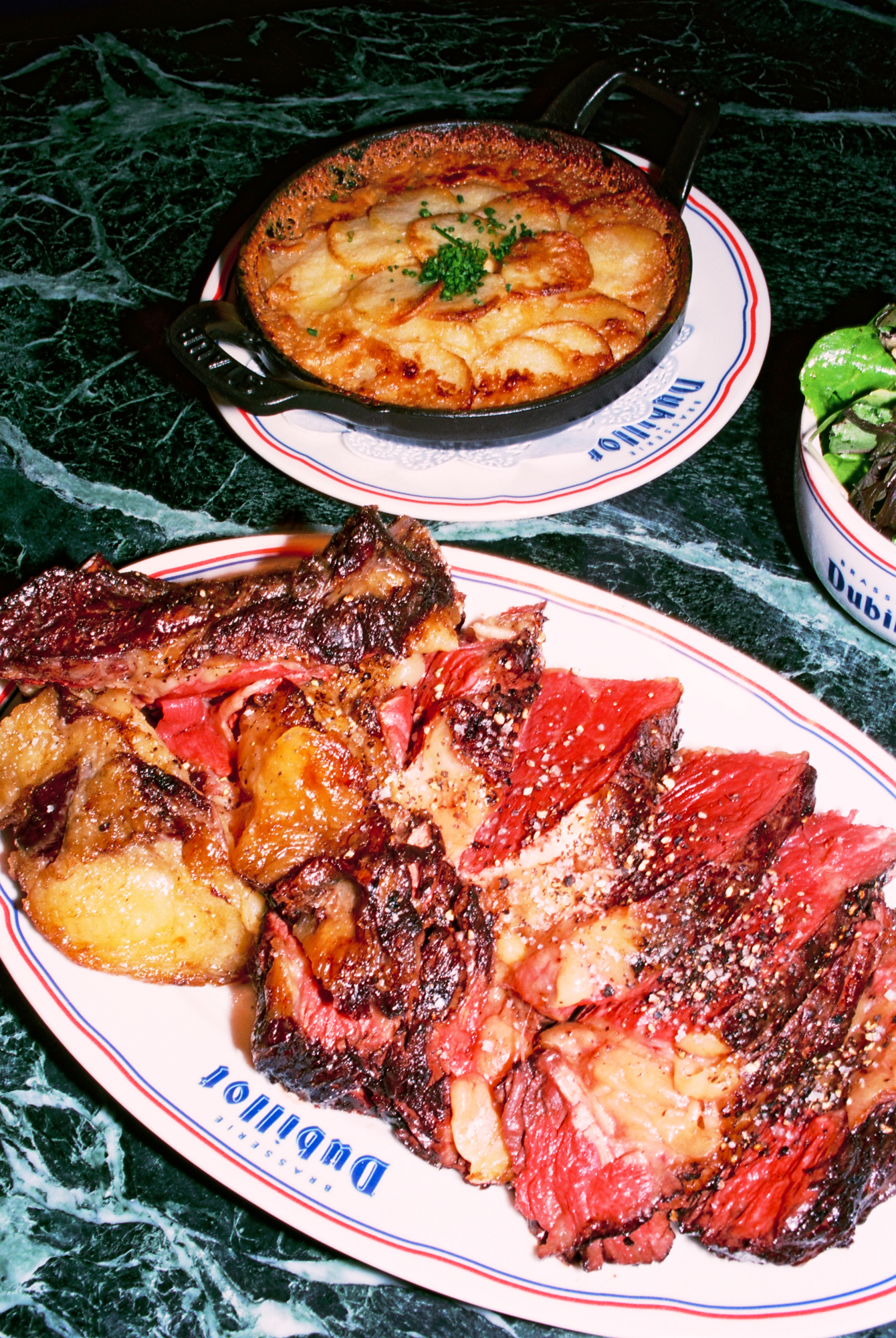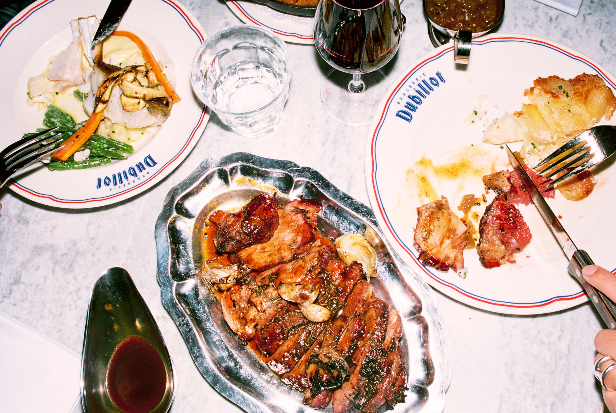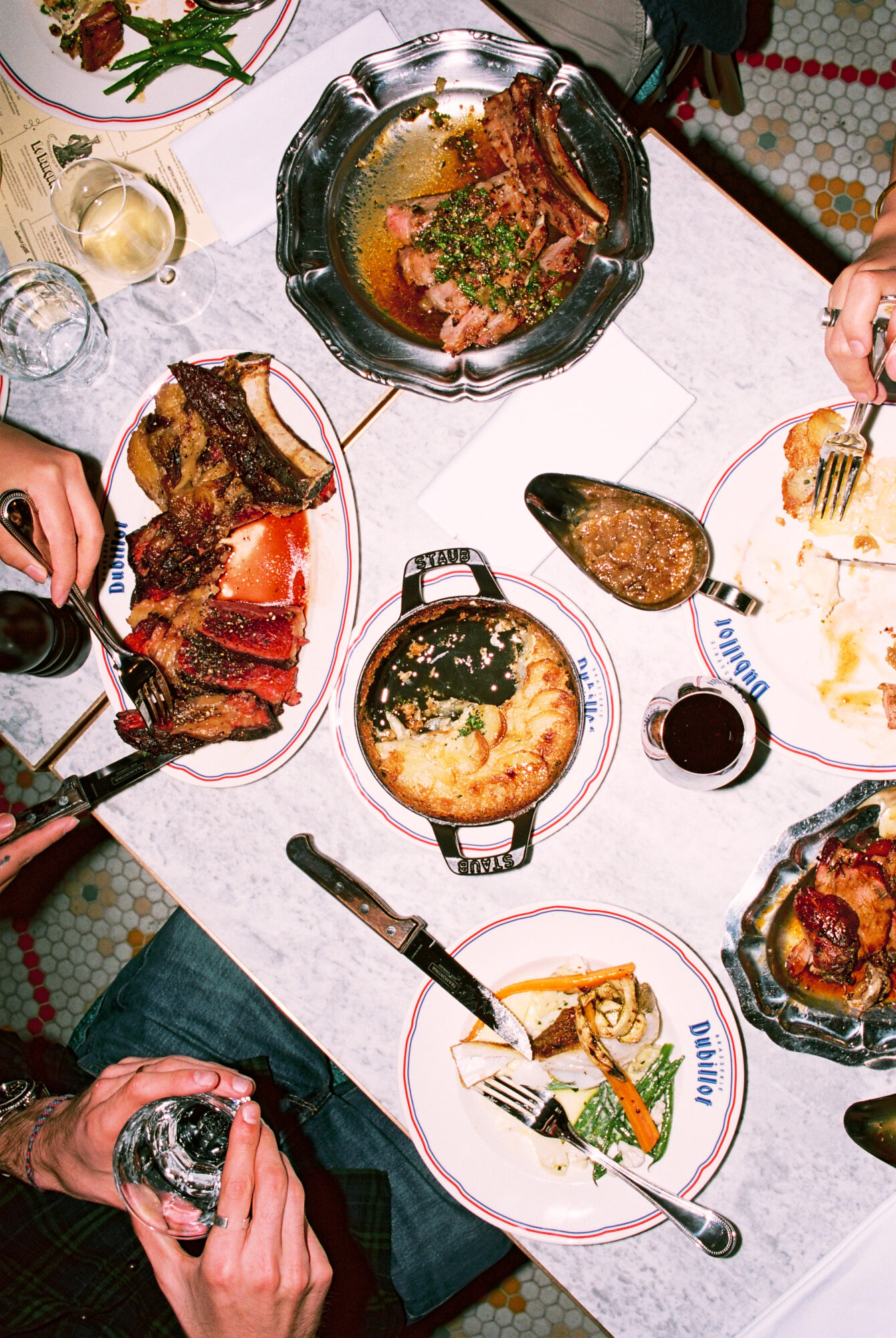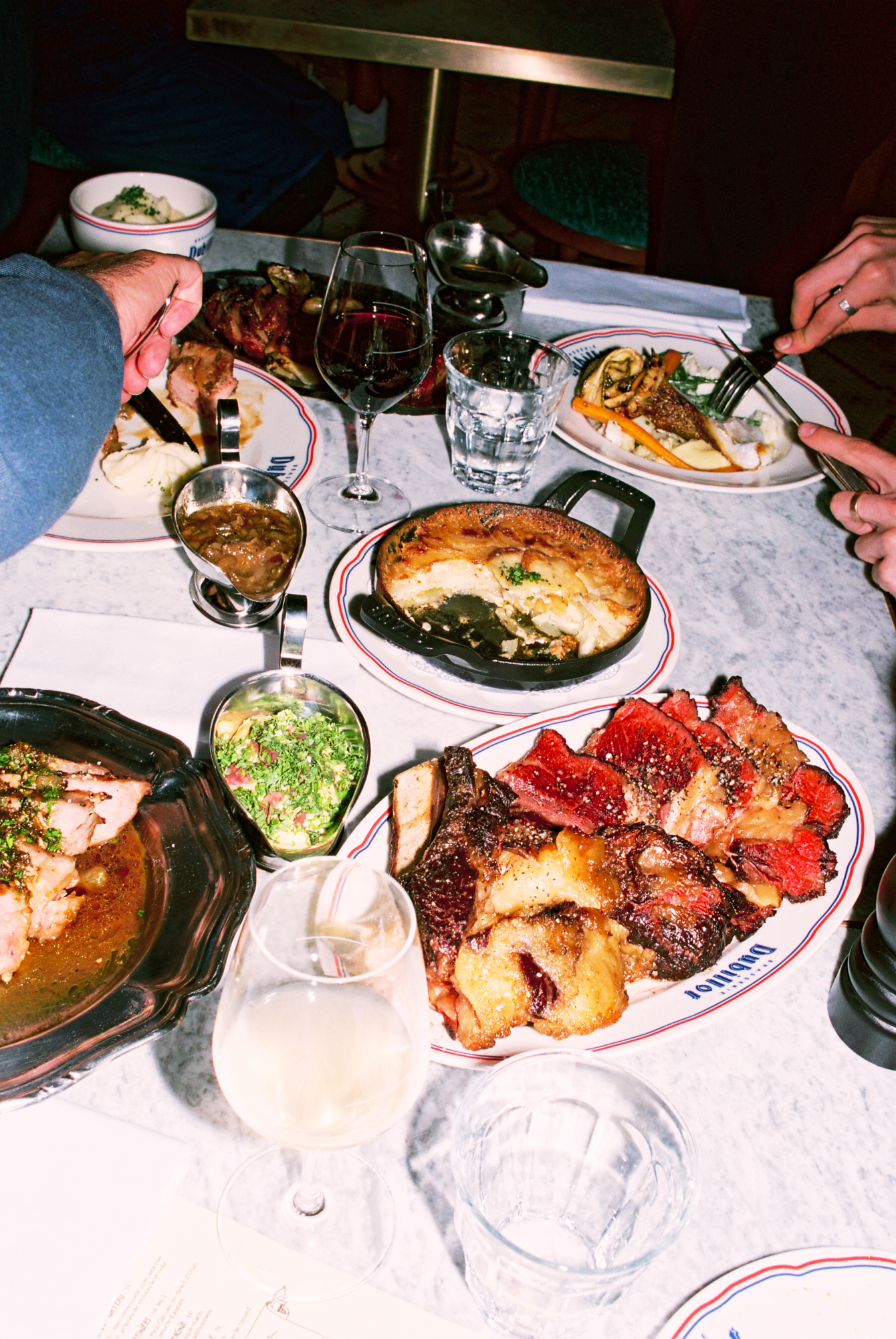 Si le lieu pousse tant à la frénésie, c’est à cause — ou plutôt grâce — à la cuisine au charbon de bois qui officie derrière les fourneaux, et qui répand allègrement ses divines effluves. Le barbecue de Dubillot s’impose sans crier gare comme l’une des pièces maitresses de la maison. À tester absolument, la côte de boeuf de Salers à la braise (35€/pers), bien maturée, servie avec un généreux gratin dauphinois dans un plat en fonte. L’épaule d’agneau (30€/pers), confite toute une nuit durant puis rôtie à la braise comme les grands-pères savent le faire, est elle aussi à se damner.