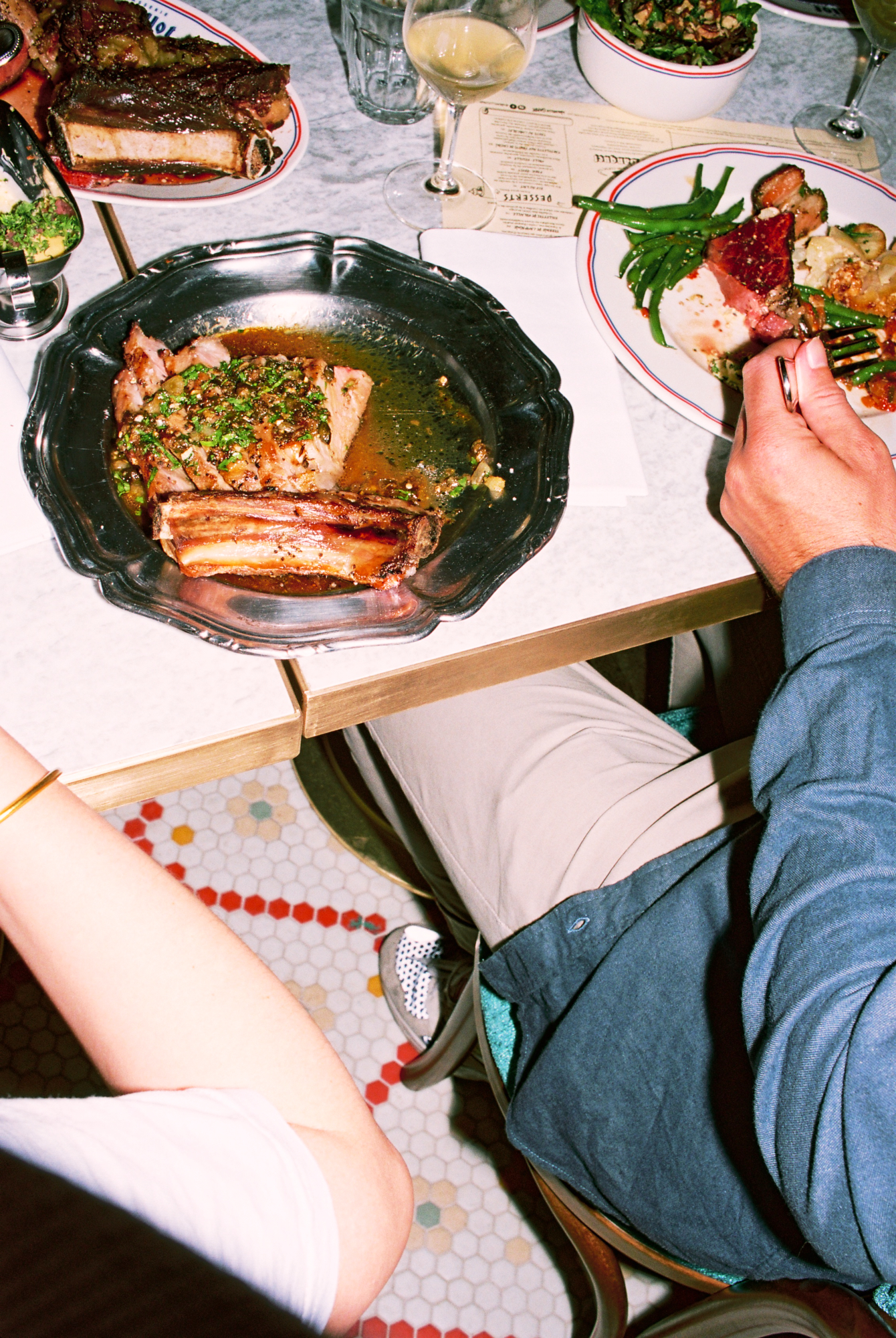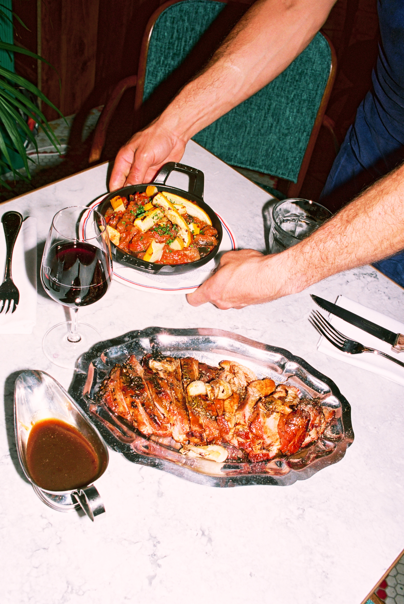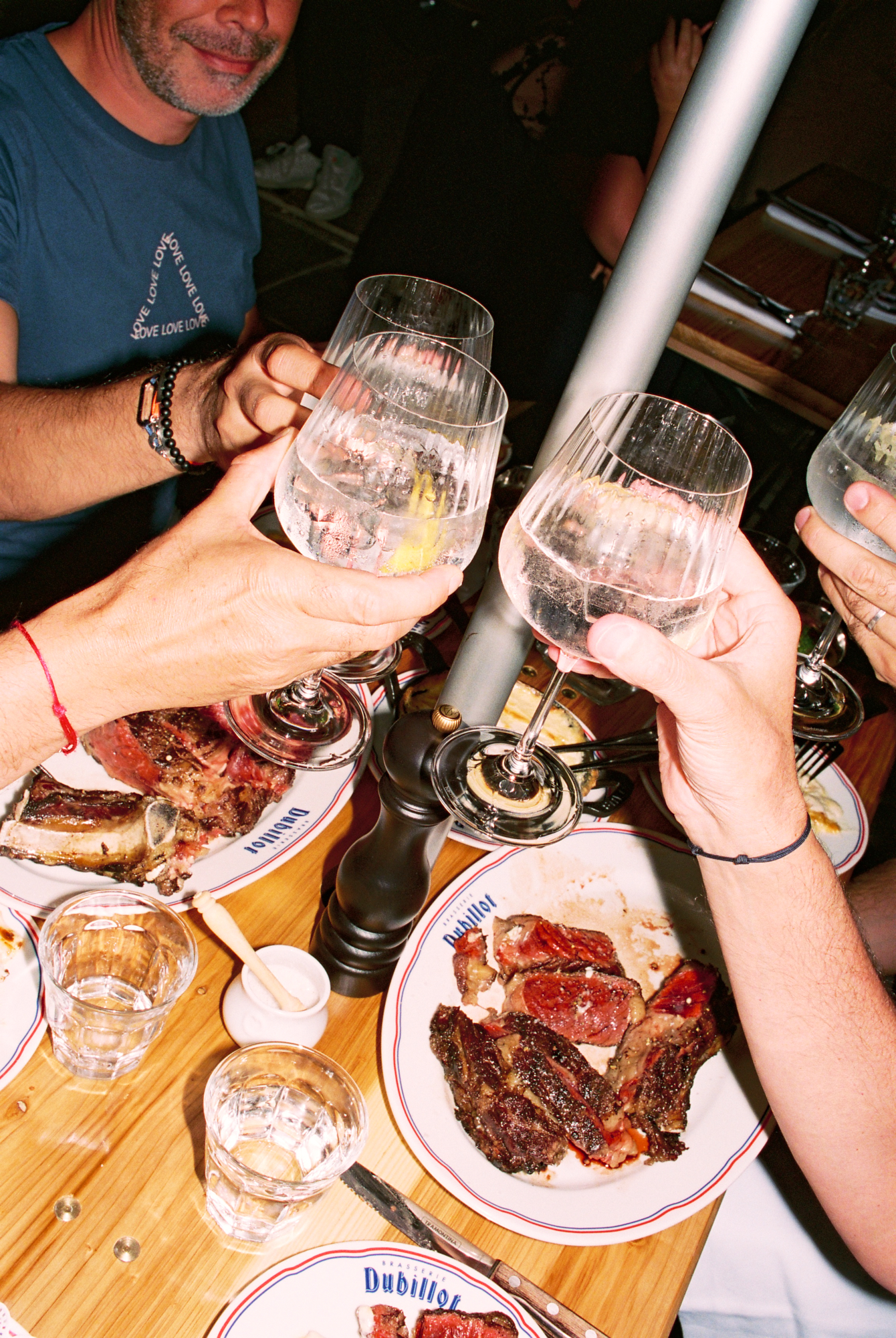 Si le lieu pousse tant à la frénésie, c’est à cause — ou plutôt grâce — à la cuisine au charbon de bois qui officie derrière les fourneaux, et qui répand allègrement ses divines effluves. Le barbecue de Dubillot s’impose sans crier gare comme l’une des pièces maitresses de la maison. À tester absolument, la côte de boeuf de Salers à la braise (35€/pers), bien maturée, servie avec un généreux gratin dauphinois dans un plat en fonte. L’épaule d’agneau (30€/pers), confite toute une nuit durant puis rôtie à la braise comme les grands-pères savent le faire, est elle aussi à se damner.