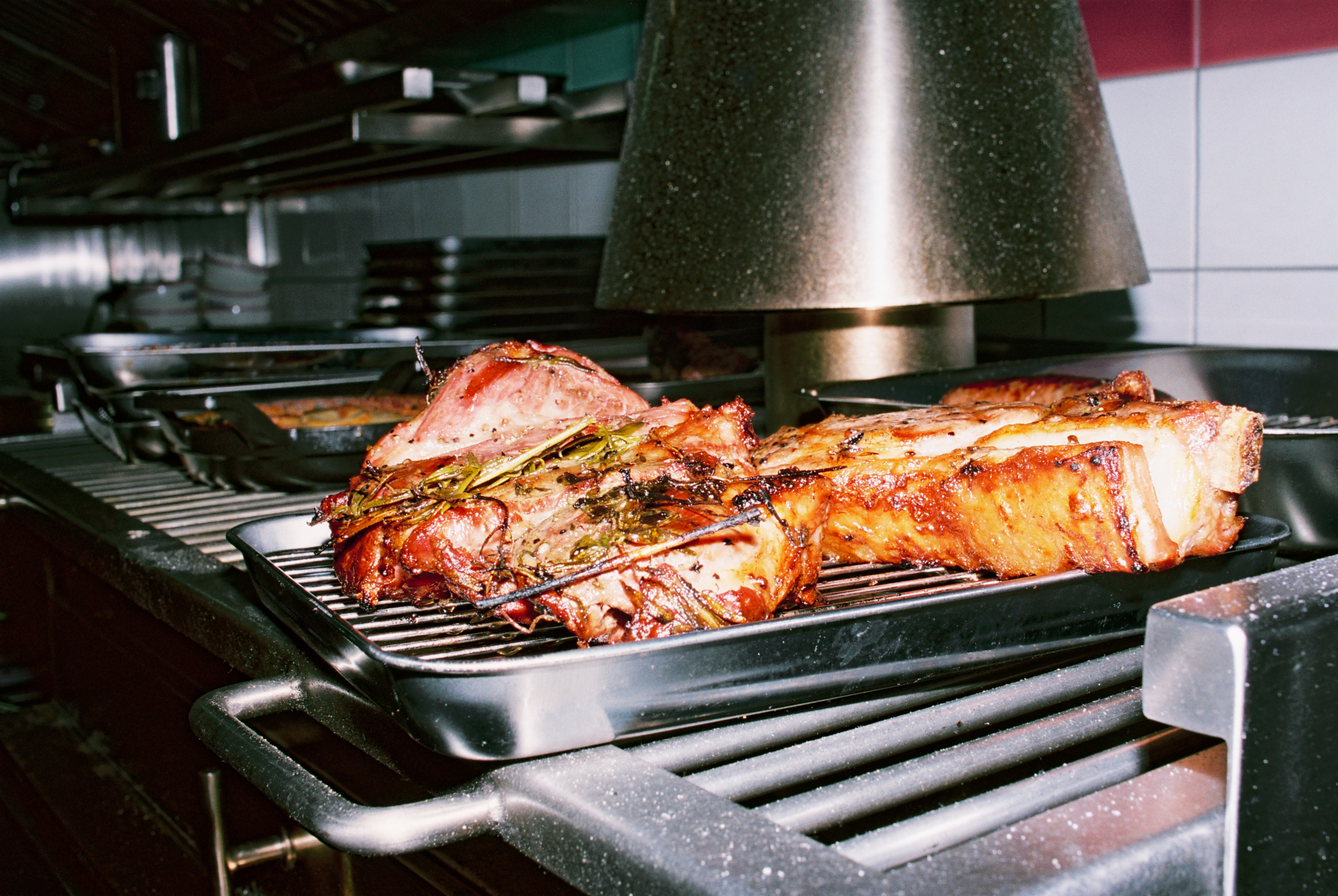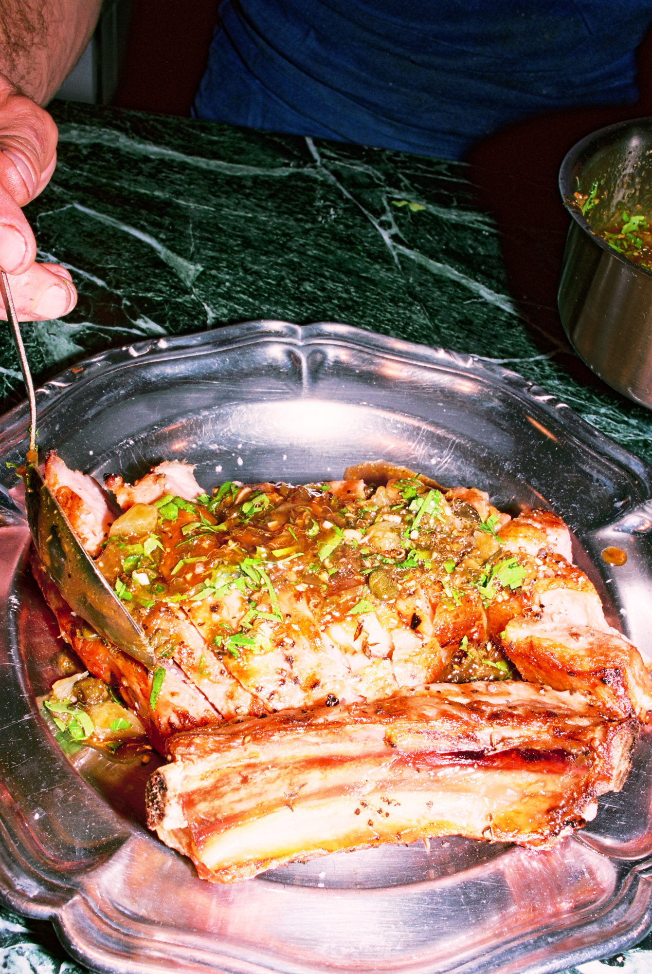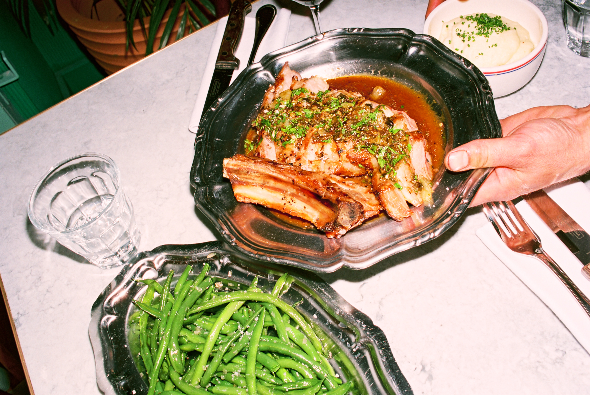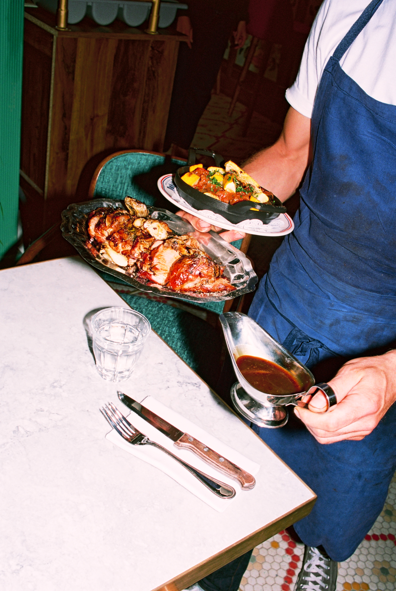 Si le lieu pousse tant à la frénésie, c’est à cause — ou plutôt grâce — à la cuisine au charbon de bois qui officie derrière les fourneaux, et qui répand allègrement ses divines effluves. Le barbecue de Dubillot s’impose sans crier gare comme l’une des pièces maitresses de la maison. À tester absolument, la côte de boeuf de Salers à la braise (35€/pers), bien maturée, servie avec un généreux gratin dauphinois dans un plat en fonte. L’épaule d’agneau (30€/pers), confite toute une nuit durant puis rôtie à la braise comme les grands-pères savent le faire, est elle aussi à se damner.