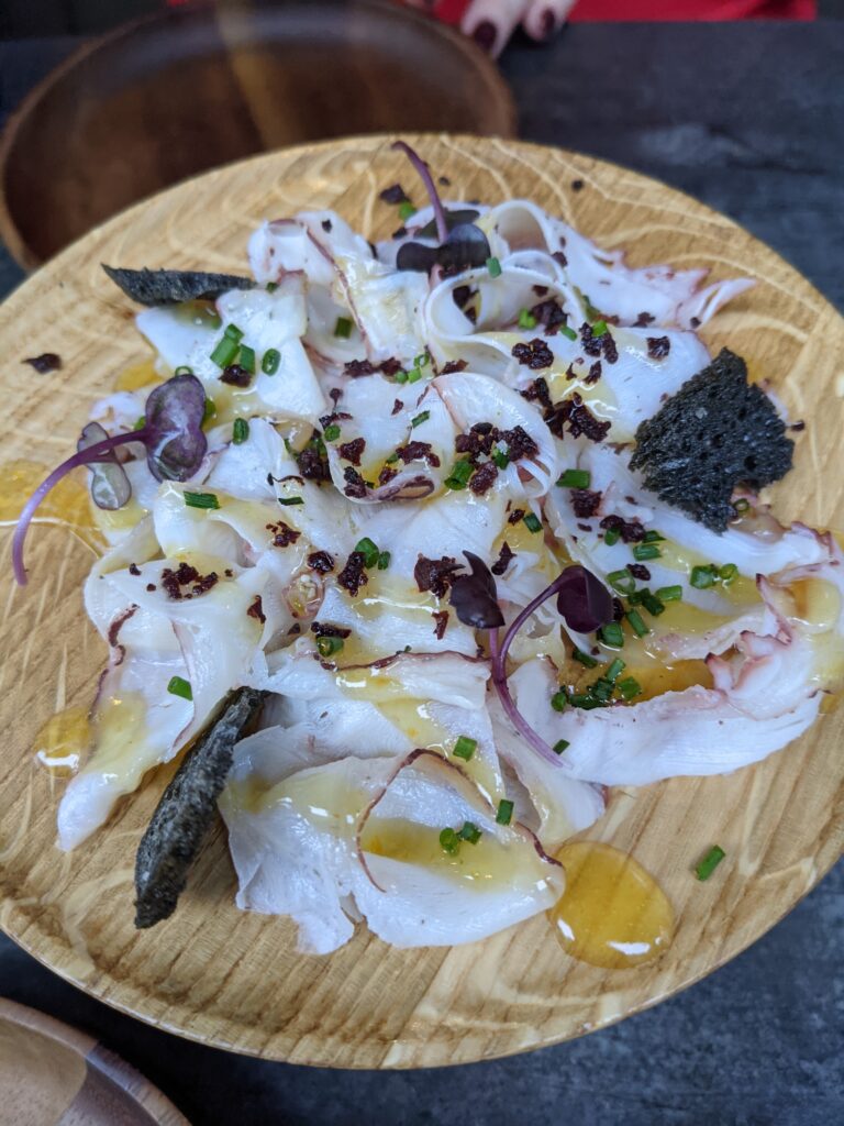 Le Crom’exquis de cochon, dans l’esprit de la Croquetas de jamon, la fameuse spécialité espagnole revisitée à la française avec une salade de champignons à cru et un cappuccino de cochon