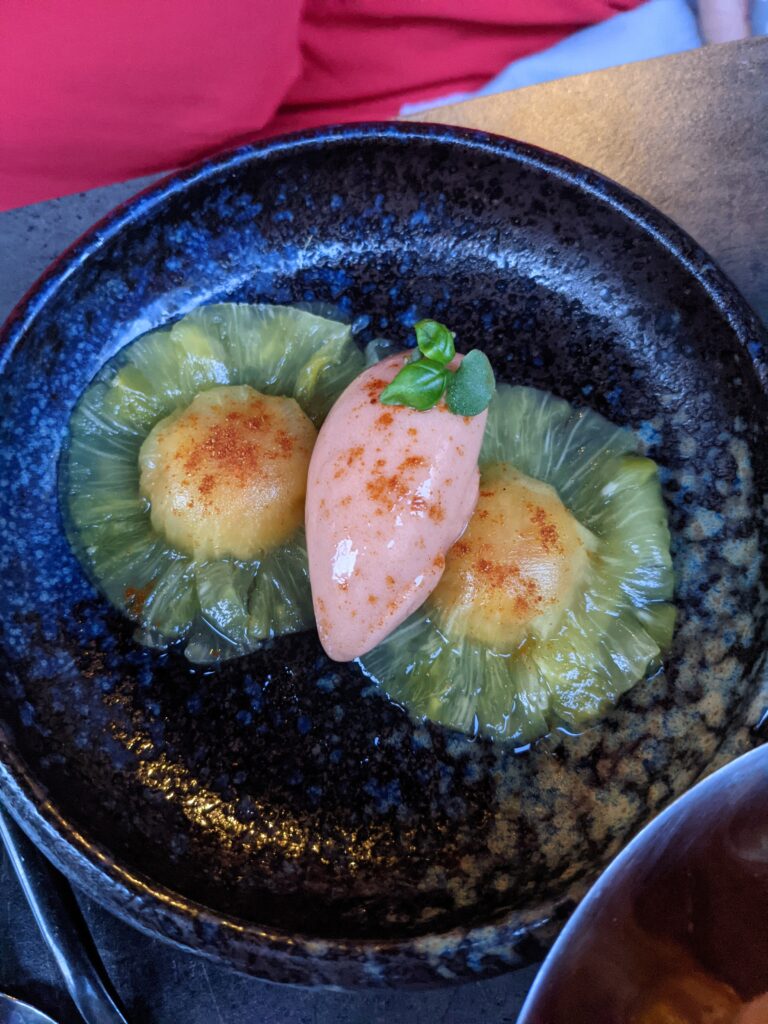 La Raviole d’ananas, 100% ananas, épicée avec gingembre, citronnelle, piment d’Espelette et servie avec un sorbet fraise des bois