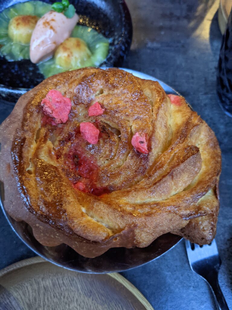 Les Roll de cabillaud, mayonnaise au curry, pickels de papaye verte… Le roll est à la base un pain, non pas brioché car trop sucré mais dans l’esprit du pain babka, moins sucré et plus savoureux. Il est fourni frais par la boulangerie voisine.
