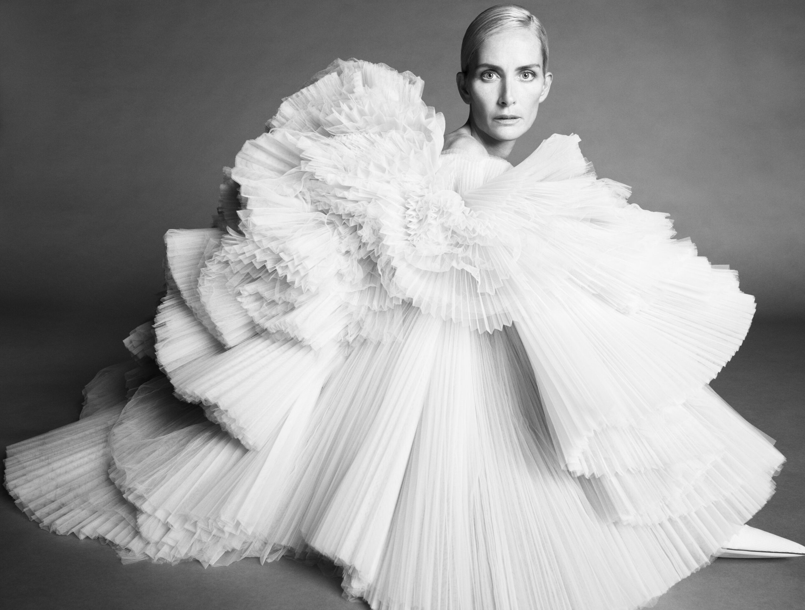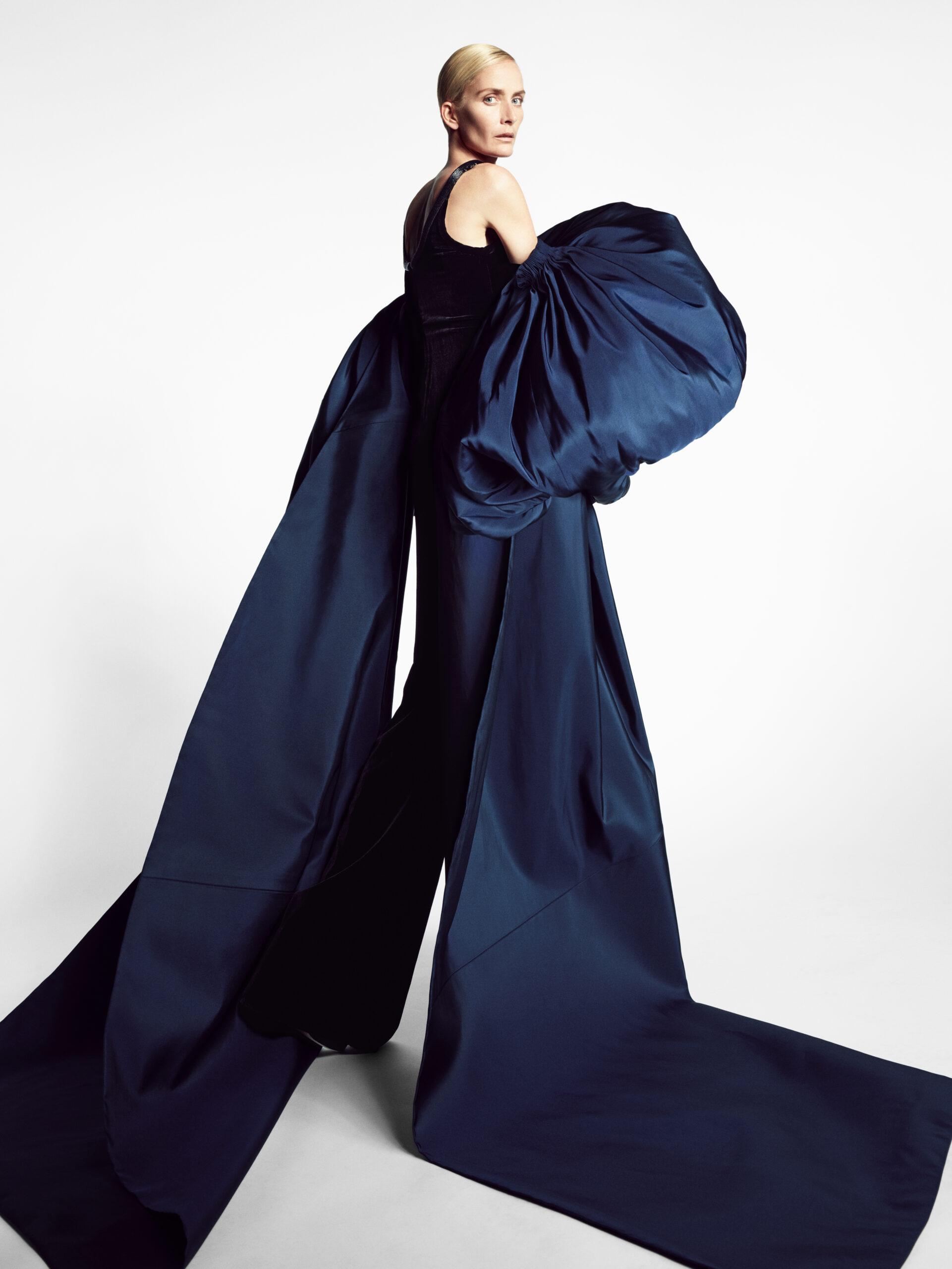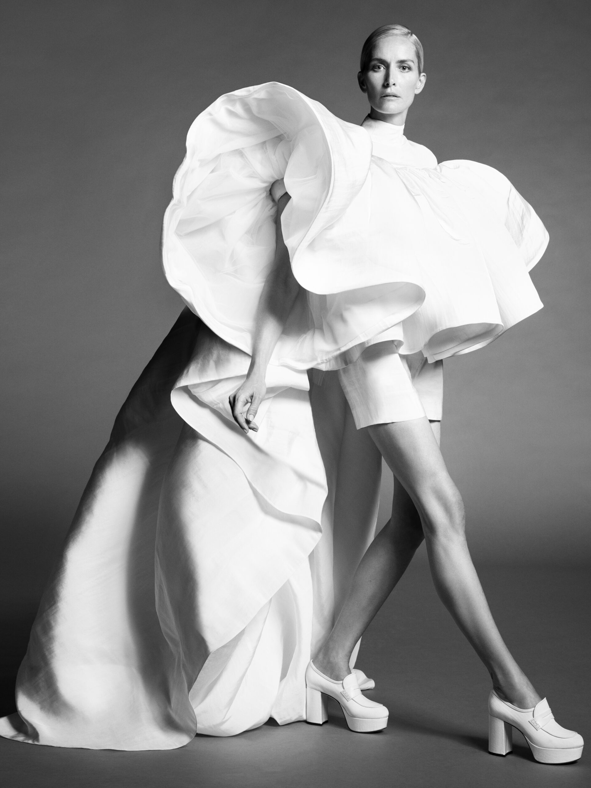In our work, finding her is a process. With the clarify afforded by the echo-chamber emptiness of the moment, our gaze turned inwards – to the history of couture, to our own history – looking for the source of in- spiration. To the idea of a muse.