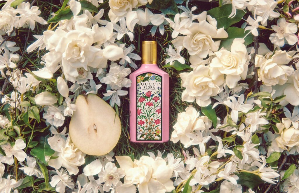 Flora Gorgeous Gardenia est logé dans un nouveau flacon oblong. Son verre rose laqué et son cabochon doré scintillant en font un véritable objet enchanteur. L’emblématique motif Flora de la Maison vient s’y ajouter : repensé par Alessandro Michele, il est un élément caractéristique de l’identité de la marque, une peinture de fleurs colorées créée par l’artiste Vittorio Accornero pour Gucci en 1966. Le flacon et la boîte en carton côtelé sophistiqué présentent tous deux des déclinaisons de ce motif.