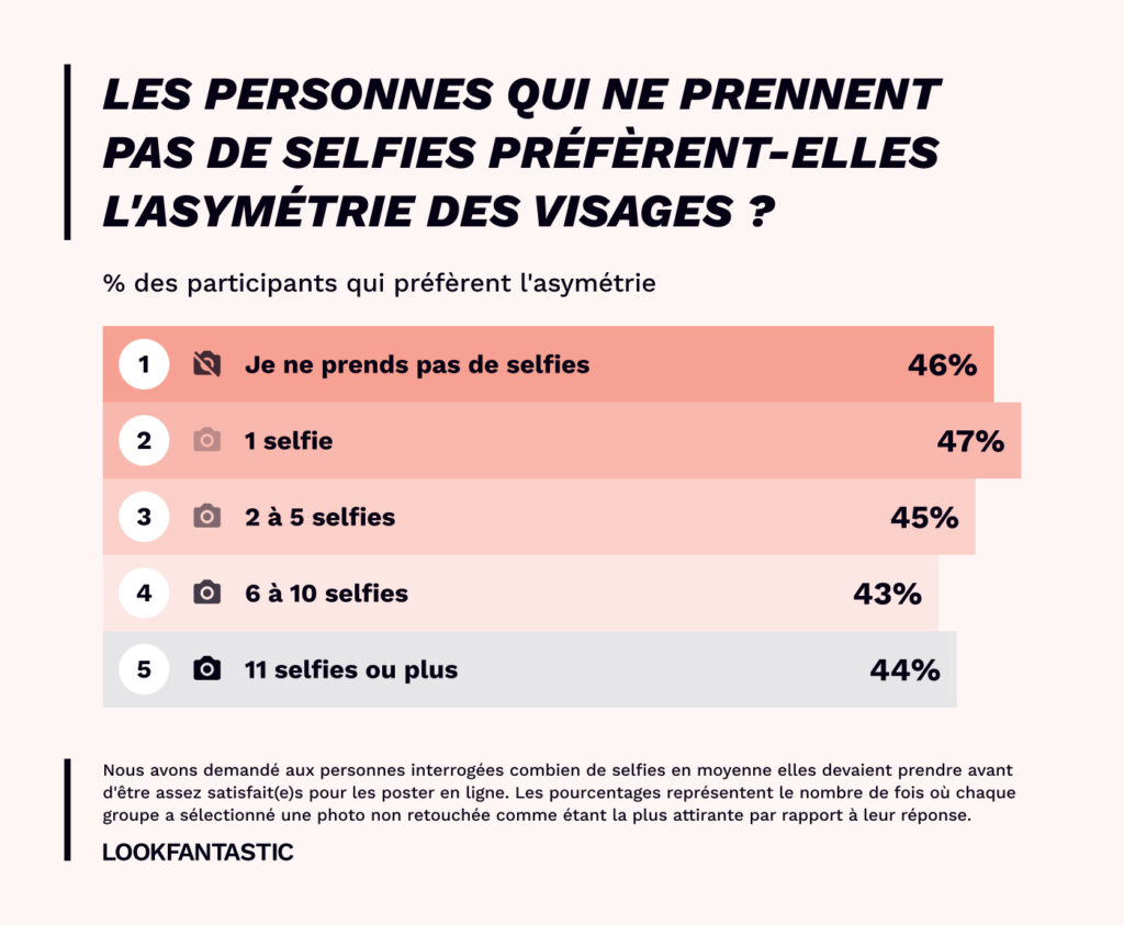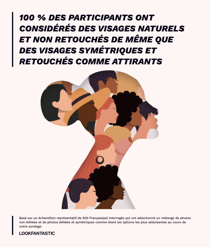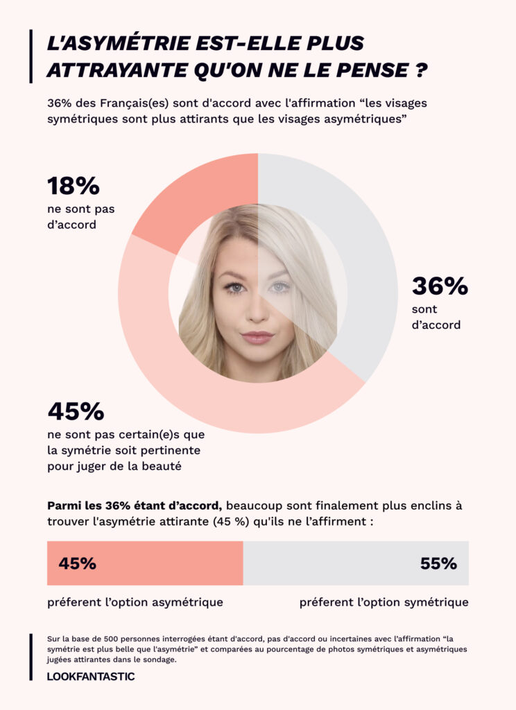 La plateforme de beauté en ligne Lookfantastic a demandé à un échantillon de français leur avis sur des photos de visages non retouchés et naturellement asymétriques par rapport à des visages retouchés et complètement symétriques afin de prouver que la beauté et l’attirance ne résident pas seulement dans une parfaite symétrie du visage. Chaque participant a également répondu à plusieurs questions à propos de leur usage des réseaux sociaux et leur vision de la beauté.