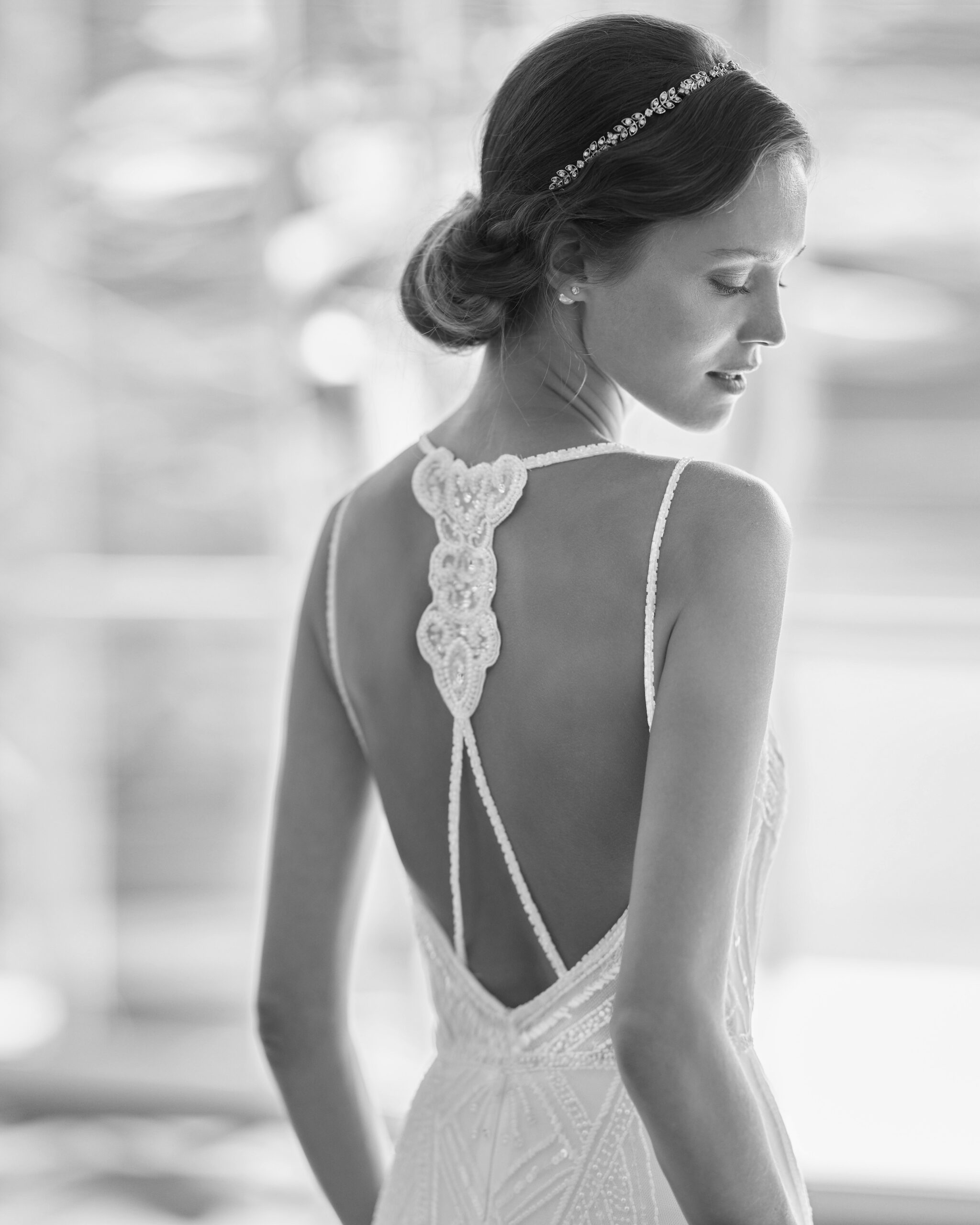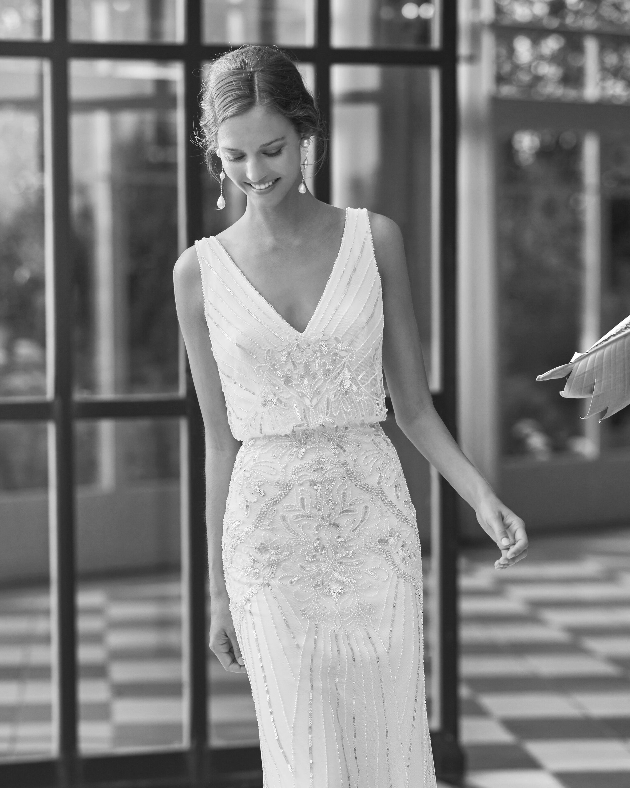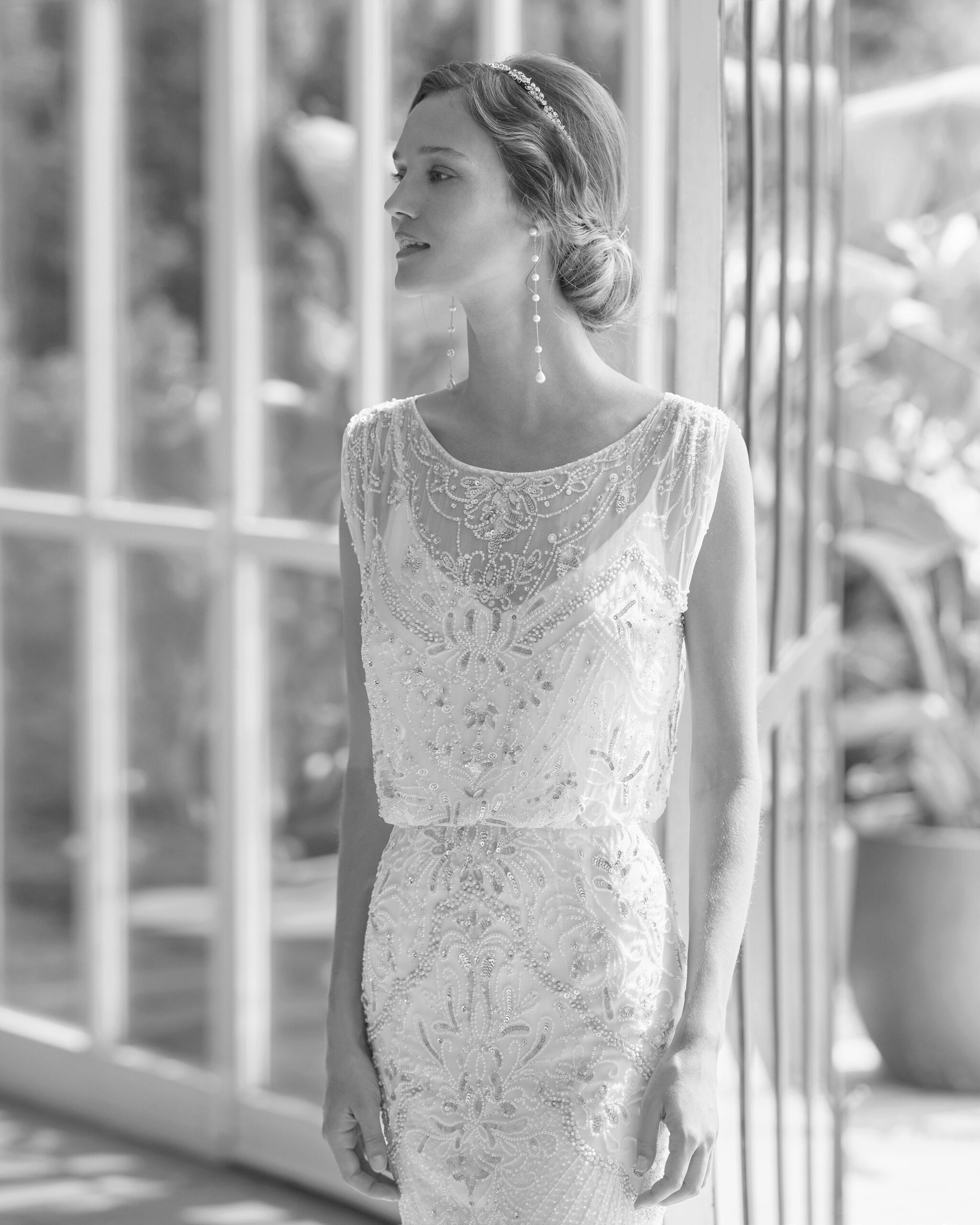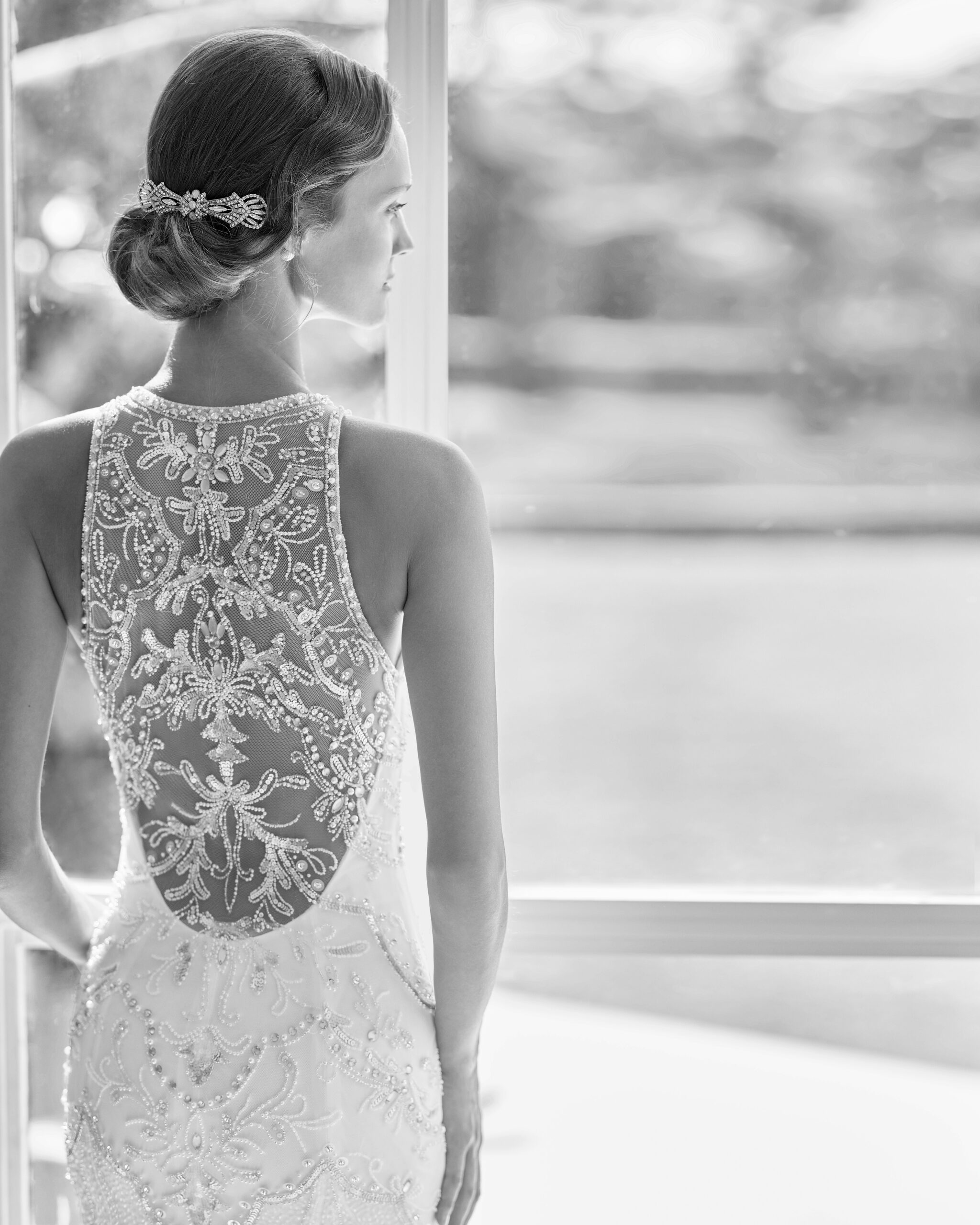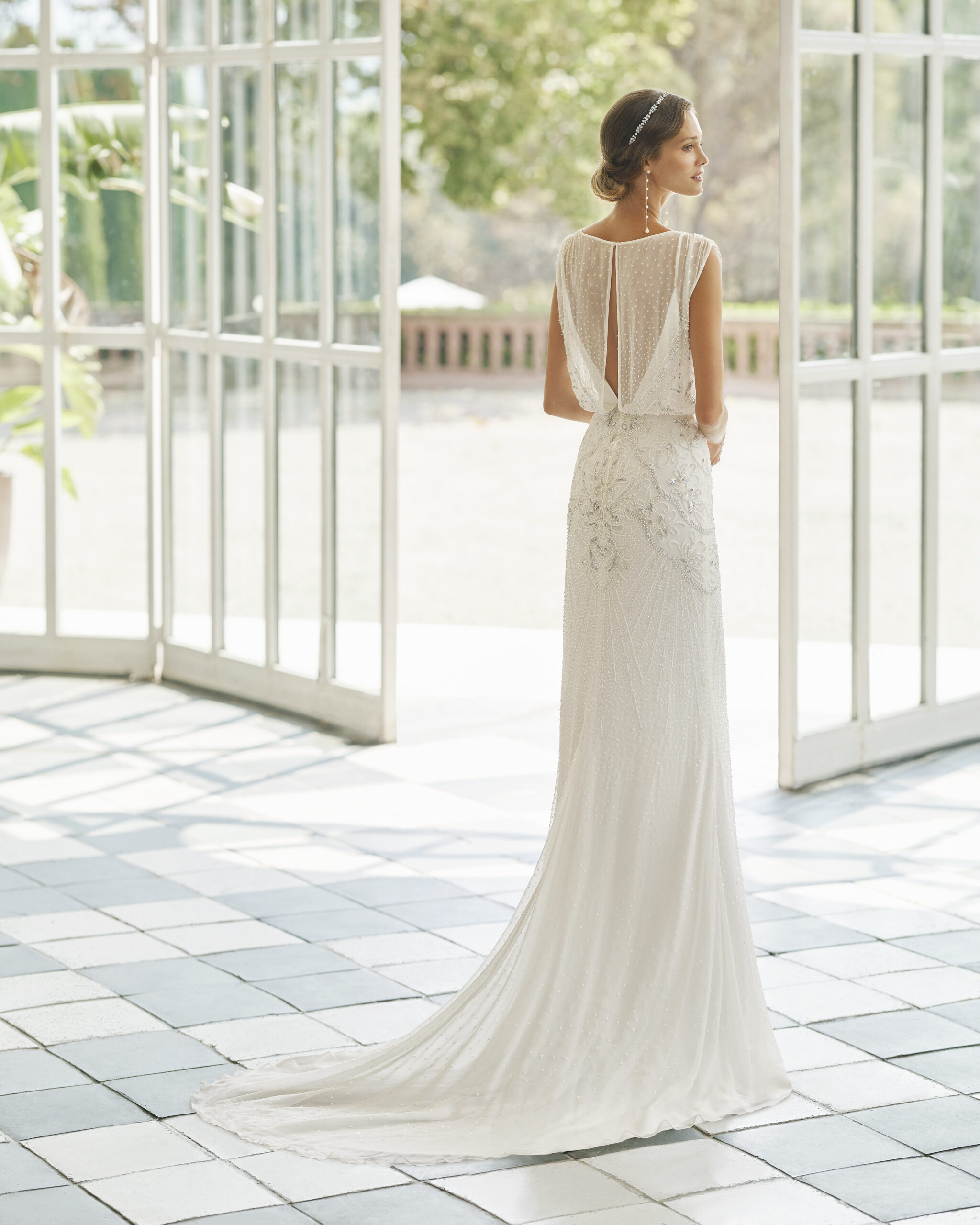 ROSA CLARÁ Gatsby s’inspire de ces looks et de la revisite qu’en a fait le film déjà culte « Gatsby le magnifique » de Baz Lurhmann pour présenter une collection de 13 robes de mariée qui modernisent cette esthétique pour les mariées d’aujourd’hui. C’est un style très demandé par les futures mariées qui se présentent chez ROSA CLARÁ, car les designs de pierreries linéaires à la touche Art Déco font depuis quelques années partie des emblèmes de la marque. C’est également l’un des styles préférés de la maison et de la designeuse Rosa Clará elle-même, qui portait une élégante robe ornée de détails de pierreries inspirée des années 30 à son propre mariage.