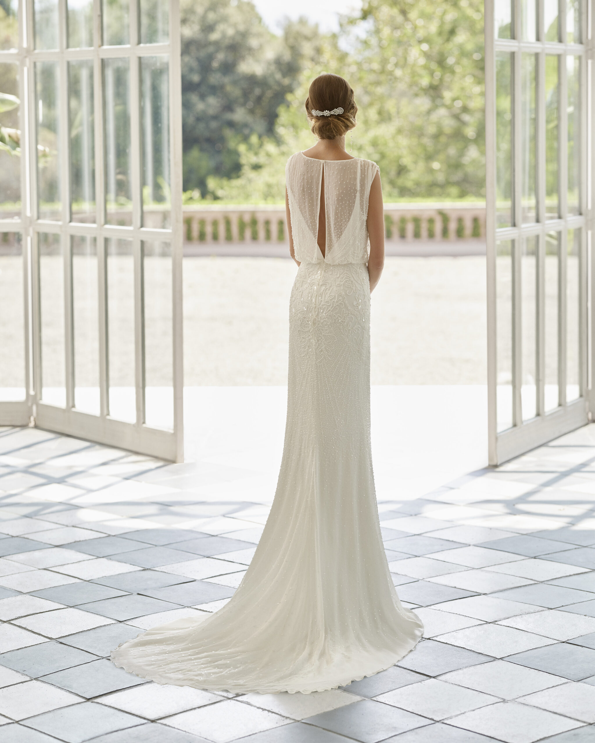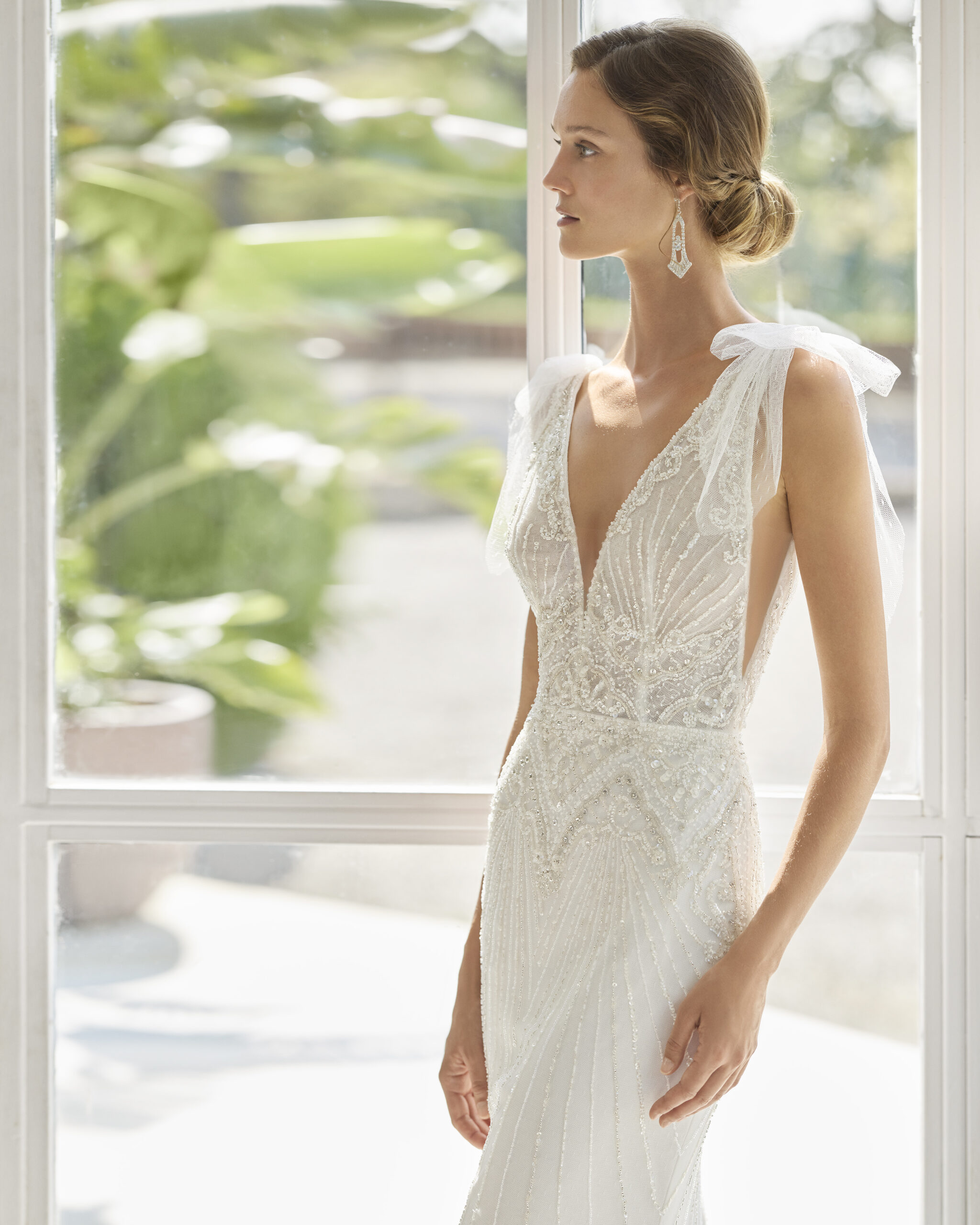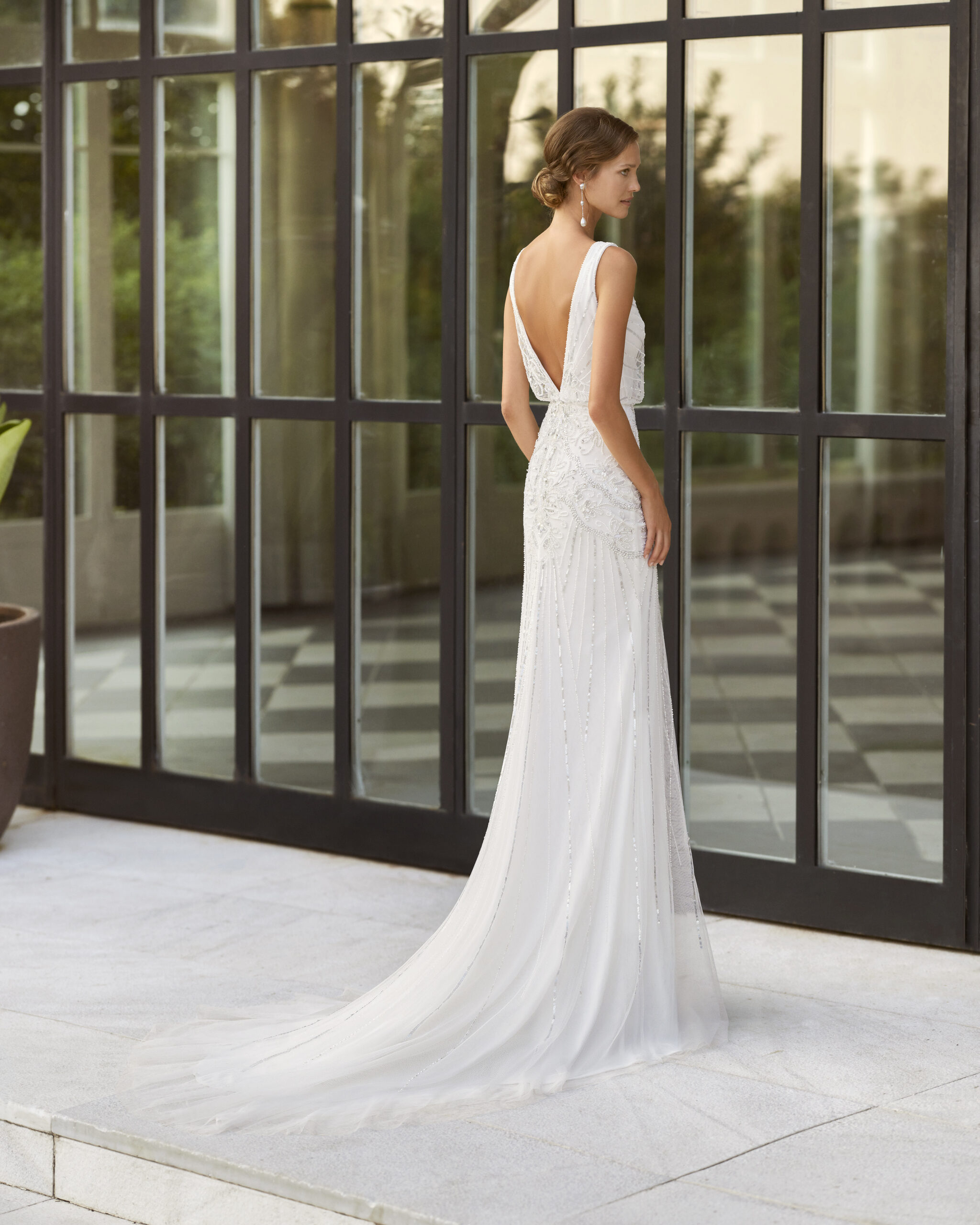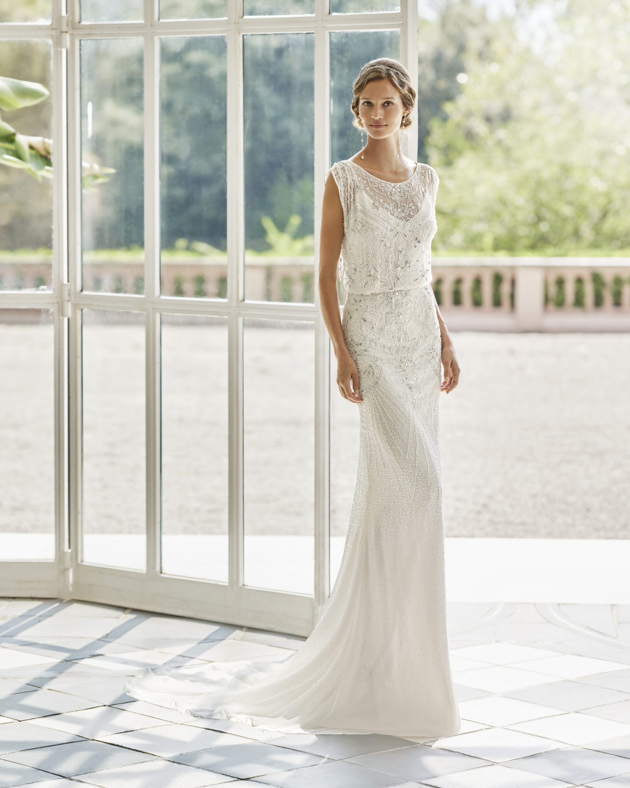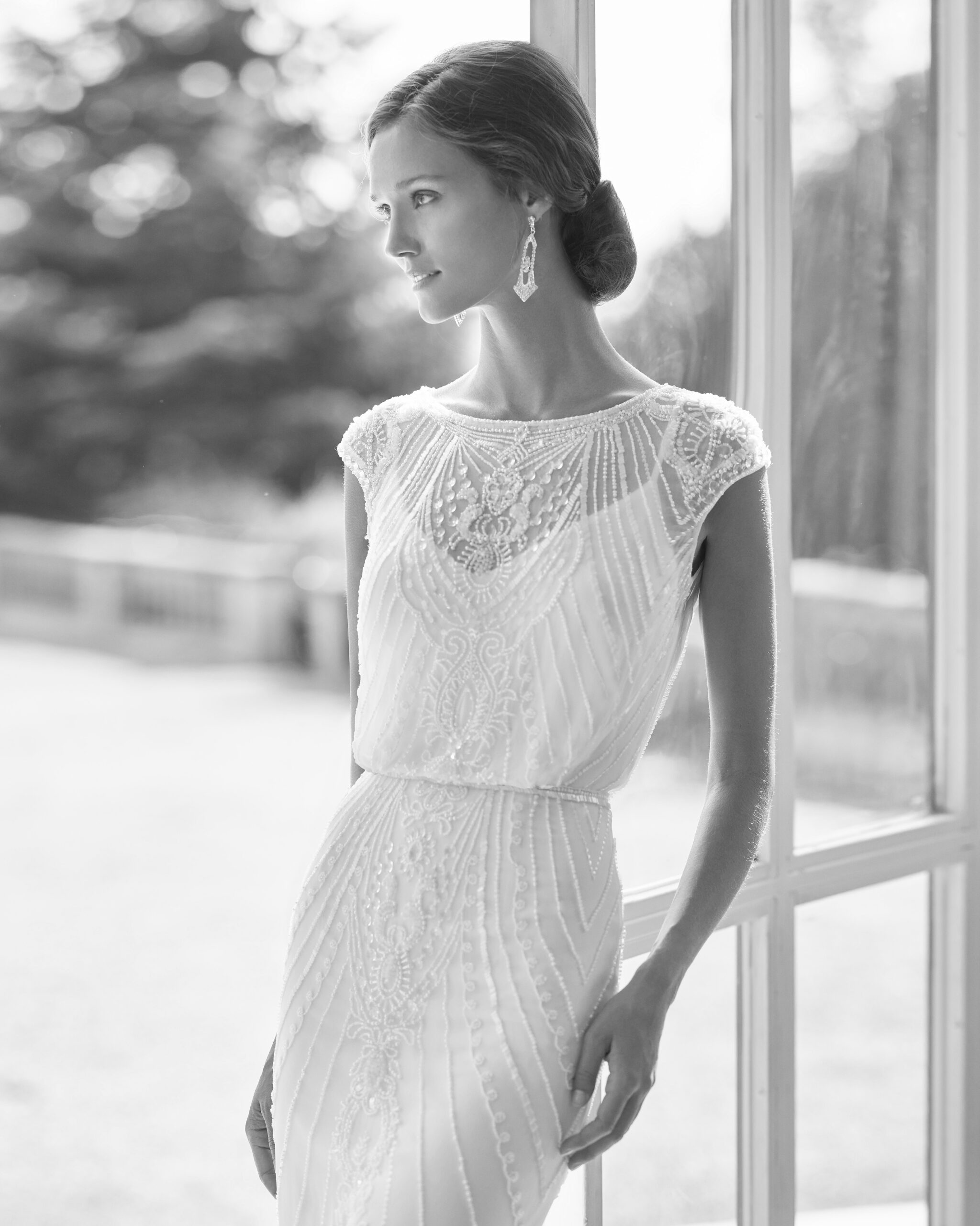 ROSA CLARÁ Gatsby s’inspire de ces looks et de la revisite qu’en a fait le film déjà culte « Gatsby le magnifique » de Baz Lurhmann pour présenter une collection de 13 robes de mariée qui modernisent cette esthétique pour les mariées d’aujourd’hui. C’est un style très demandé par les futures mariées qui se présentent chez ROSA CLARÁ, car les designs de pierreries linéaires à la touche Art Déco font depuis quelques années partie des emblèmes de la marque. C’est également l’un des styles préférés de la maison et de la designeuse Rosa Clará elle-même, qui portait une élégante robe ornée de détails de pierreries inspirée des années 30 à son propre mariage.