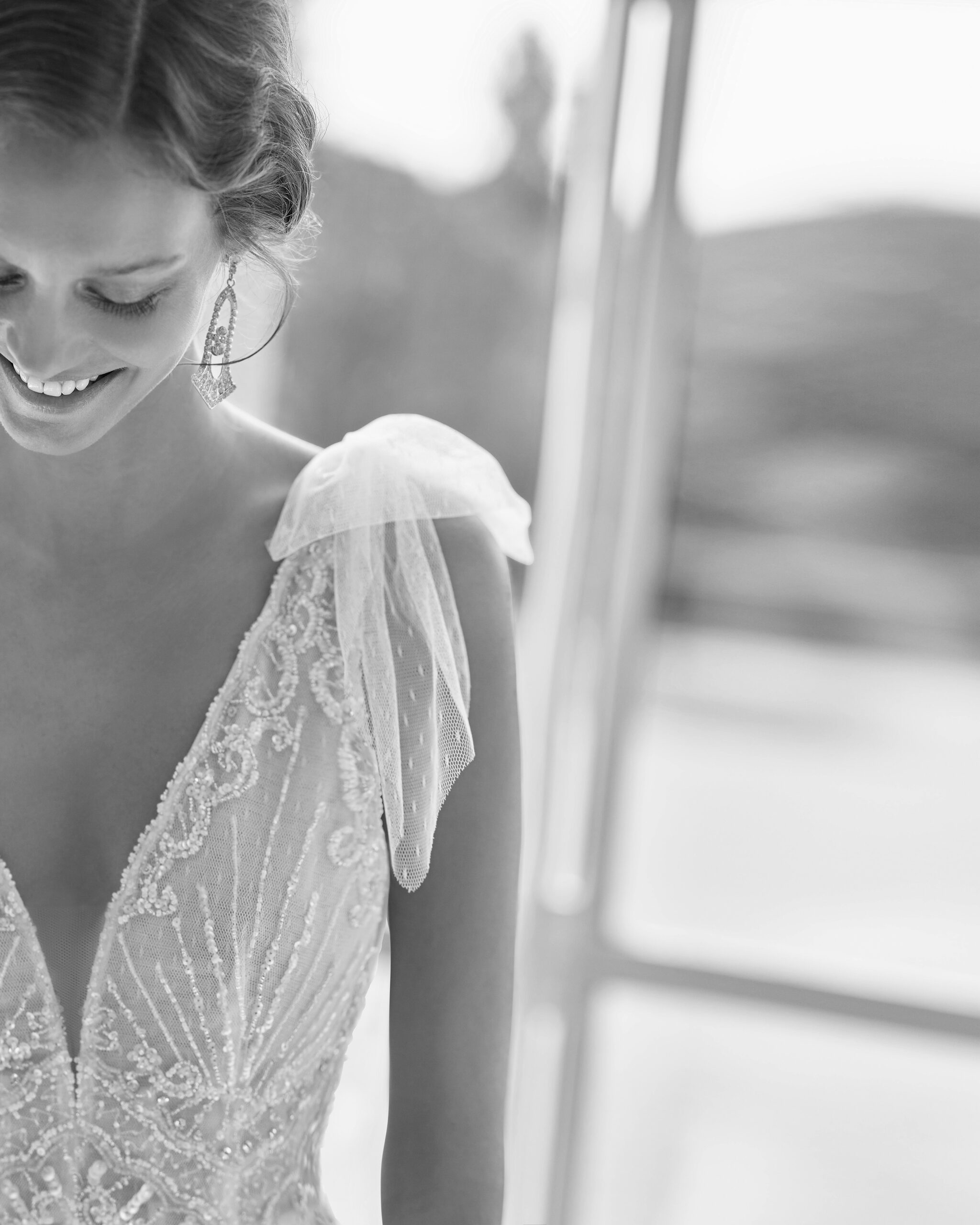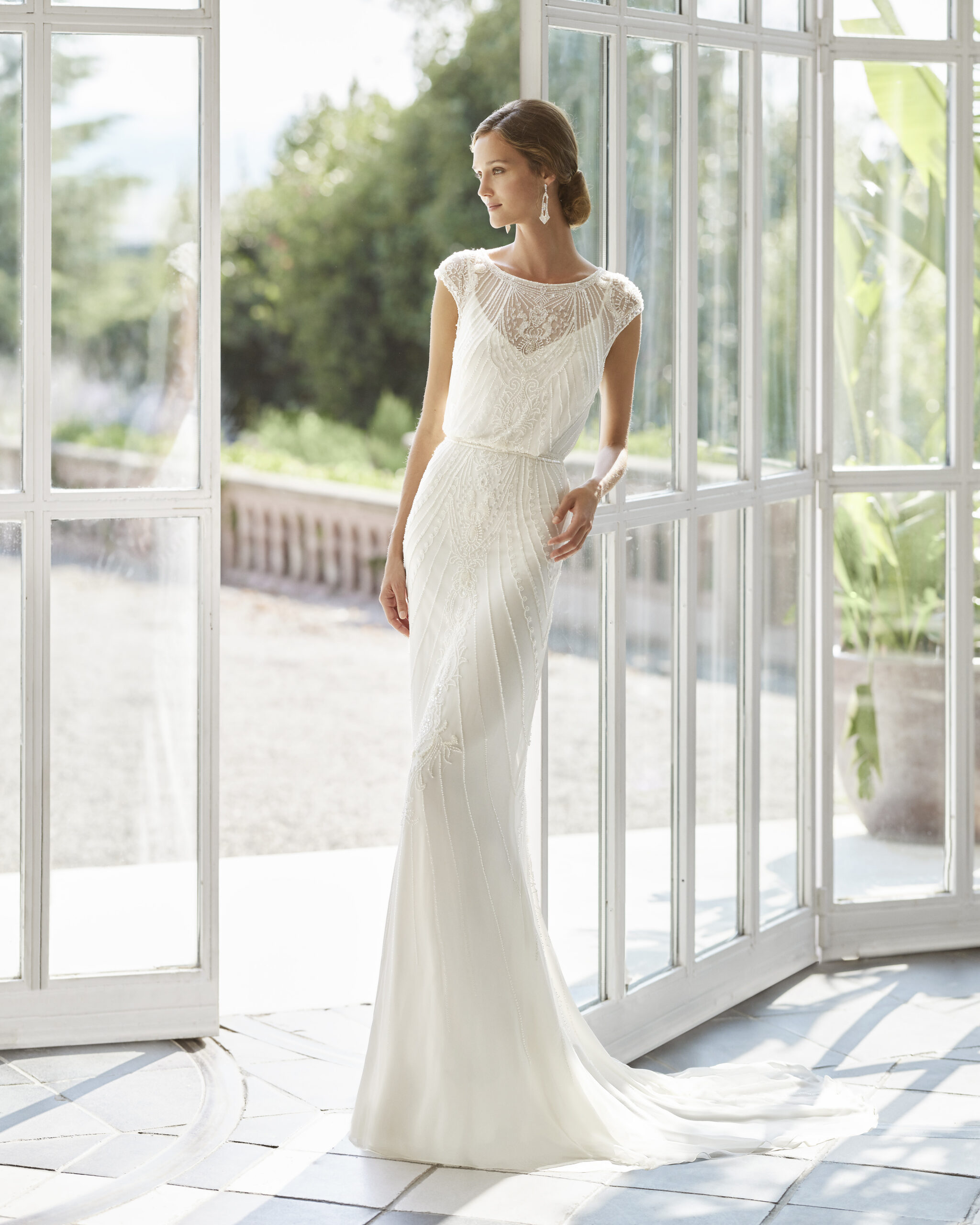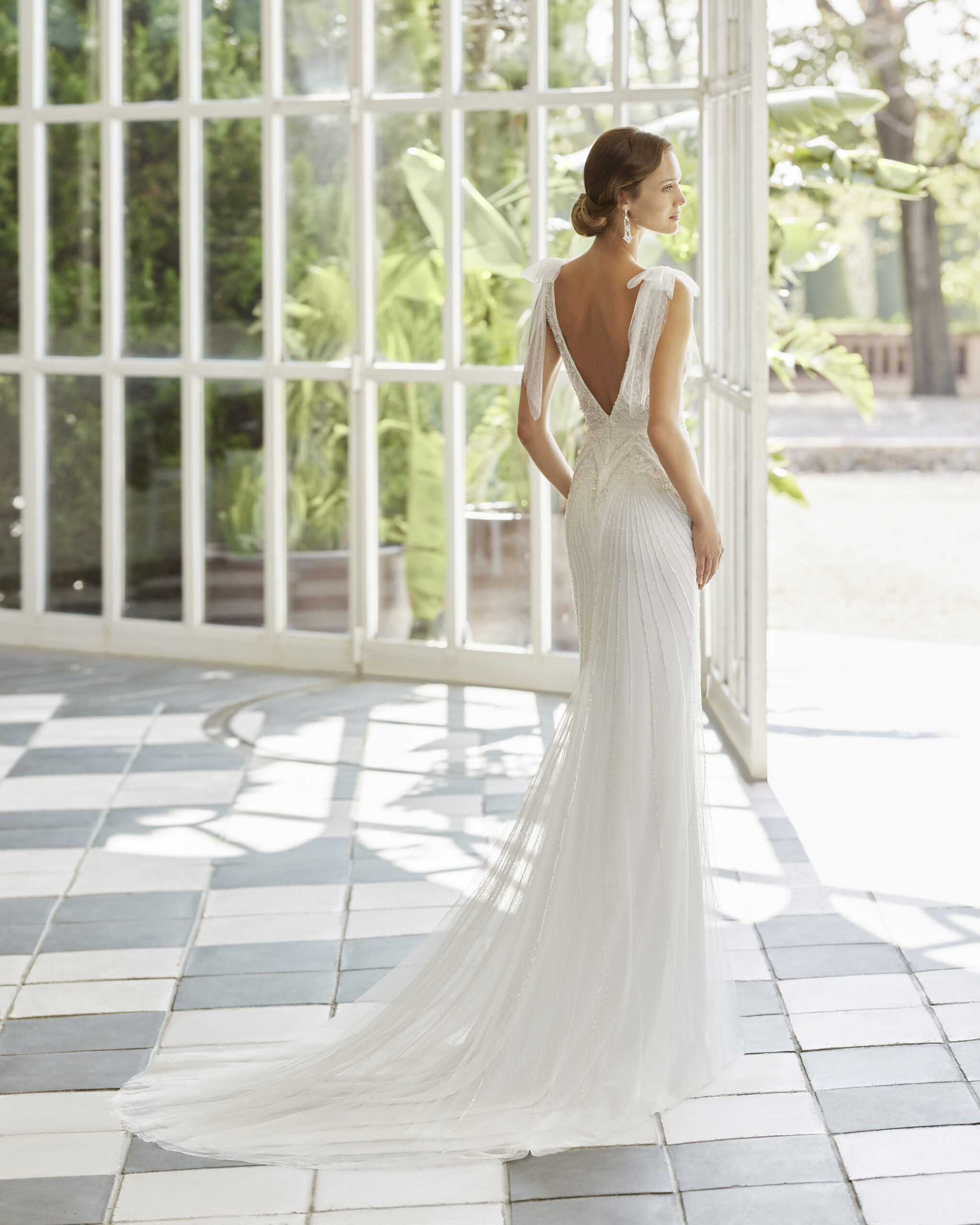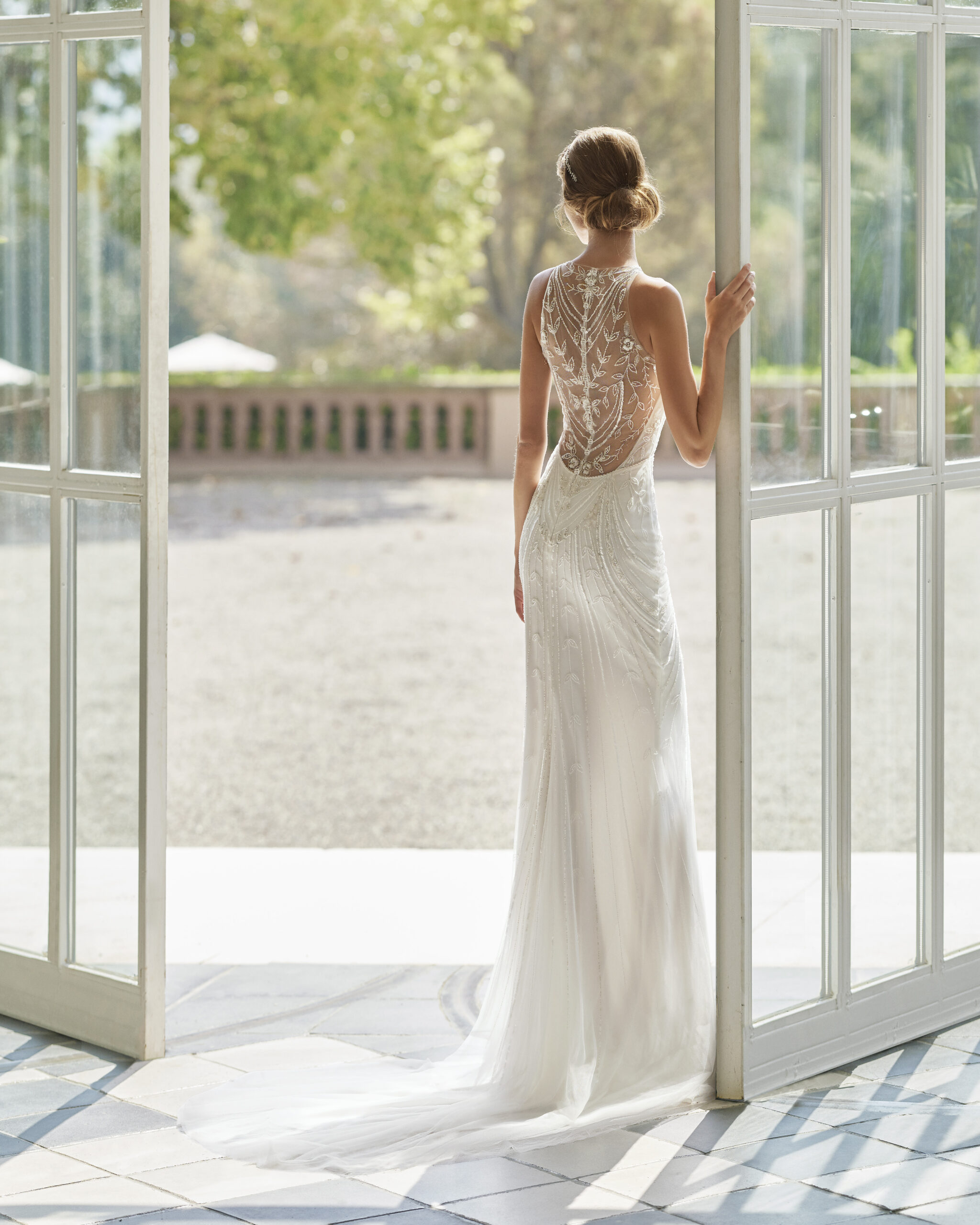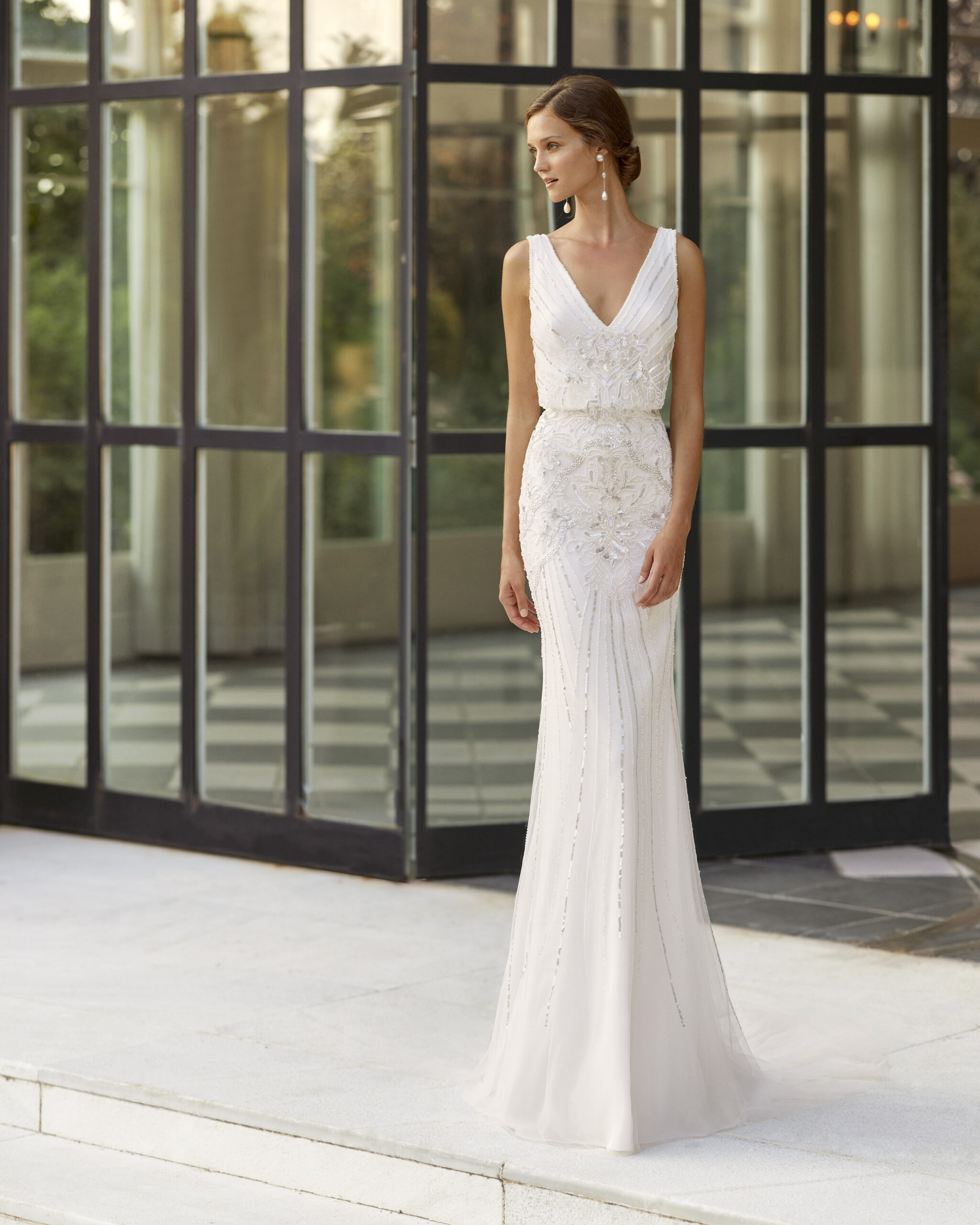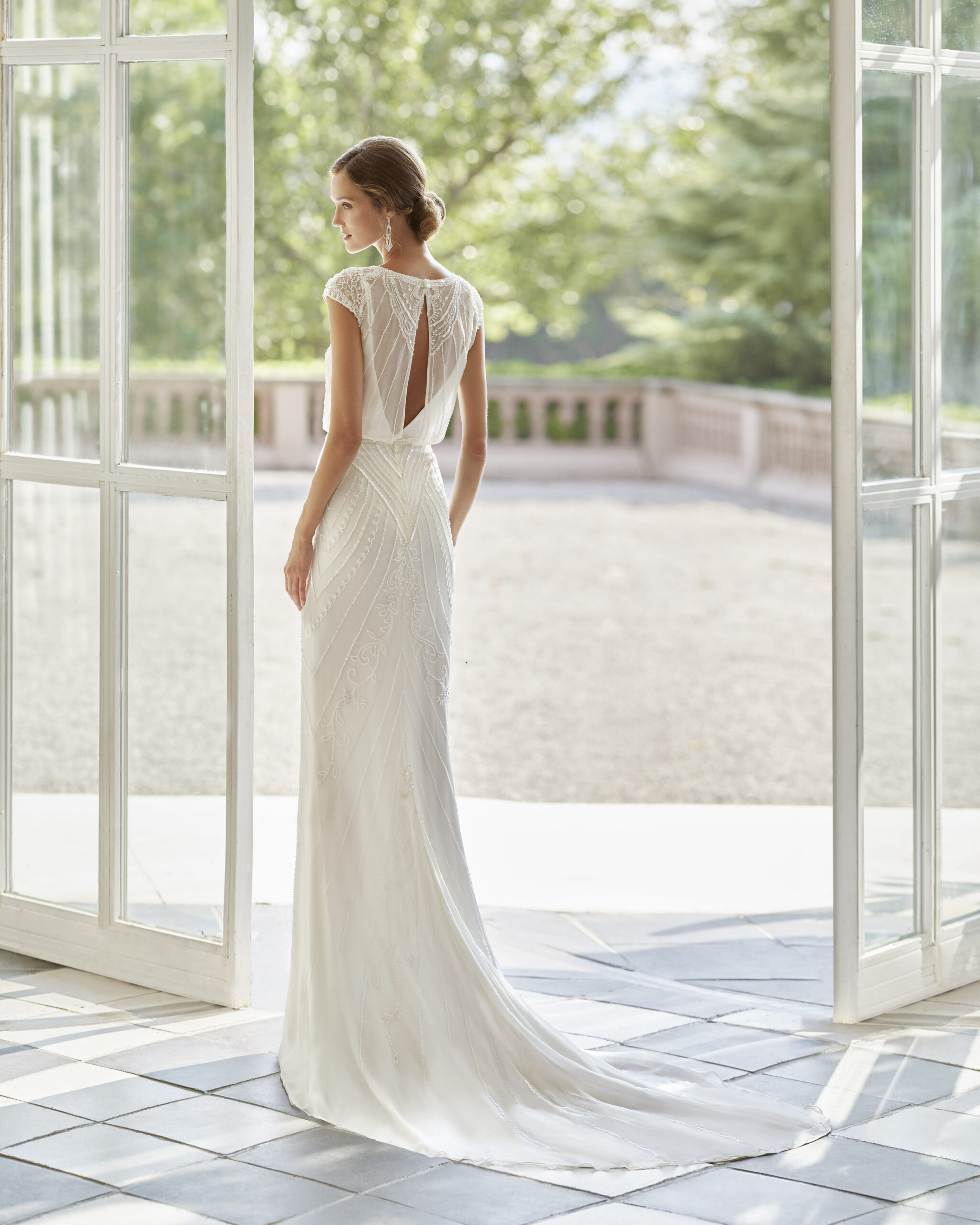 ROSA CLARÁ Gatsby s’inspire de ces looks et de la revisite qu’en a fait le film déjà culte « Gatsby le magnifique » de Baz Lurhmann pour présenter une collection de 13 robes de mariée qui modernisent cette esthétique pour les mariées d’aujourd’hui. C’est un style très demandé par les futures mariées qui se présentent chez ROSA CLARÁ, car les designs de pierreries linéaires à la touche Art Déco font depuis quelques années partie des emblèmes de la marque. C’est également l’un des styles préférés de la maison et de la designeuse Rosa Clará elle-même, qui portait une élégante robe ornée de détails de pierreries inspirée des années 30 à son propre mariage.
