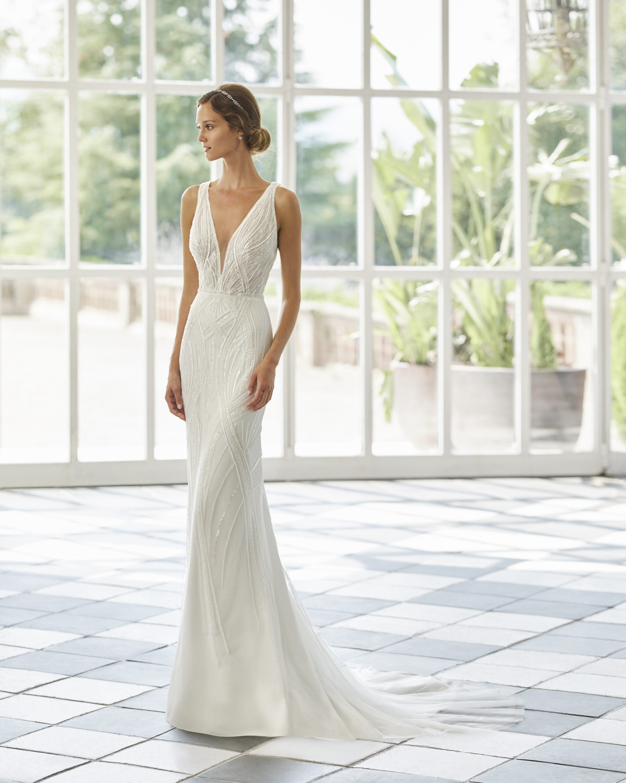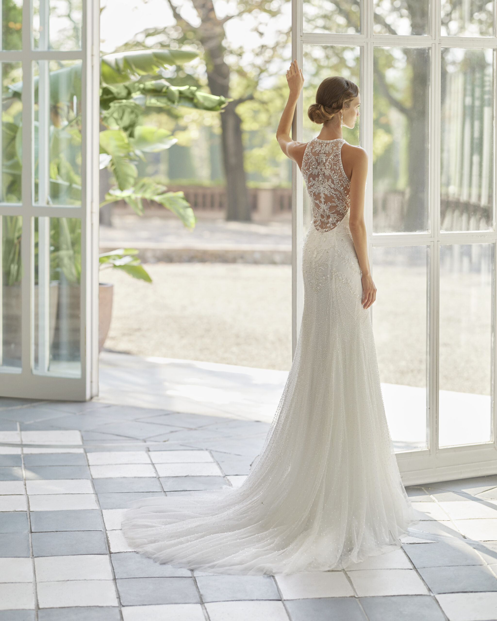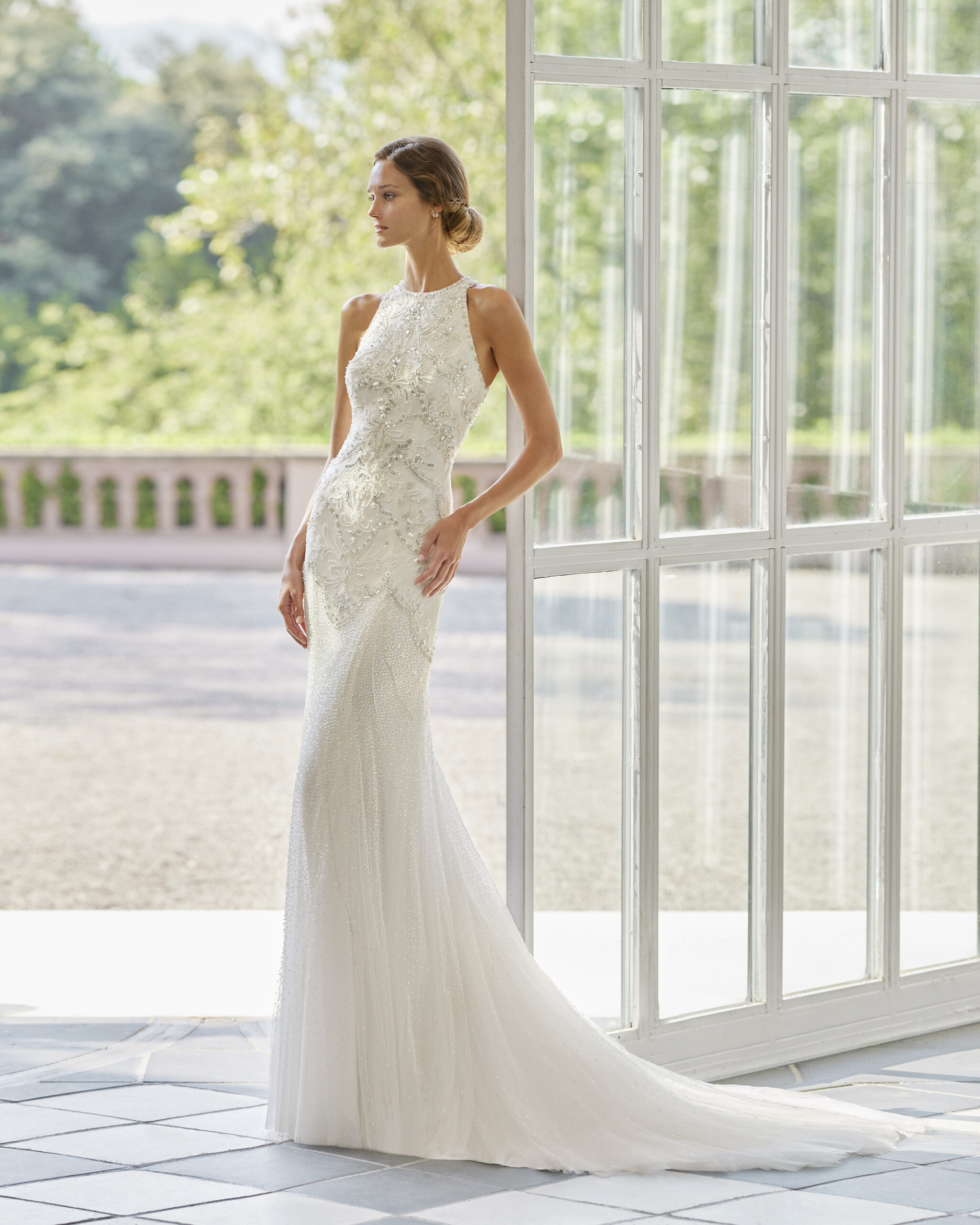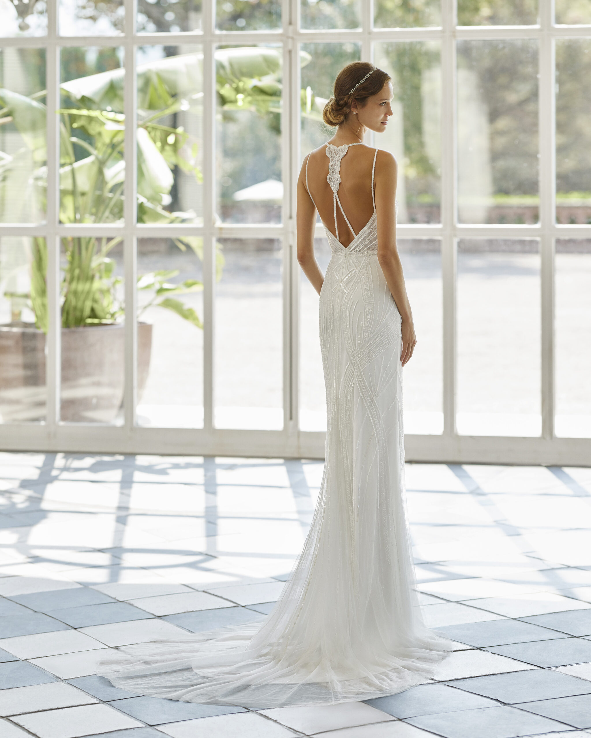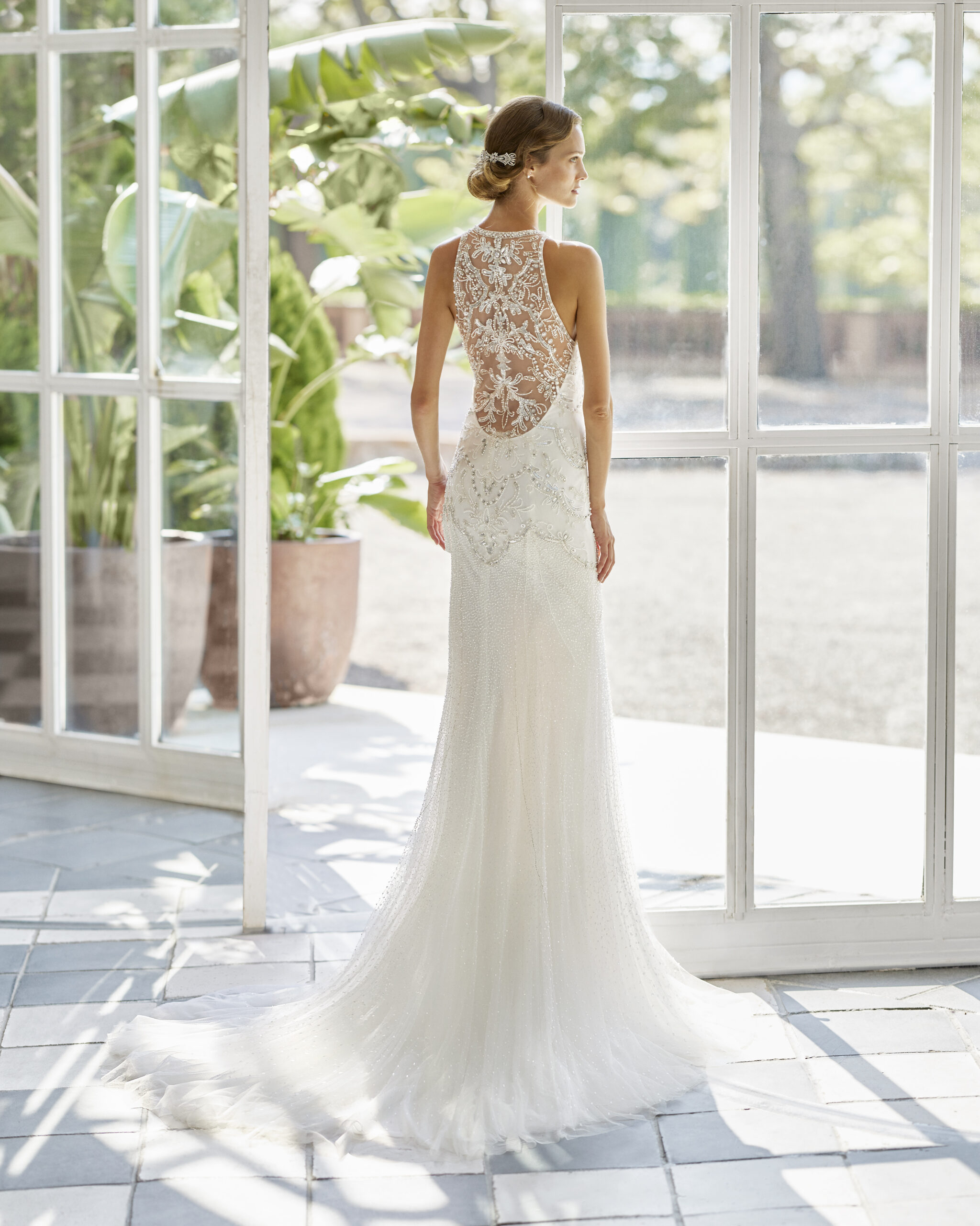 ROSA CLARÁ Gatsby s’inspire de ces looks et de la revisite qu’en a fait le film déjà culte « Gatsby le magnifique » de Baz Lurhmann pour présenter une collection de 13 robes de mariée qui modernisent cette esthétique pour les mariées d’aujourd’hui. C’est un style très demandé par les futures mariées qui se présentent chez ROSA CLARÁ, car les designs de pierreries linéaires à la touche Art Déco font depuis quelques années partie des emblèmes de la marque. C’est également l’un des styles préférés de la maison et de la designeuse Rosa Clará elle-même, qui portait une élégante robe ornée de détails de pierreries inspirée des années 30 à son propre mariage.
