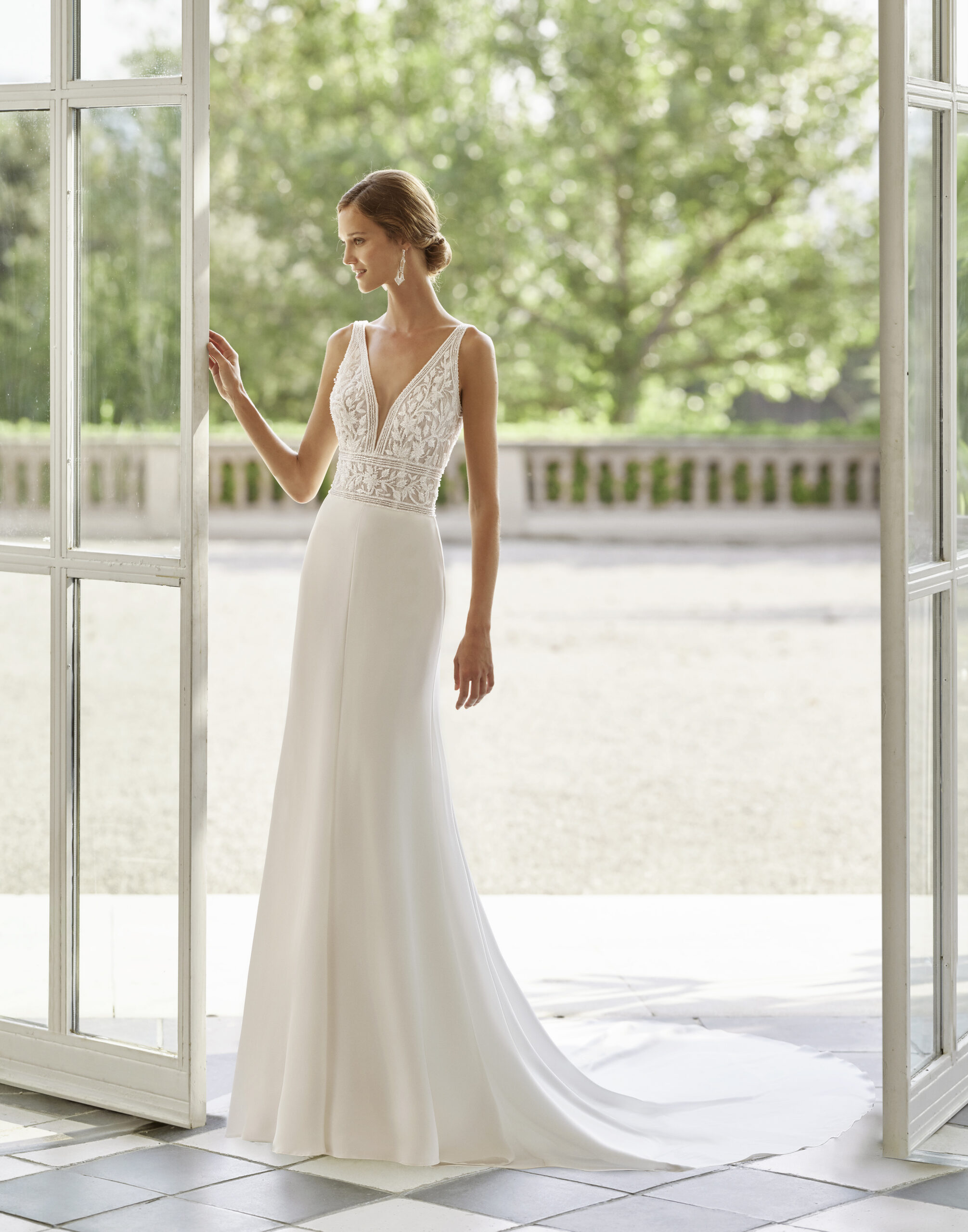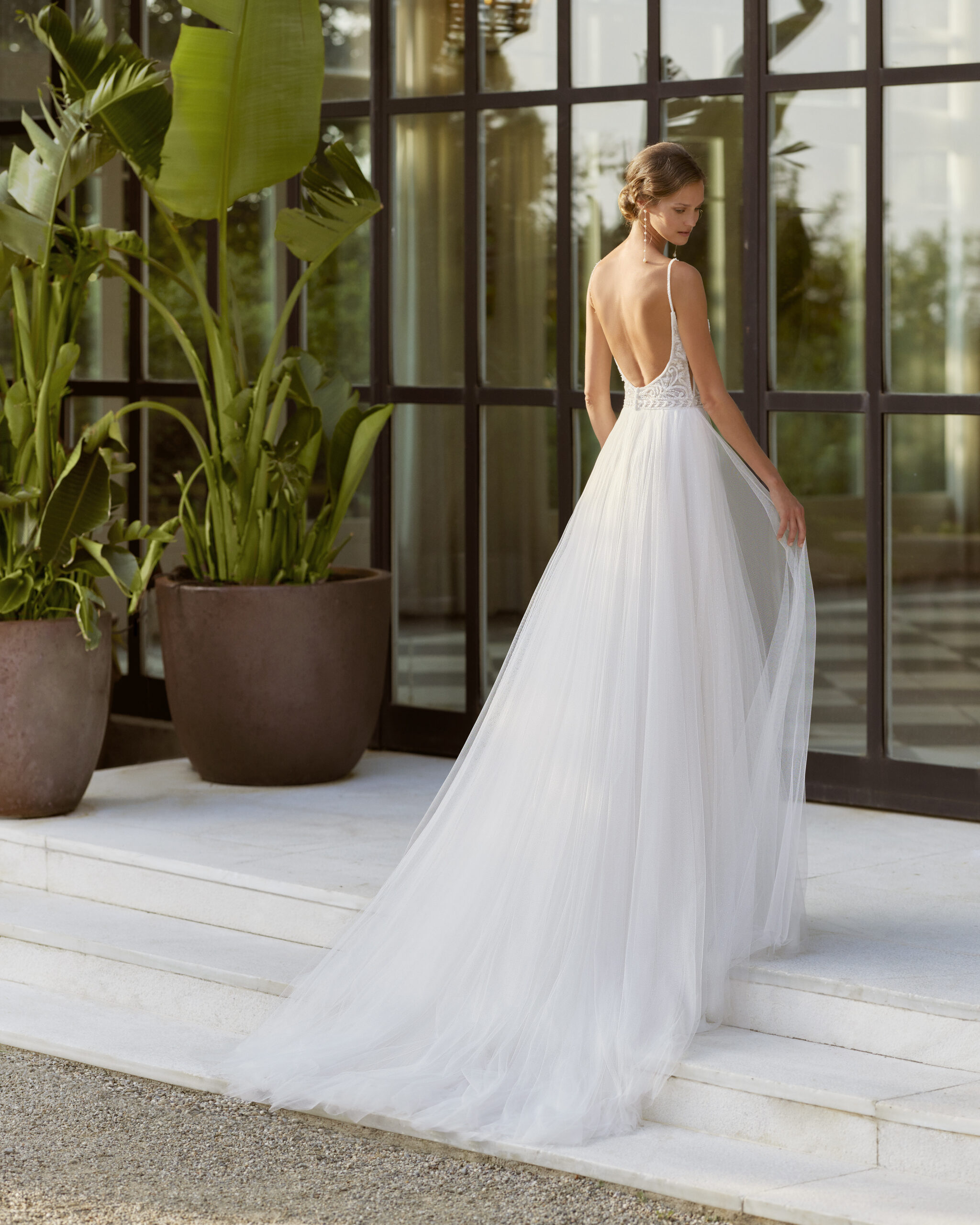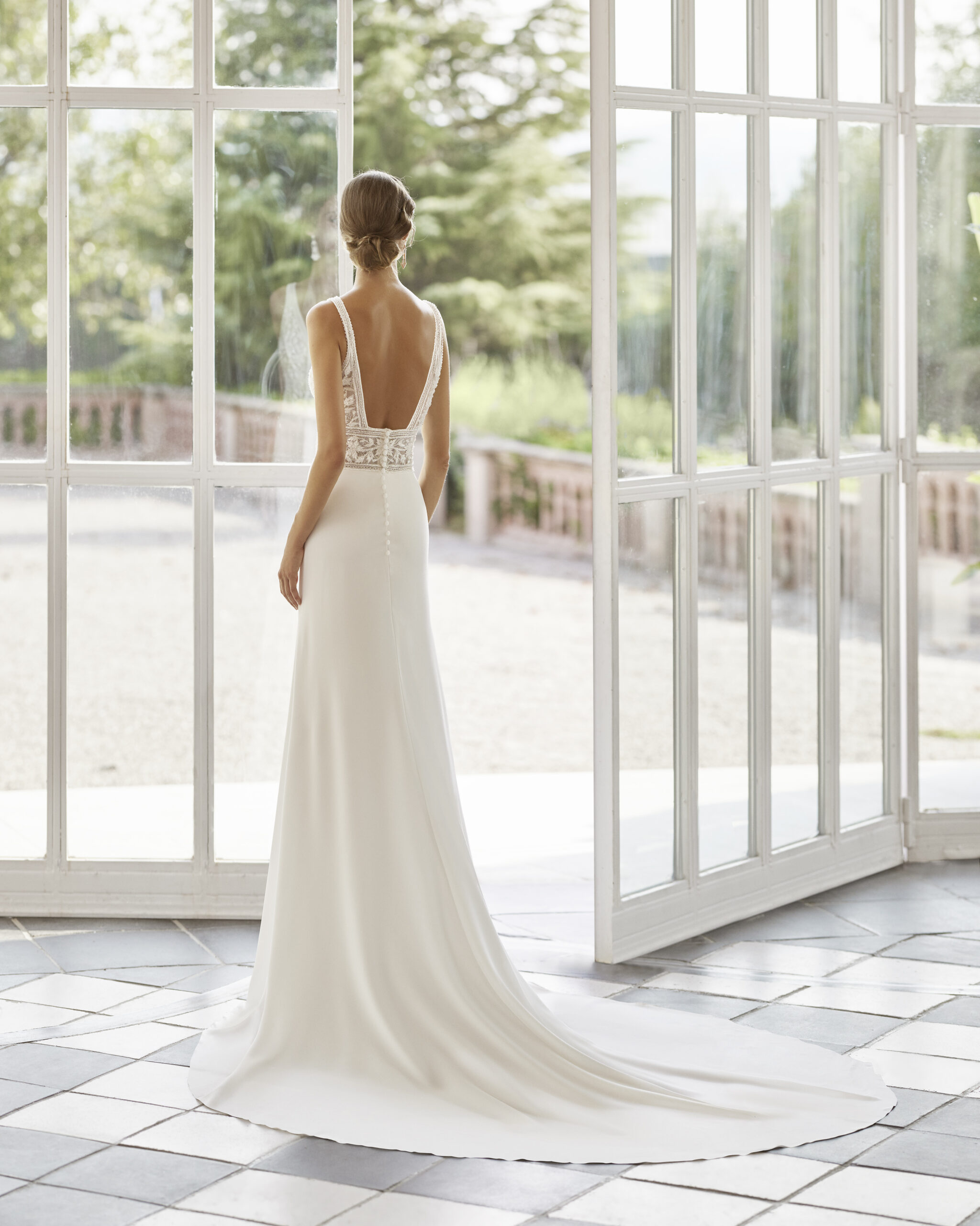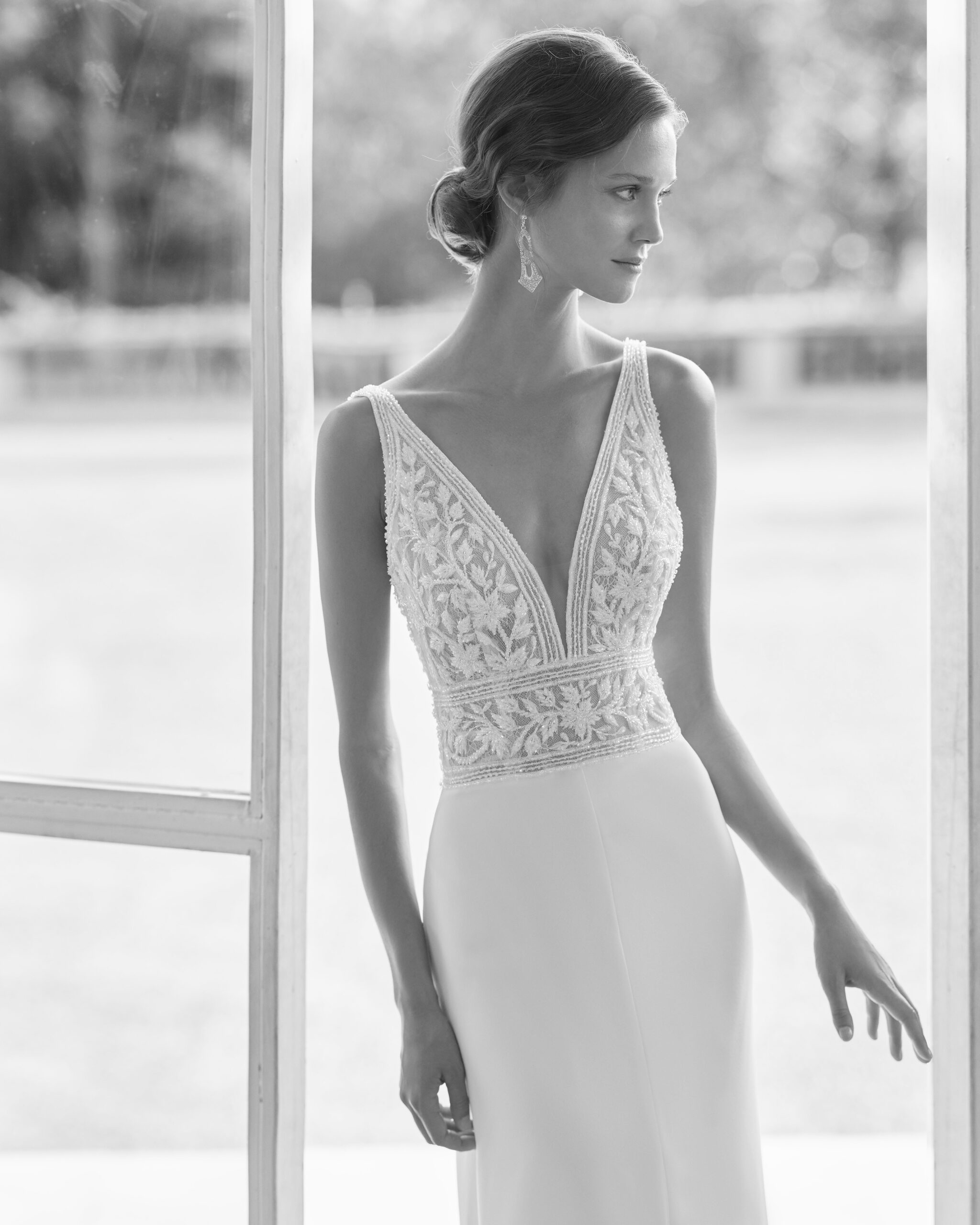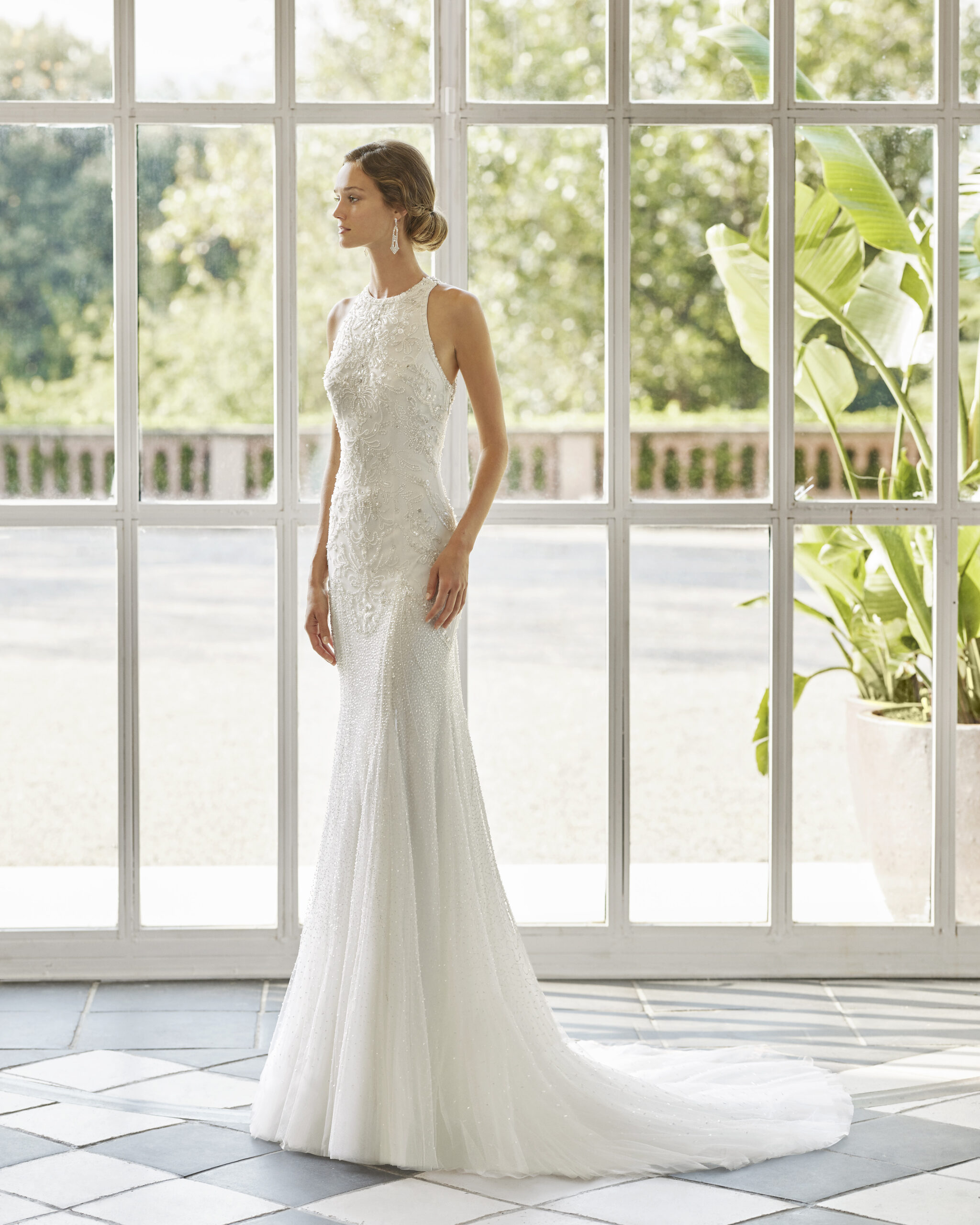 ROSA CLARÁ Gatsby s’inspire de ces looks et de la revisite qu’en a fait le film déjà culte « Gatsby le magnifique » de Baz Lurhmann pour présenter une collection de 13 robes de mariée qui modernisent cette esthétique pour les mariées d’aujourd’hui. C’est un style très demandé par les futures mariées qui se présentent chez ROSA CLARÁ, car les designs de pierreries linéaires à la touche Art Déco font depuis quelques années partie des emblèmes de la marque. C’est également l’un des styles préférés de la maison et de la designeuse Rosa Clará elle-même, qui portait une élégante robe ornée de détails de pierreries inspirée des années 30 à son propre mariage.