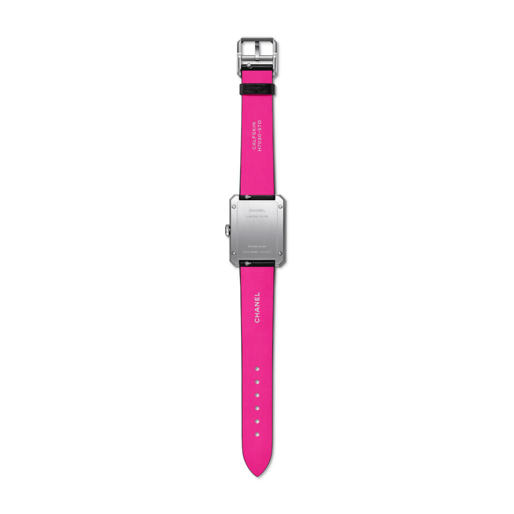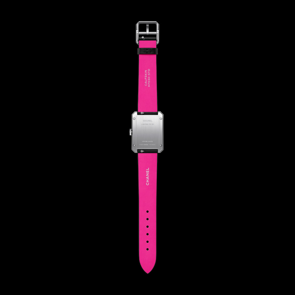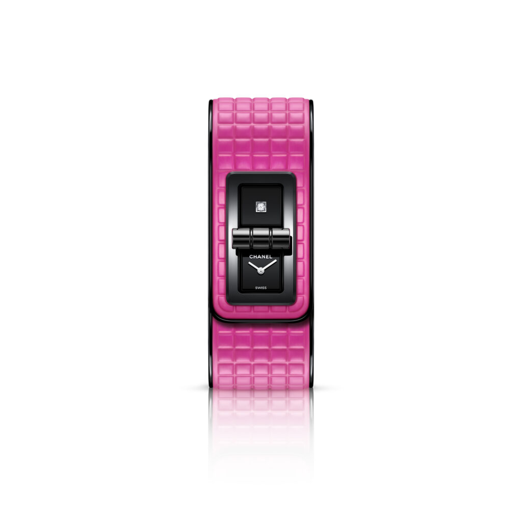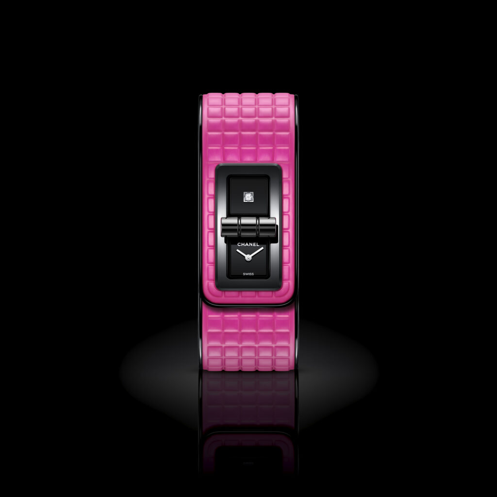 Inspiré par l’énergie de la musique électronique, CHANEL réinvente la montre CODE COCO avec un bracelet matelassé en cuir rose néon gansé de noir. Une création en acier noirci sertie d’un diamant taille princesse et équipée d’un mouvement quartz de haute précision.