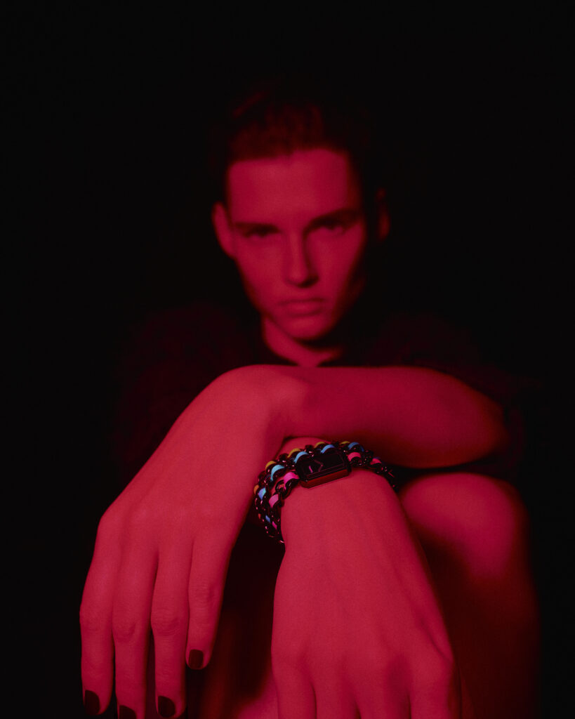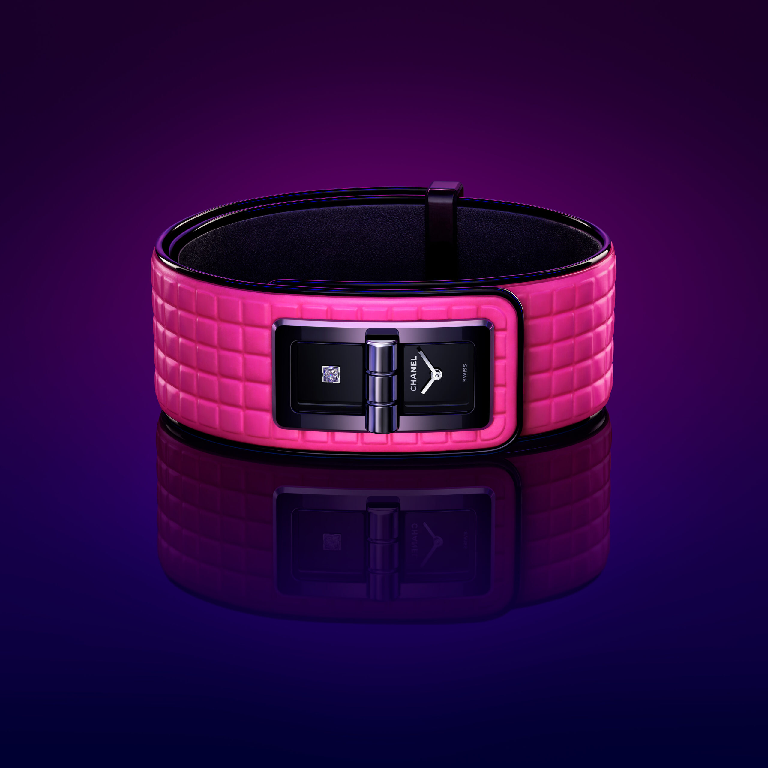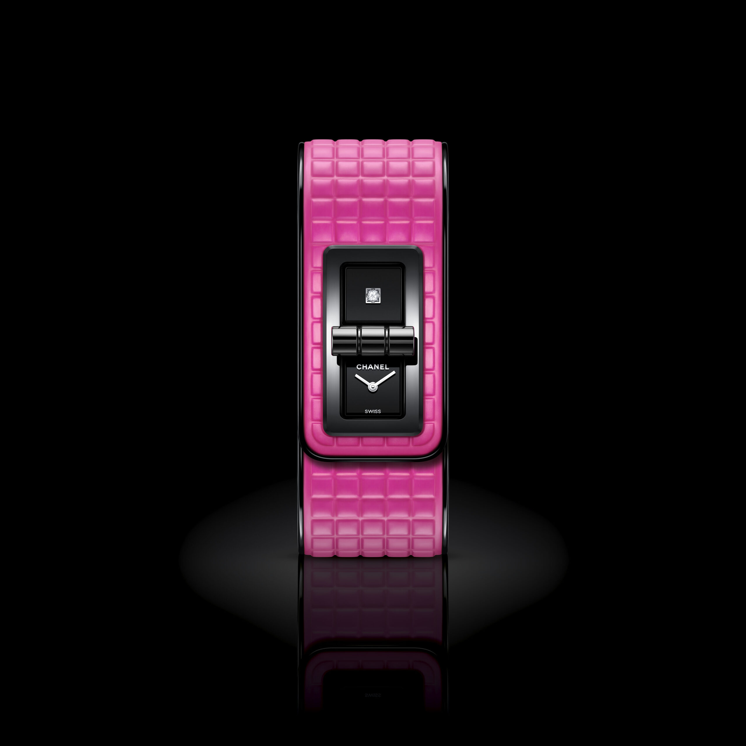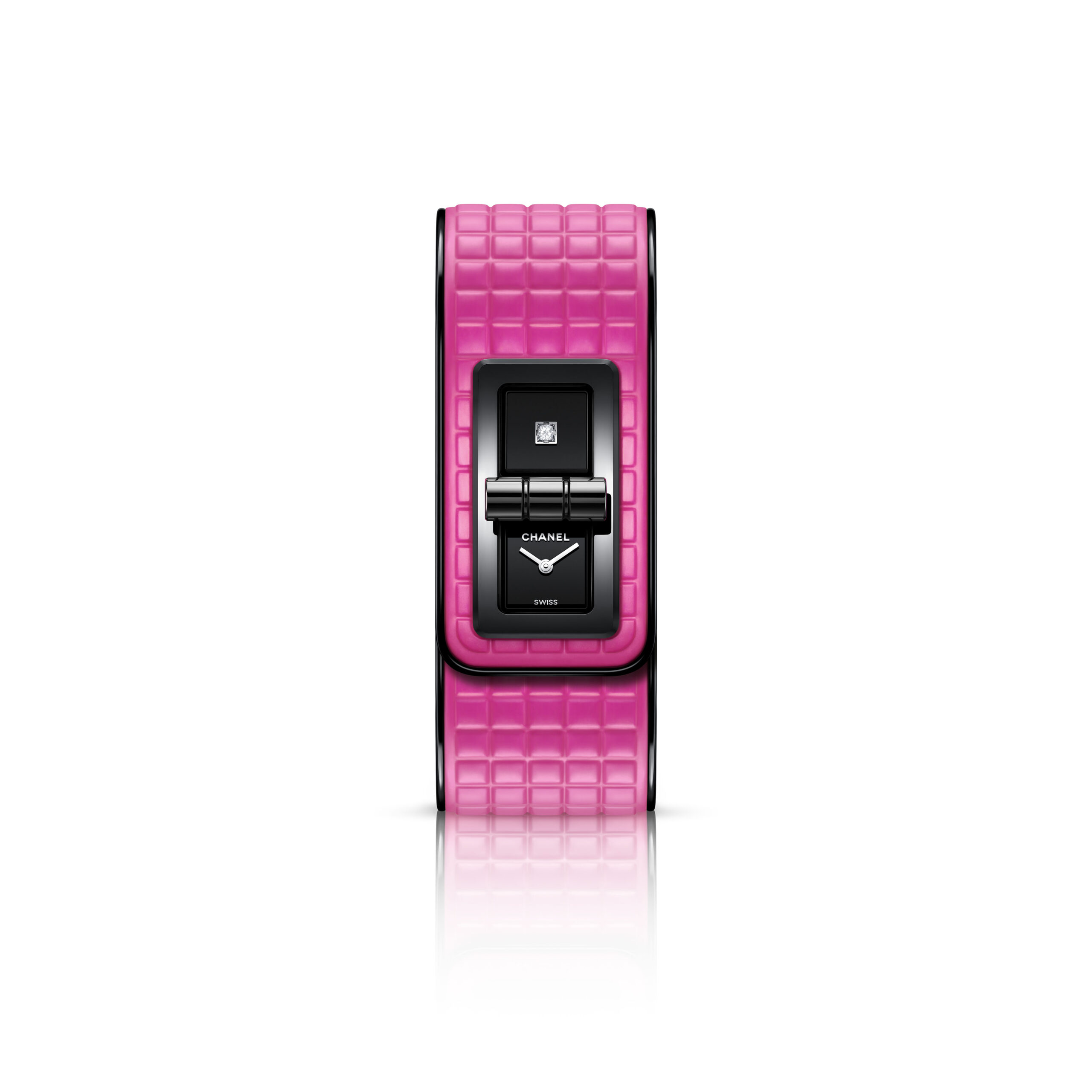 Inspiré par l’énergie de la musique électronique, CHANEL réinvente la montre CODE COCO avec un bracelet matelassé en cuir rose néon gansé de noir. Une création en acier noirci sertie d’un diamant taille princesse et équipée d’un mouvement quartz de haute précision.