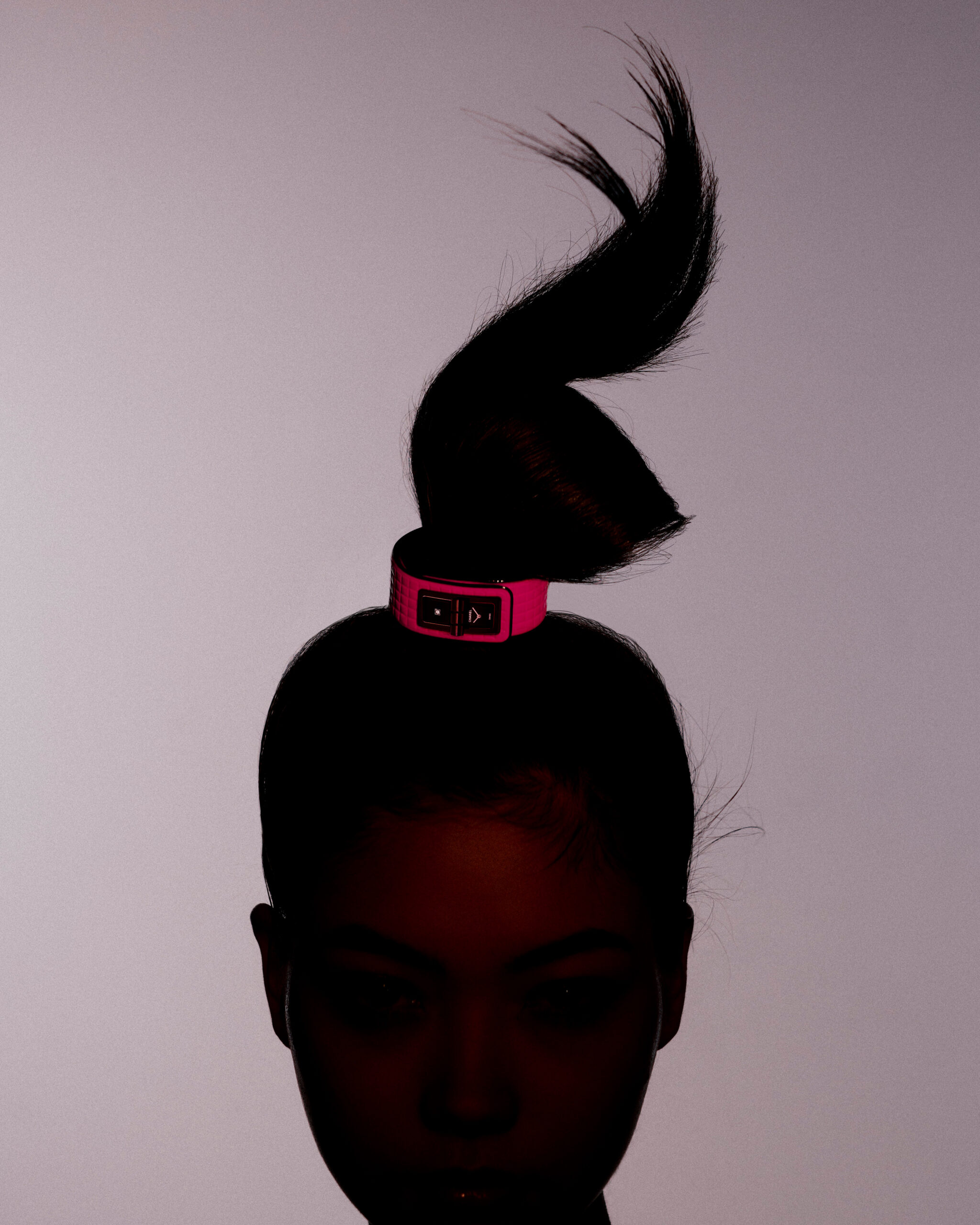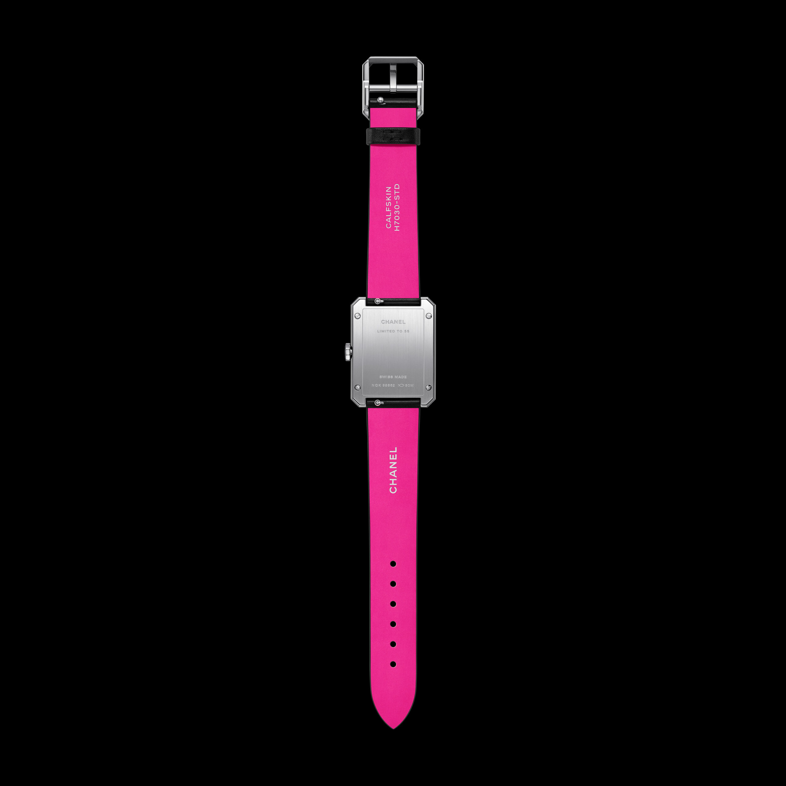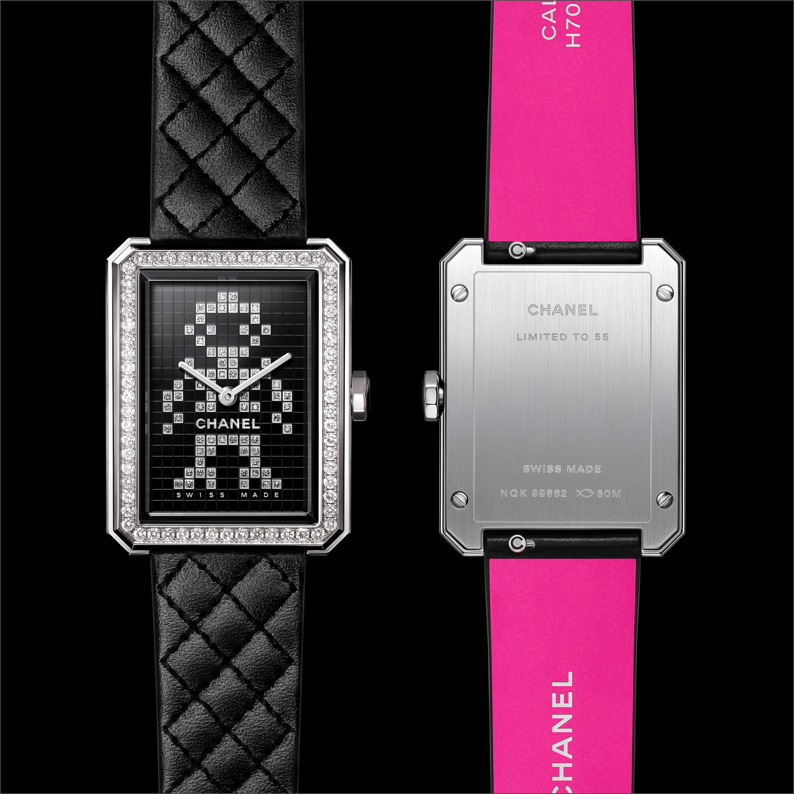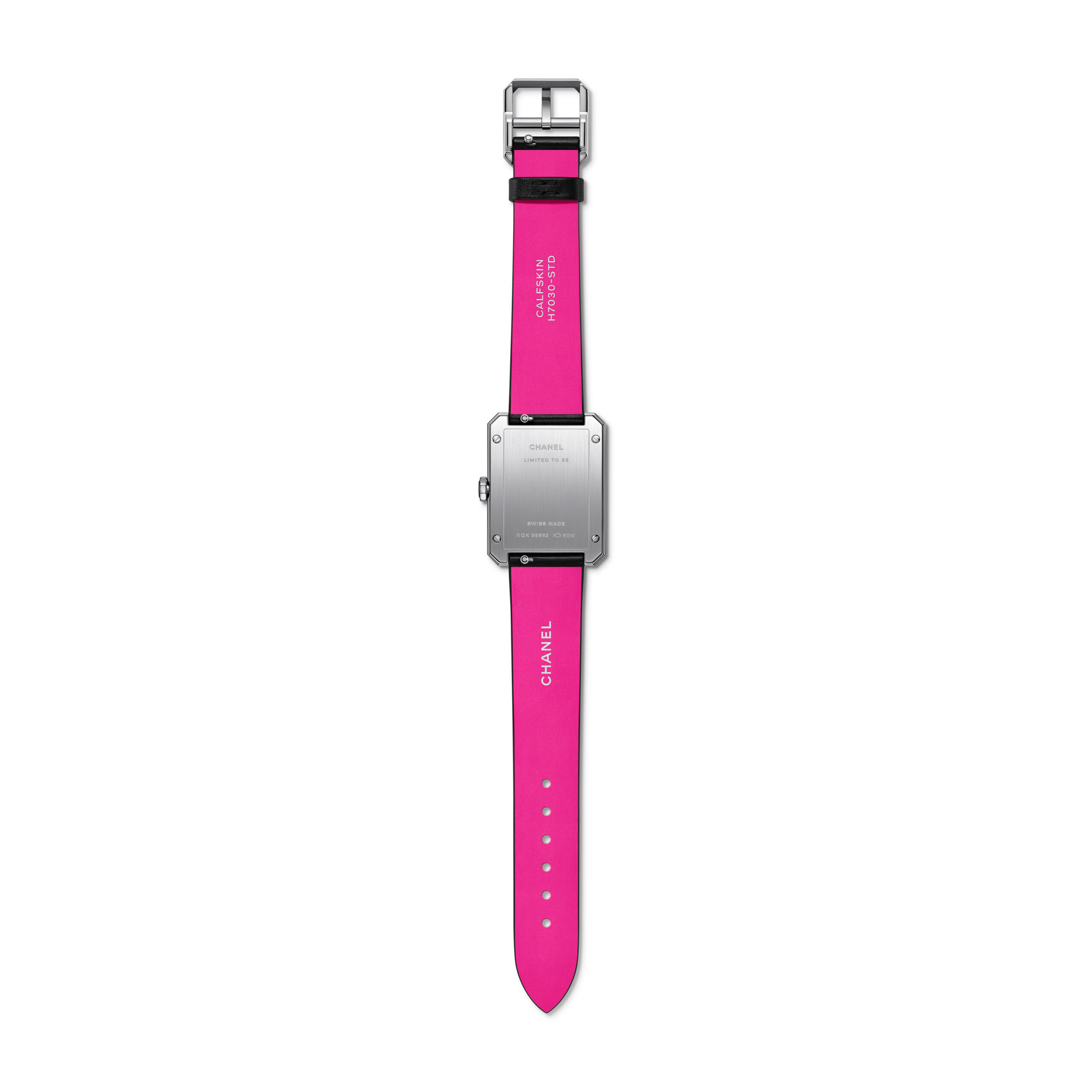 Inspiré par l’énergie de la musique électronique, CHANEL réinvente la montre CODE COCO avec un bracelet matelassé en cuir rose néon gansé de noir. Une création en acier noirci sertie d’un diamant taille princesse et équipée d’un mouvement quartz de haute précision.