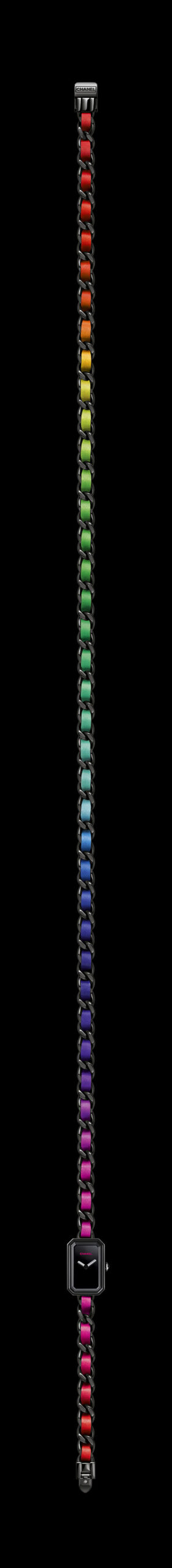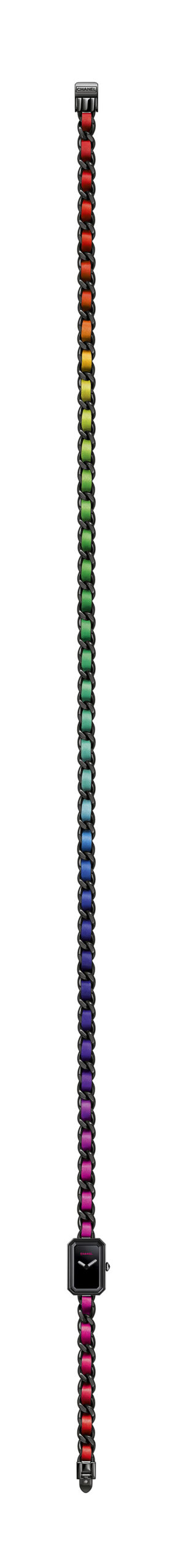 dans une version en acier noirci avec un bracelet chaîne entrelacé de cuir multicolore et équipée d’un mouvement quartz de haute précision.