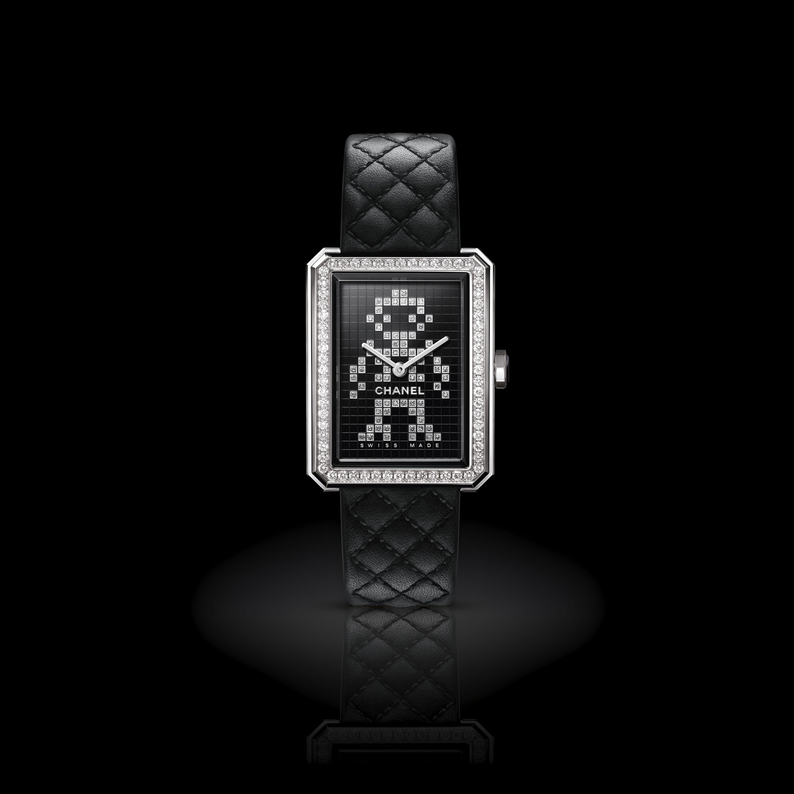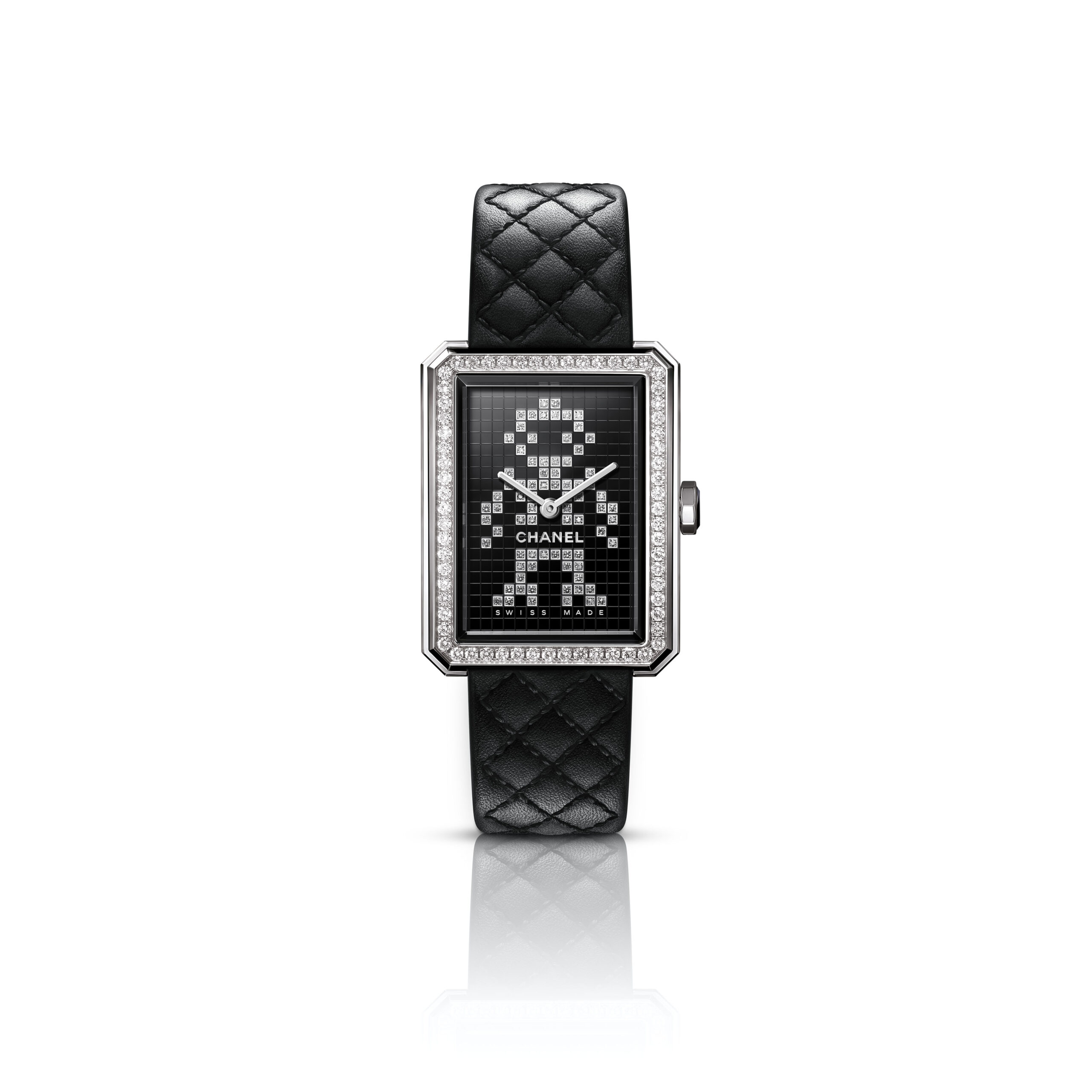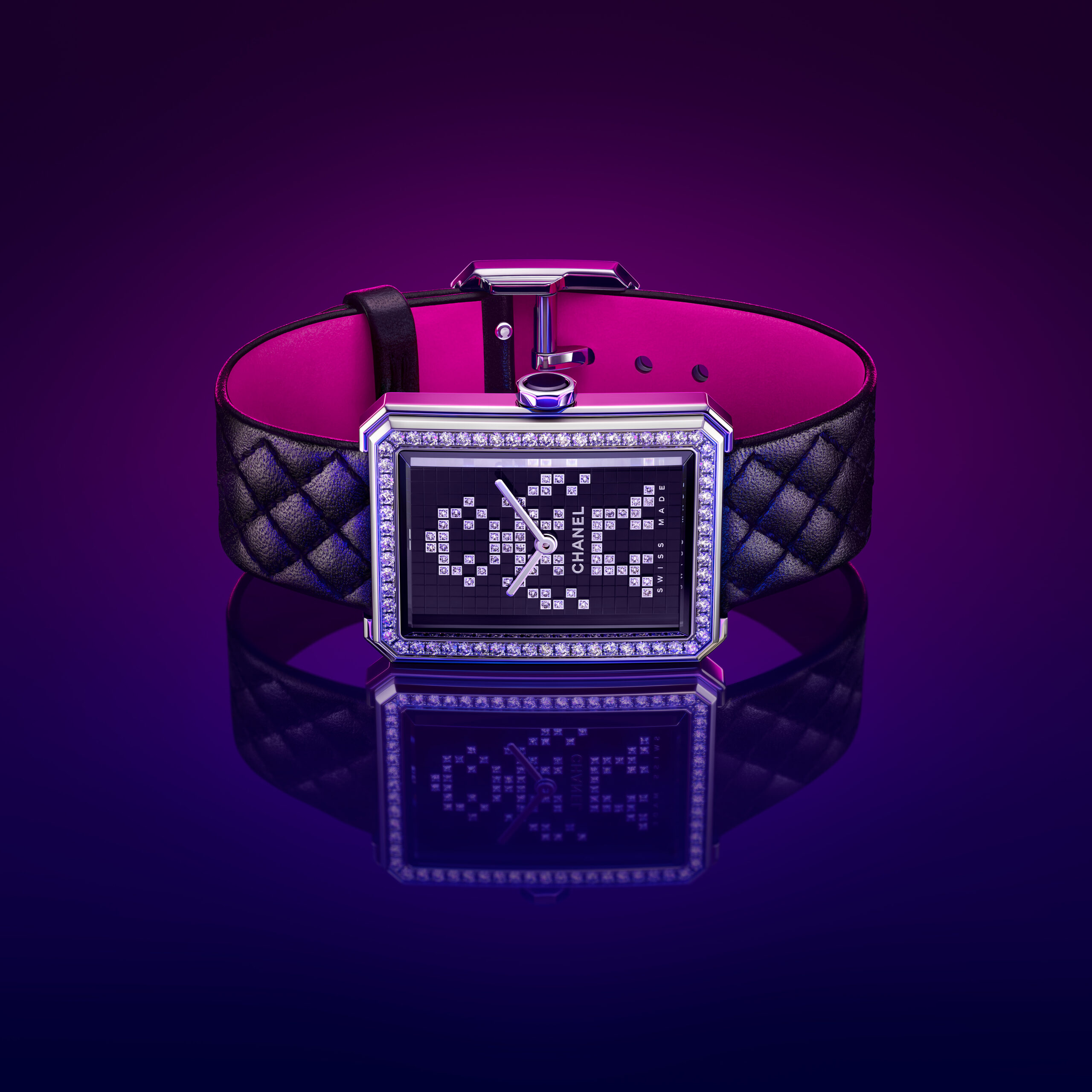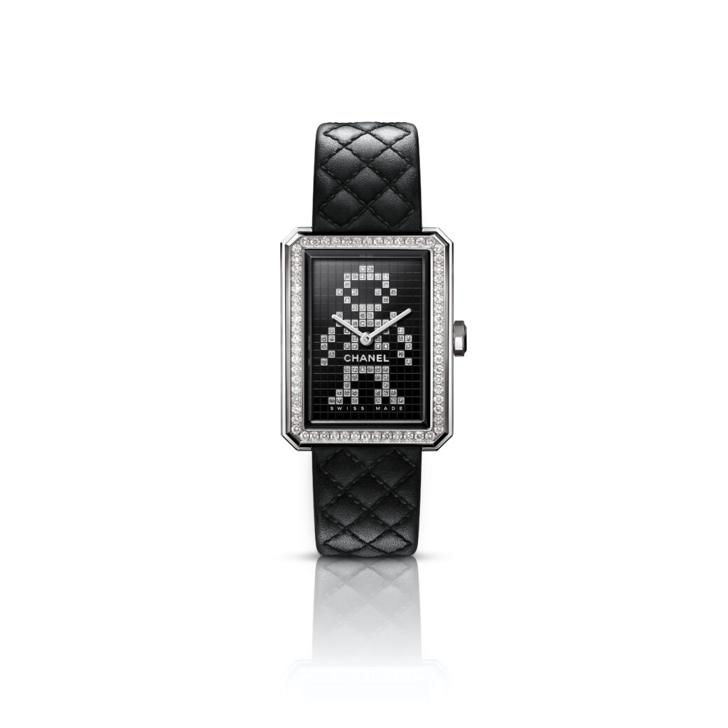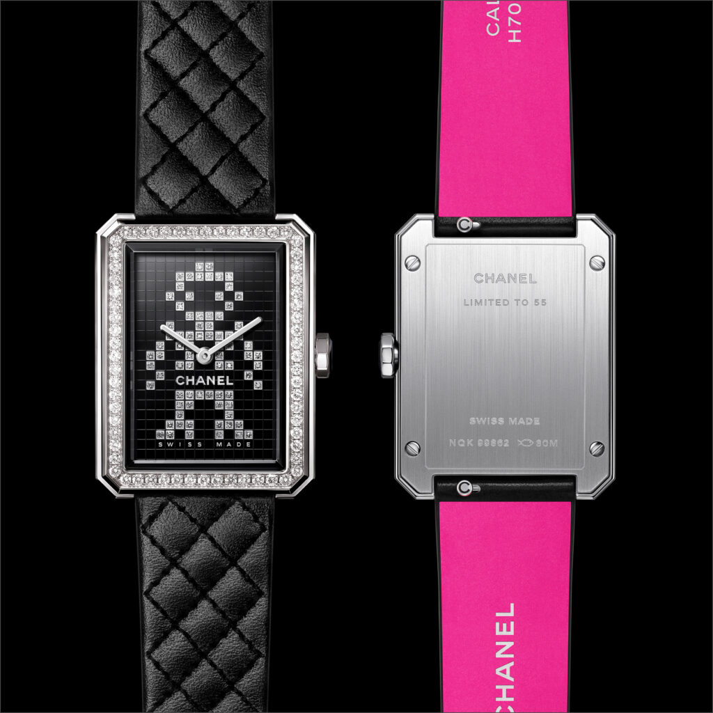 Inspiré par l’énergie de la musique électronique, CHANEL réinvente la montre BOY·FRIEND dans une version en acier sertie de 142 diamants taille brillant. Cette nouvelle interprétation est ornée d’un motif robot et d’un bracelet en cuir de veau matelassé doublé de rose néon.