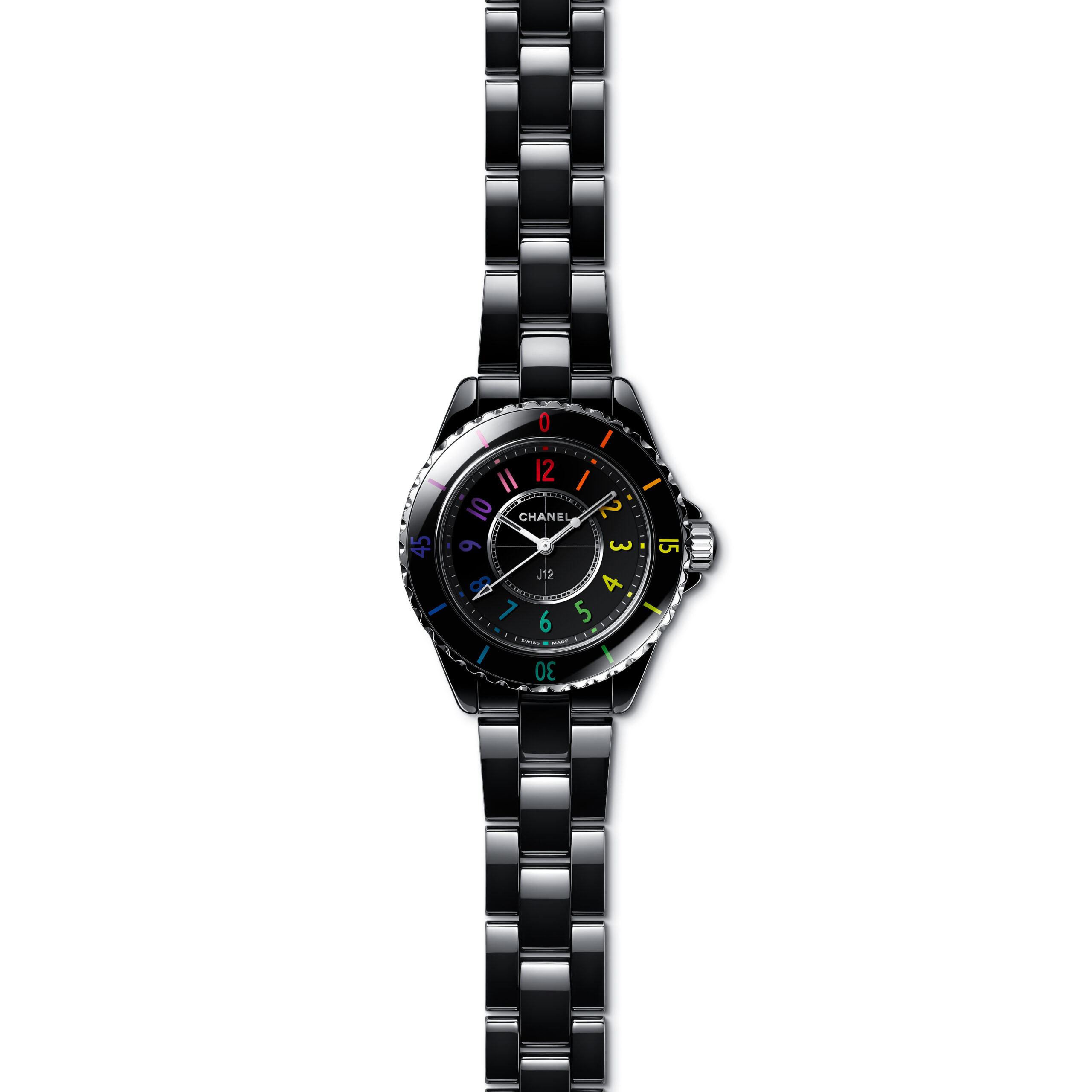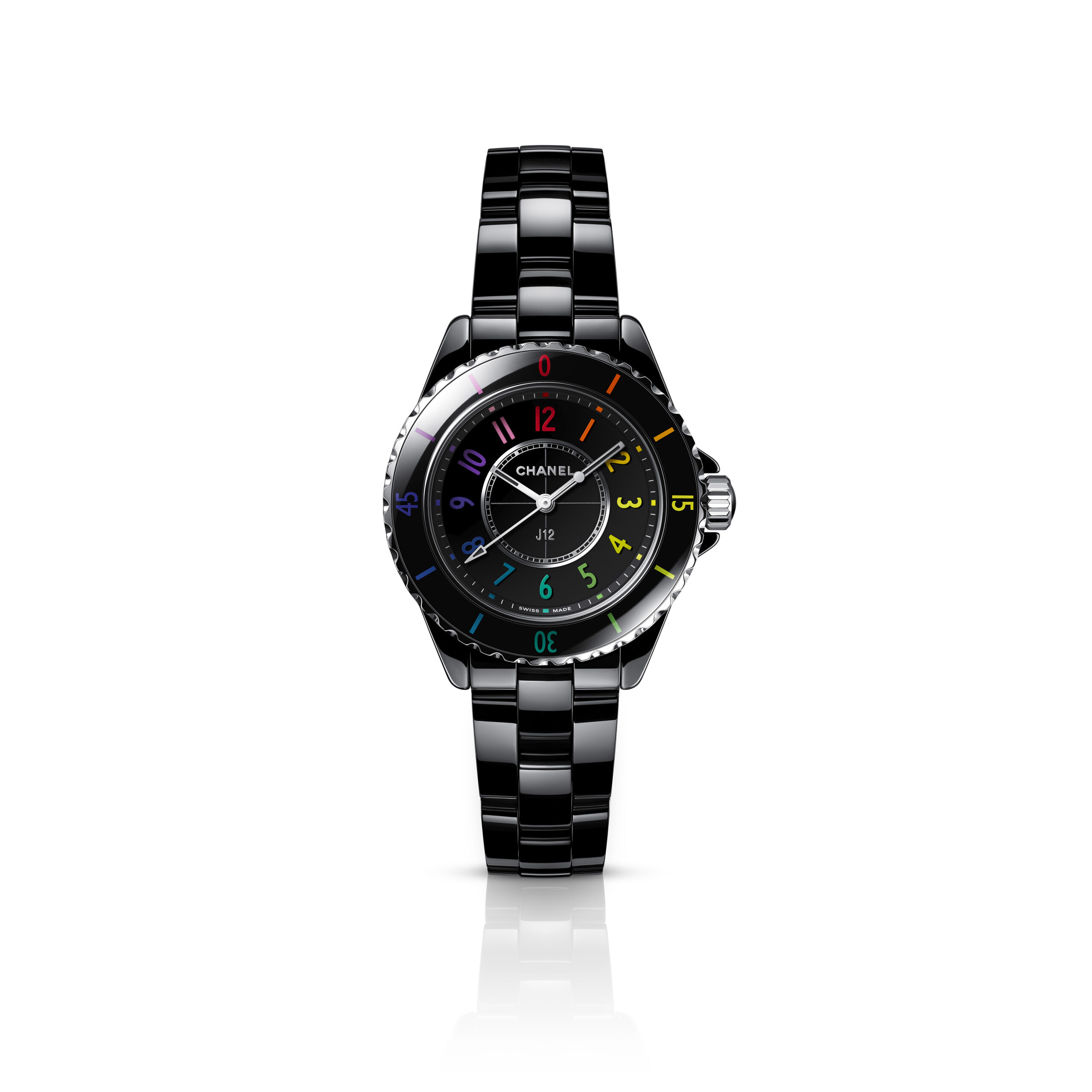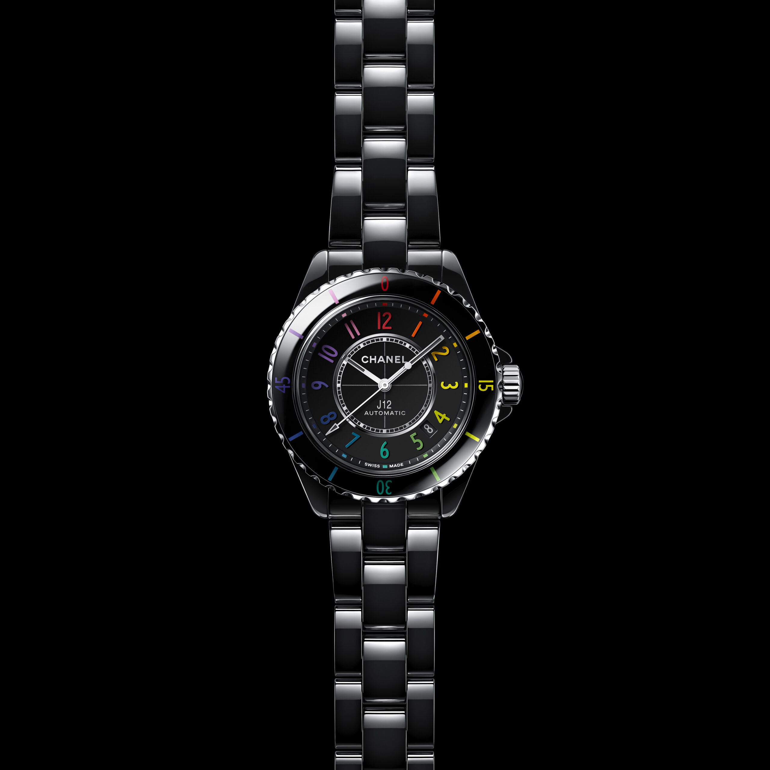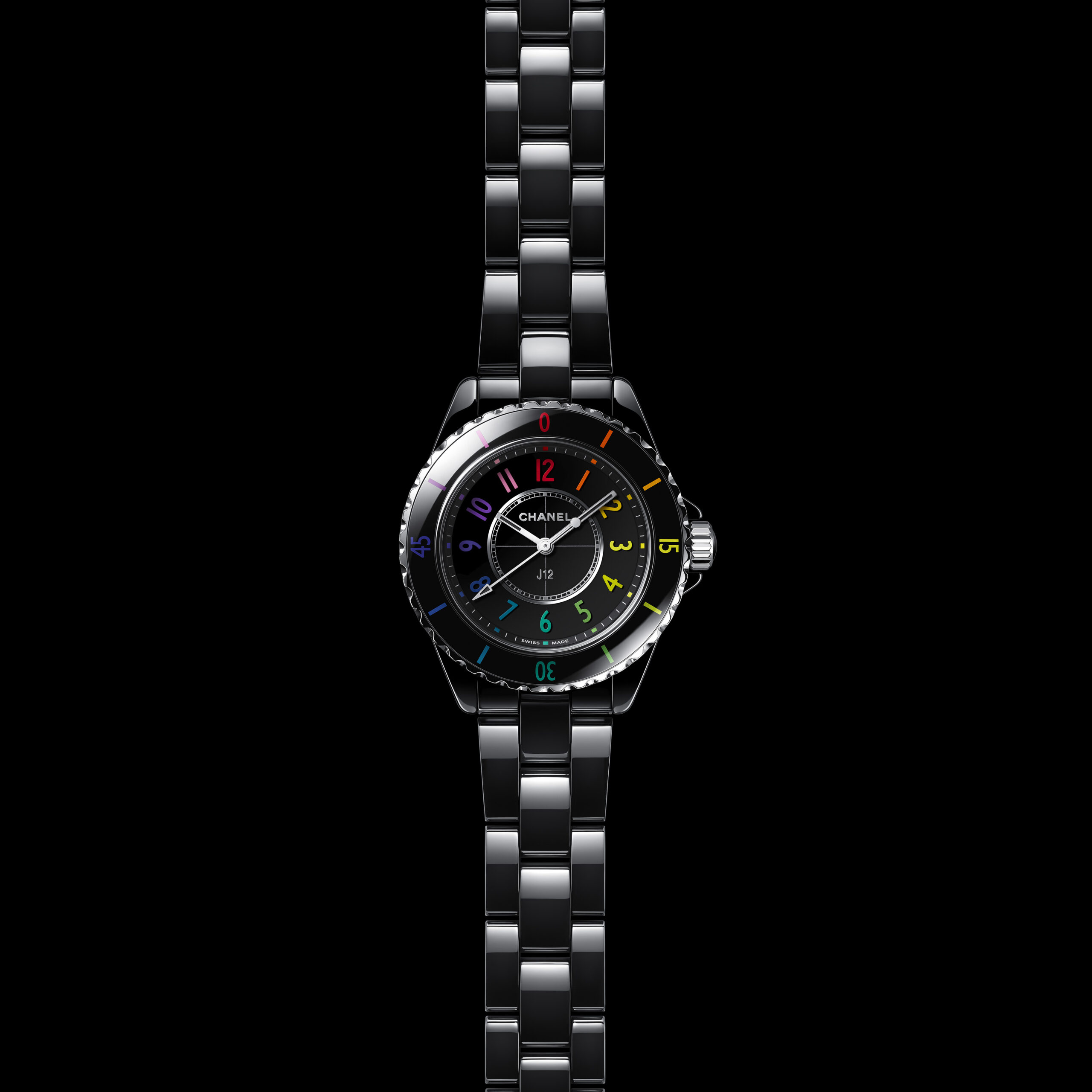 Inspiré par l’énergie de la musique électronique, CHANEL réinvente la montre J12, icône de l’Horlogerie du 21e siècle, dans un modèle en céramique noire haute résistance et acier ponctuée de chiffres aux couleurs vibrantes.