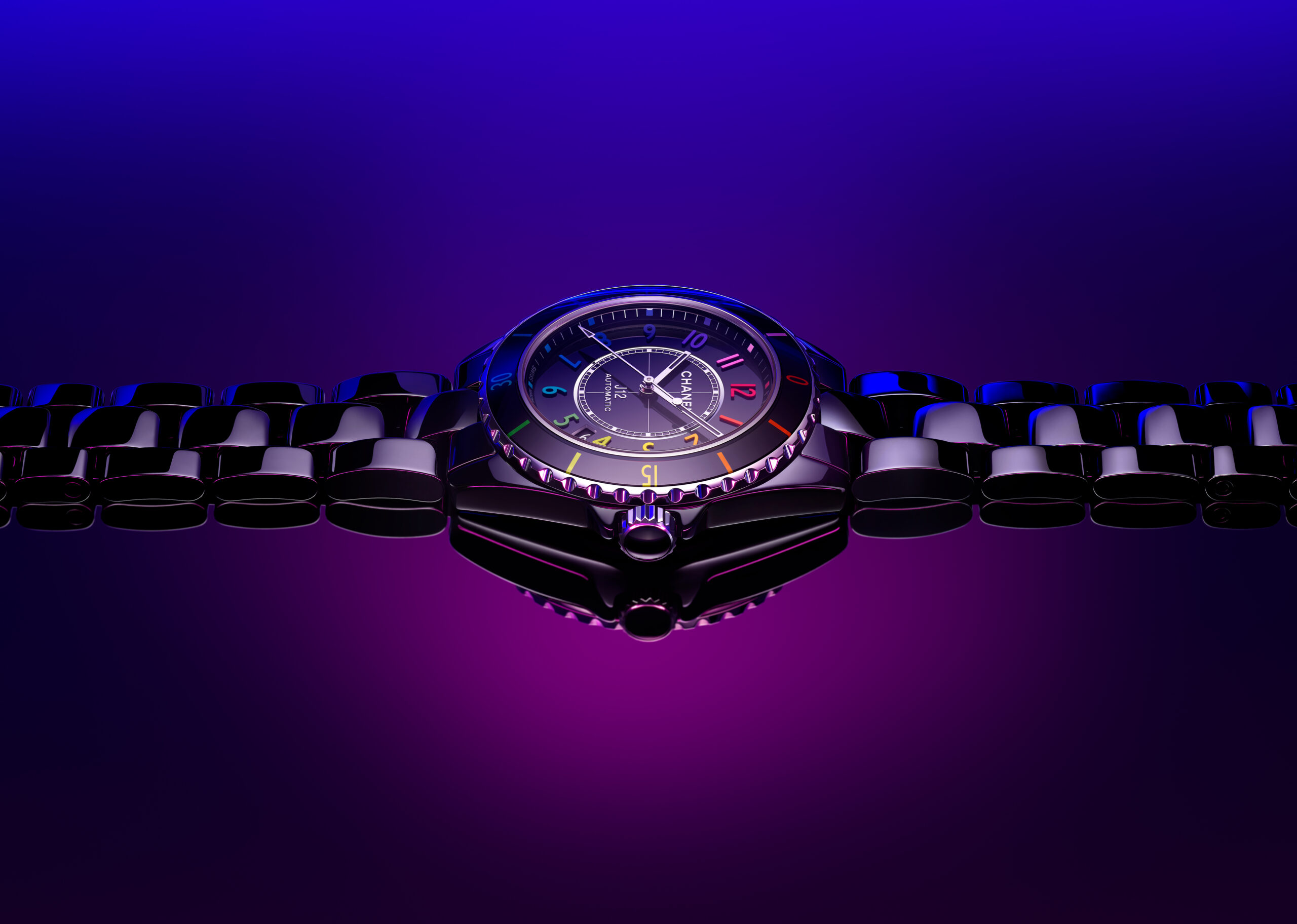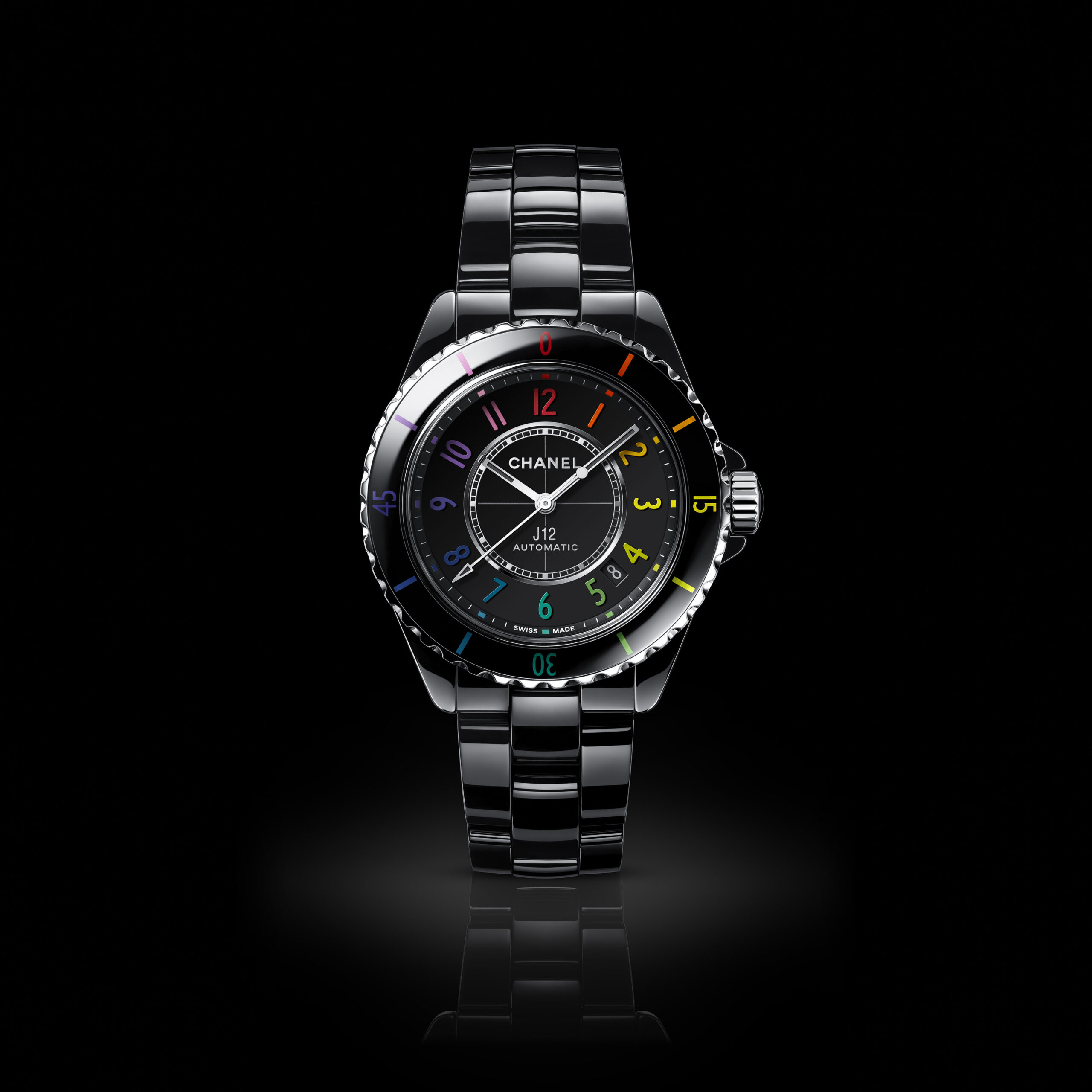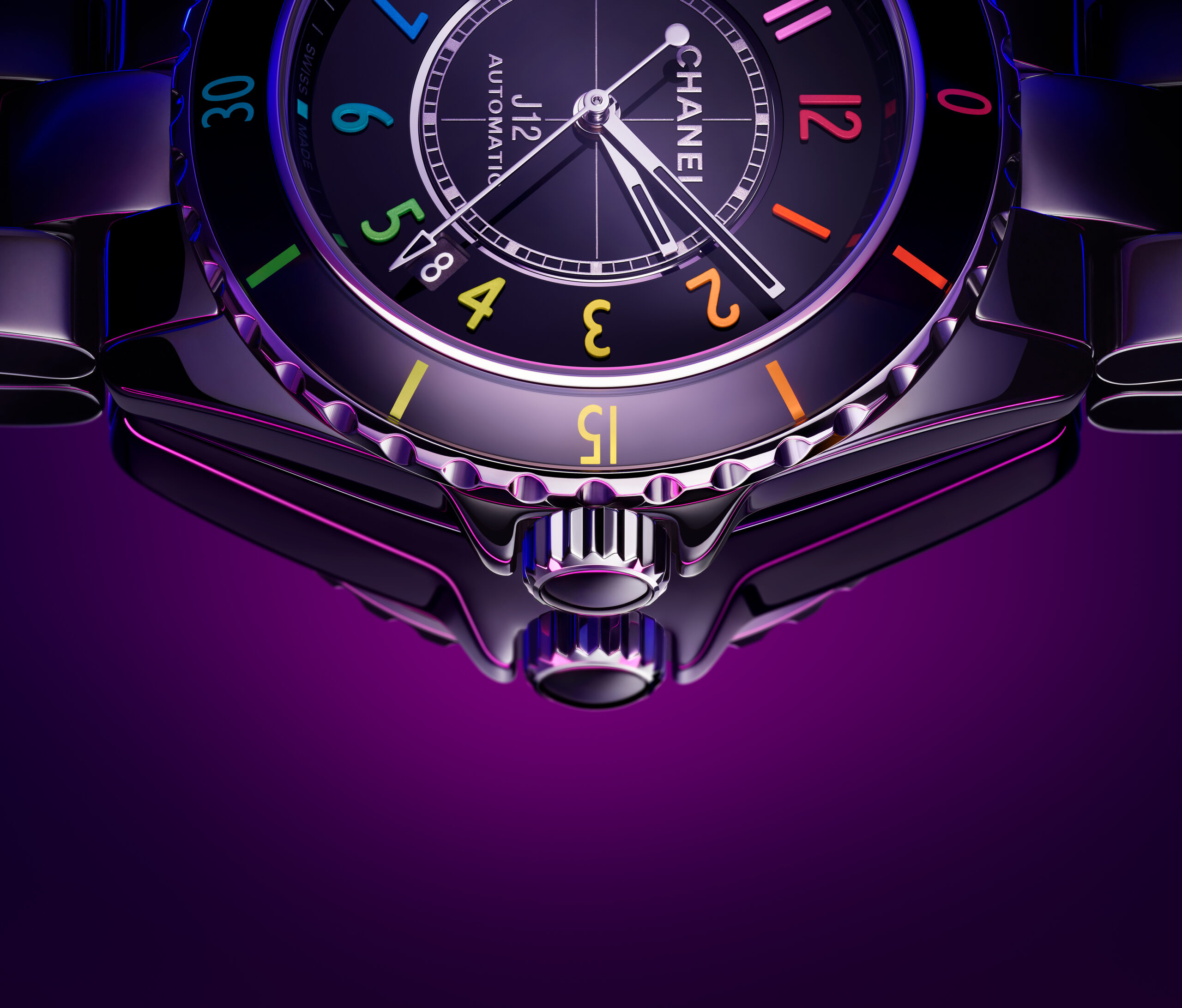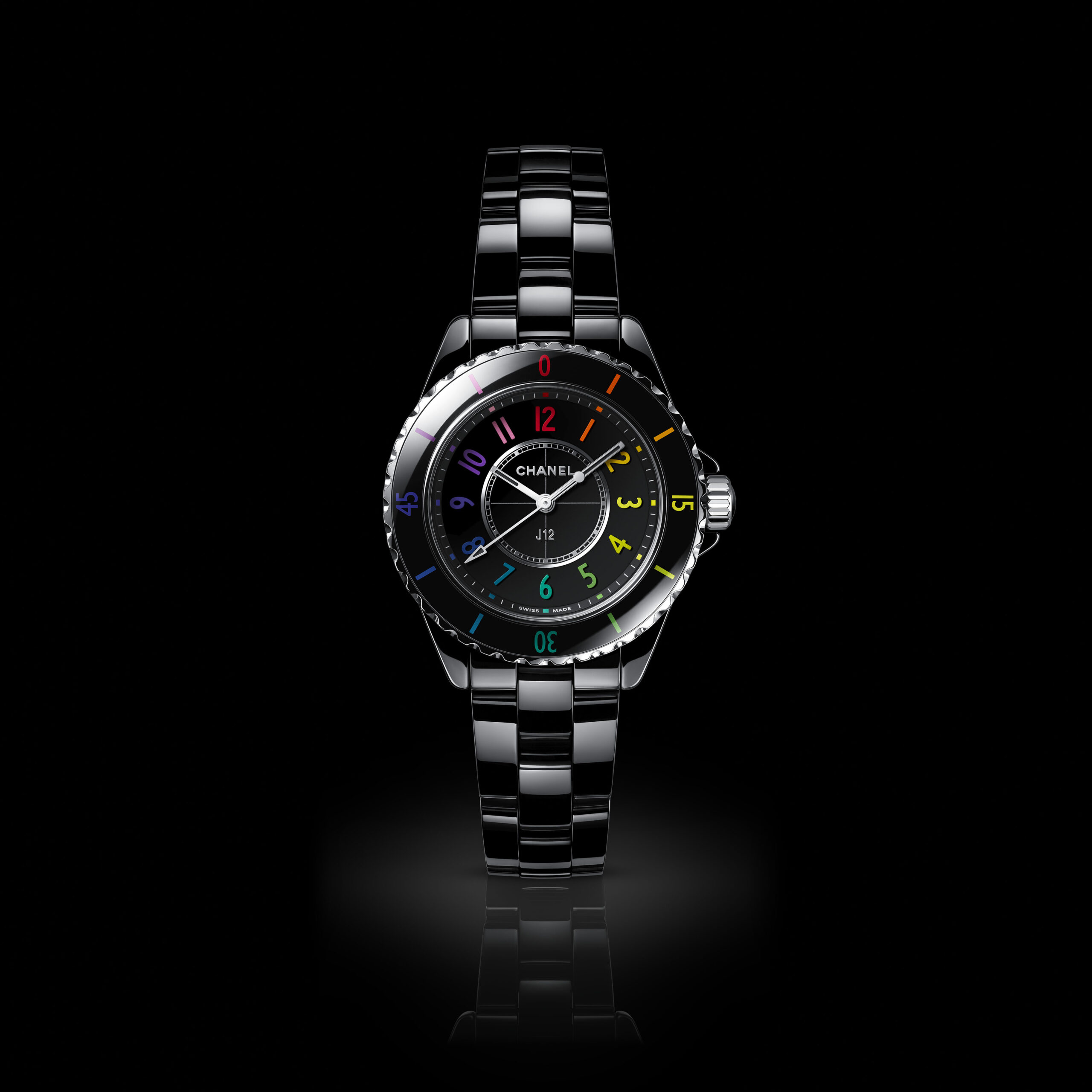 Inspiré par l’énergie de la musique électronique, CHANEL réinvente la montre J12, icône de l’Horlogerie du 21e siècle, dans un modèle en céramique noire haute résistance et acier ponctuée de chiffres aux couleurs vibrantes.