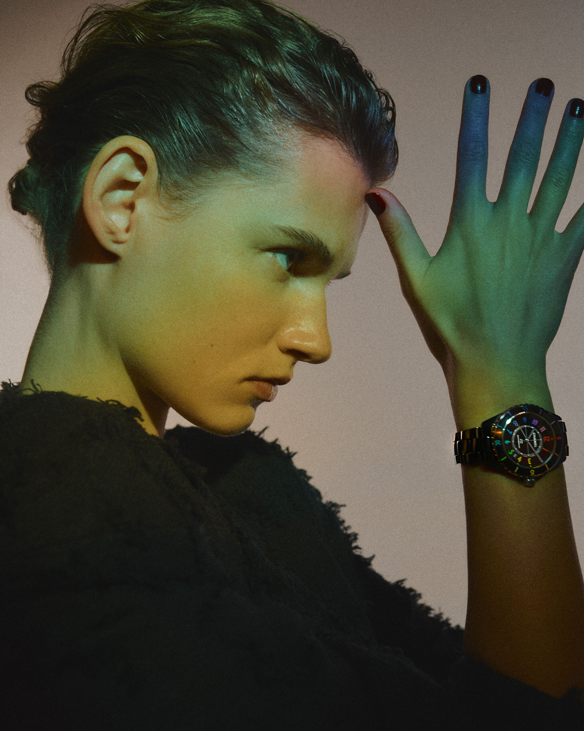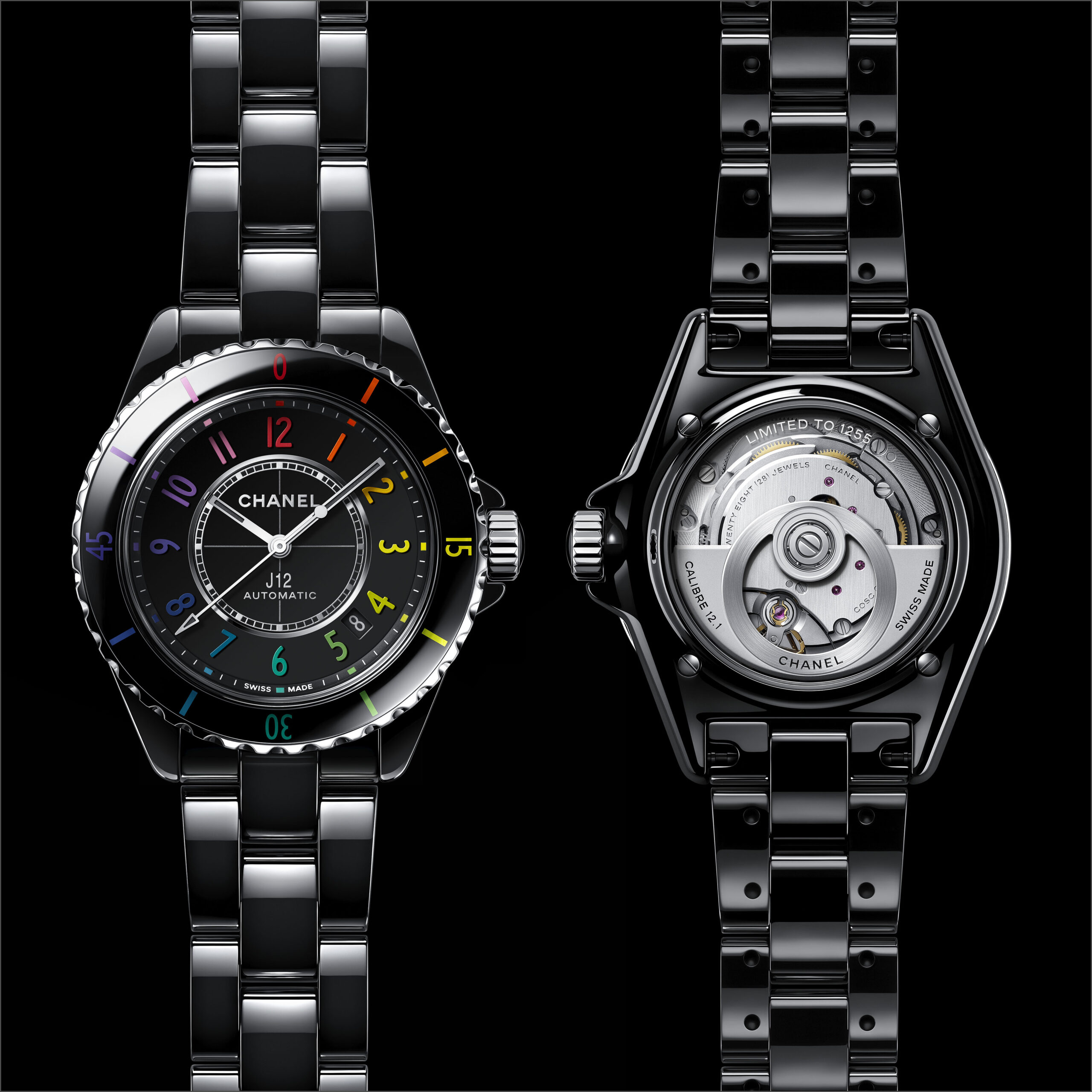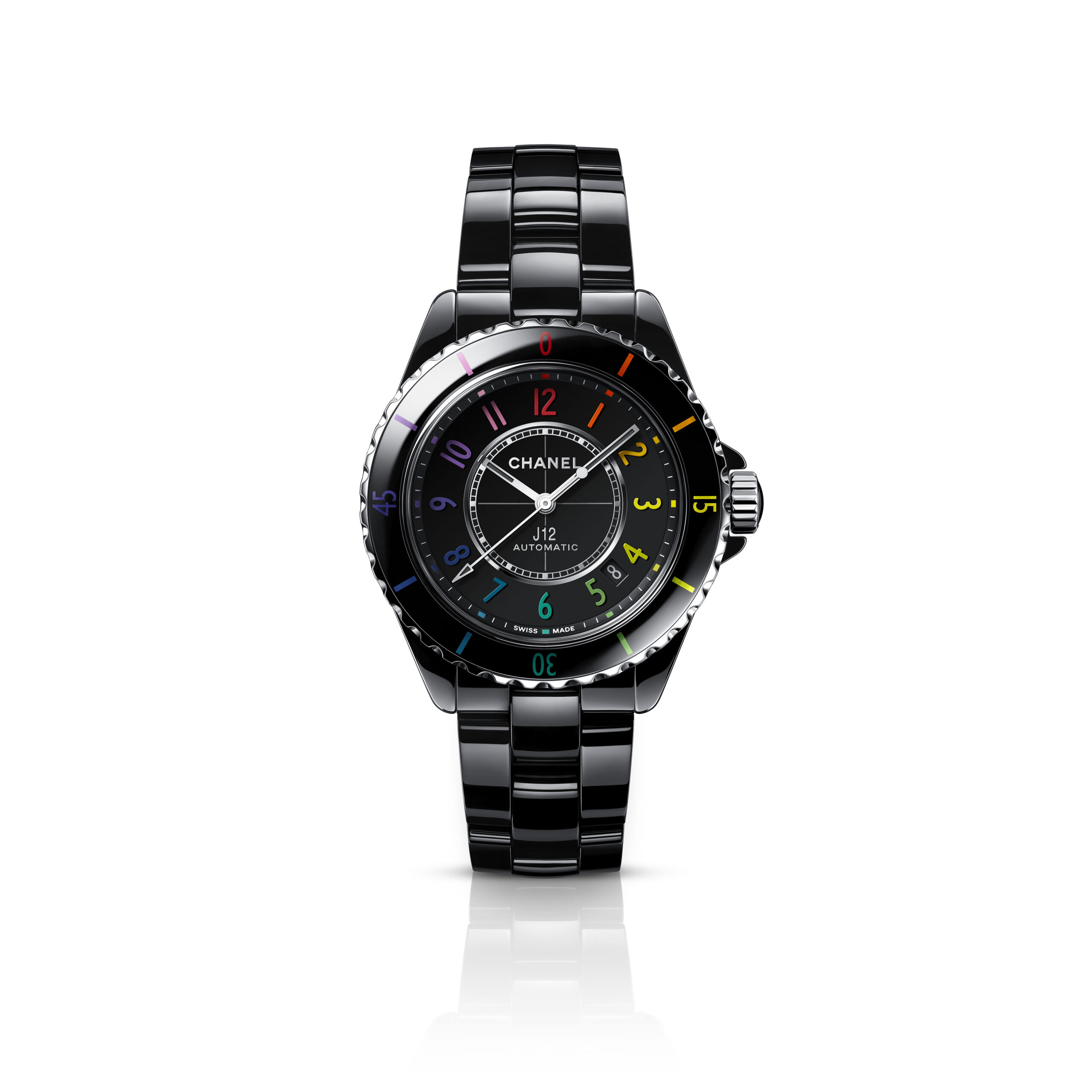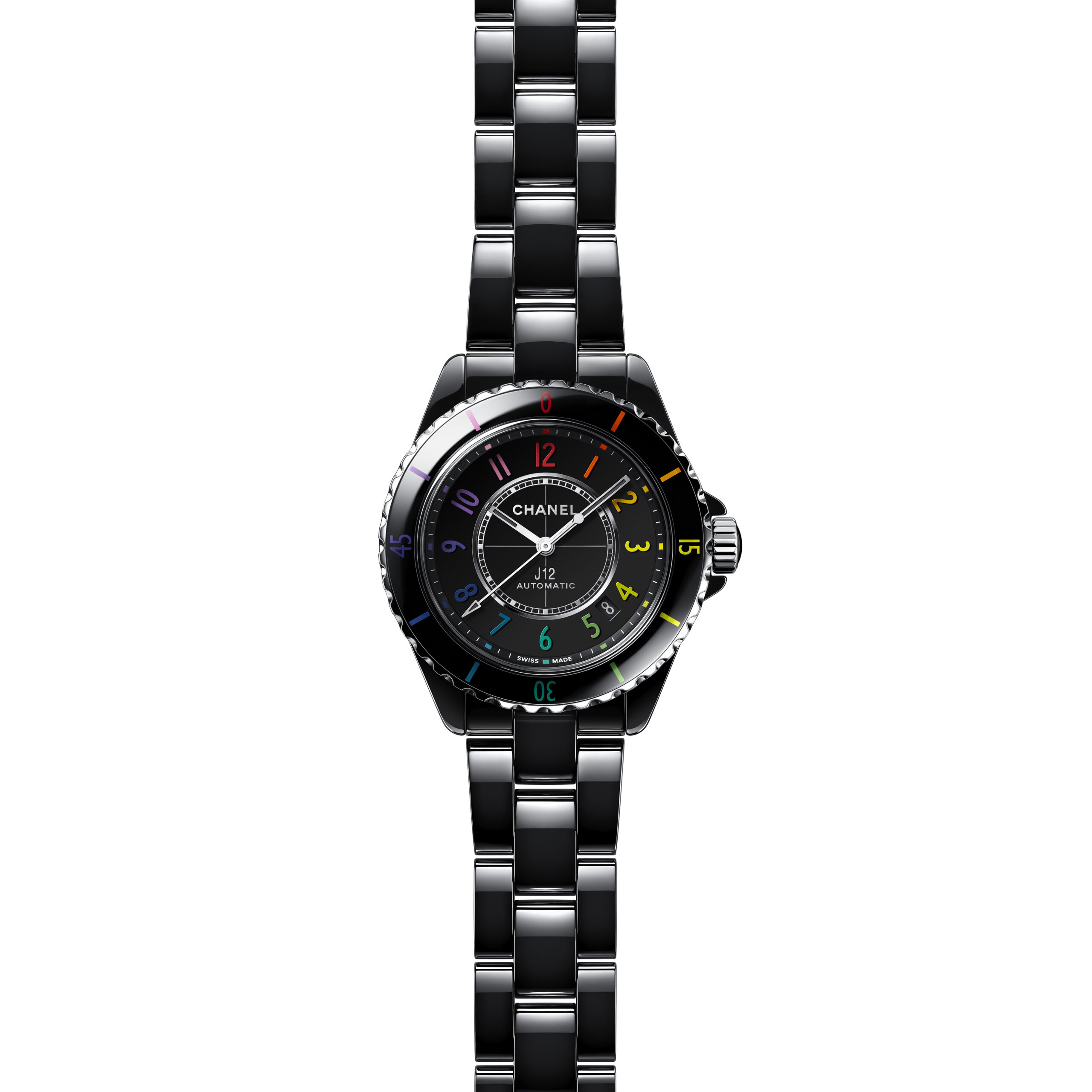 Inspiré par l’énergie de la musique électronique, CHANEL réinvente la montre J12, icône de l’Horlogerie du 21e siècle, dans un modèle en céramique noire haute résistance et acier ponctuée de chiffres aux couleurs vibrantes.