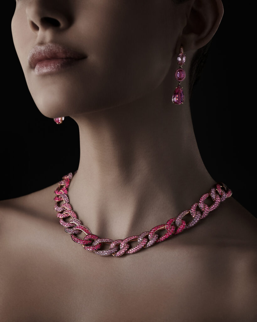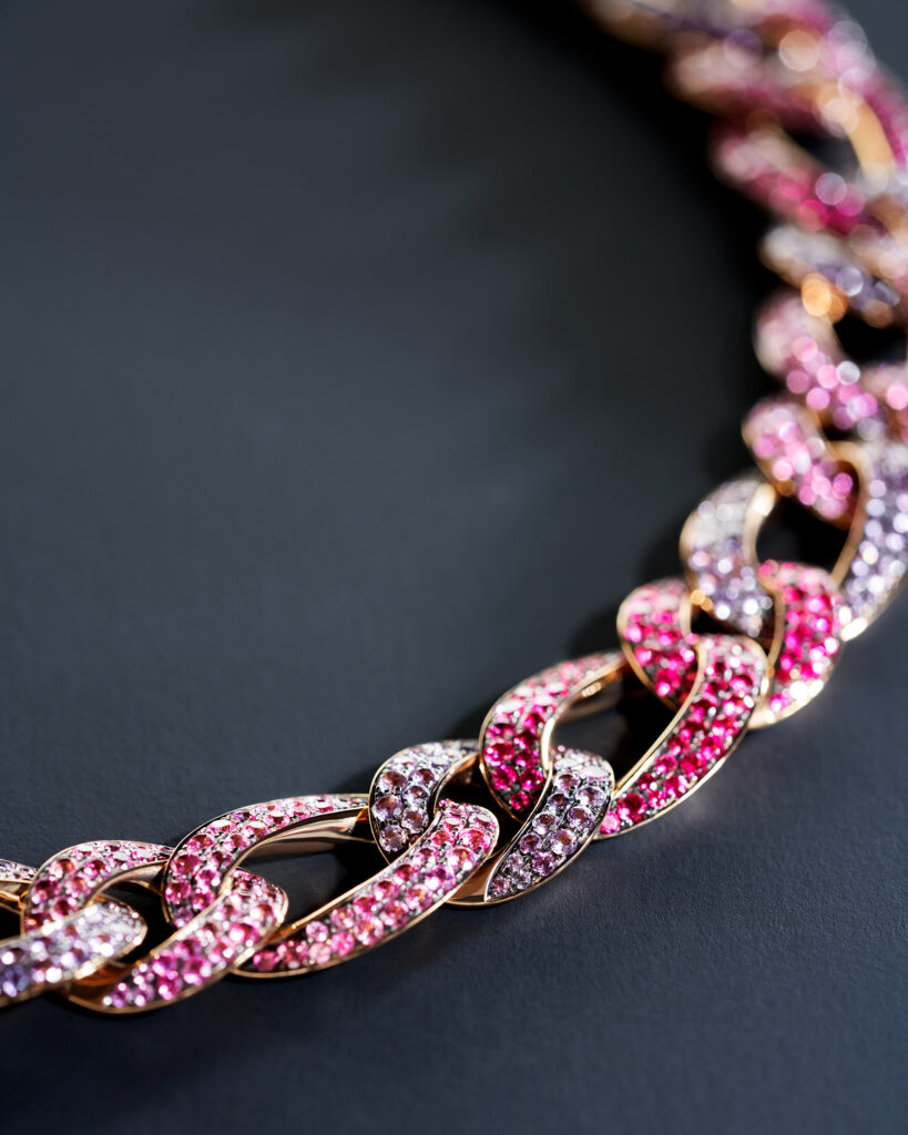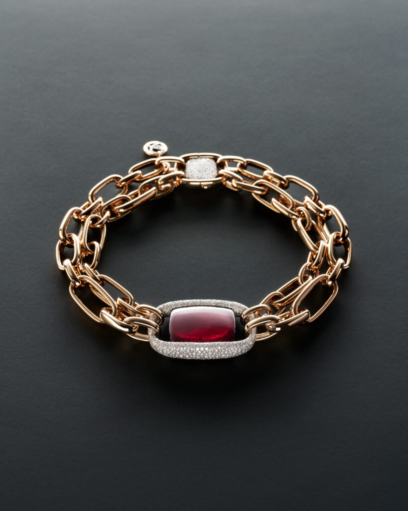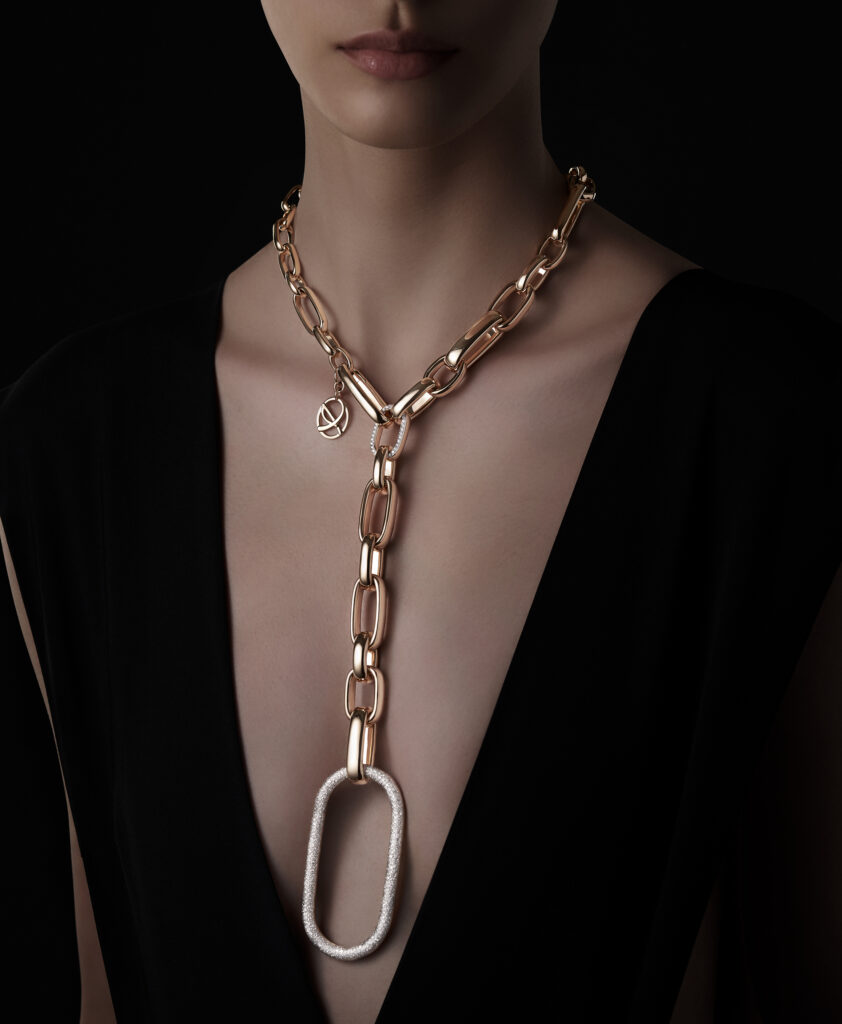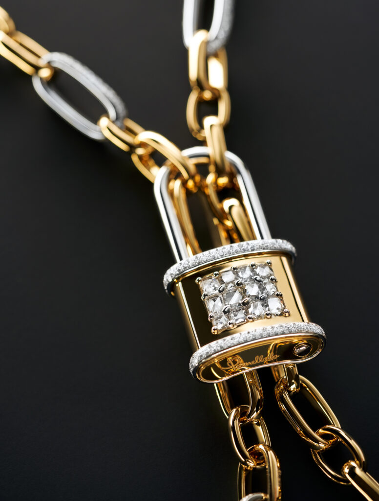 Après avoir insufflé sa liberté de ton à sa première collection de haute joaillerie, La Gioia, présentée en 2020, Pomellato célèbre aujourd’hui un double renouveau. A la métamorphose de pièces vintage s’ajoute la création ex nihilo de modèles faisant écho à l’une des grandes spécialités de Pomellato, les chaînes et gourmettes. Un choix audacieux car ce type de bijoux est très peu exploité dans la haute joaillerie. En mettant ainsi en lumière les maillons d’or, Pomellato fait évoluer le style et le porté de ces pièces et les transporte dans un registre plus contemporain.