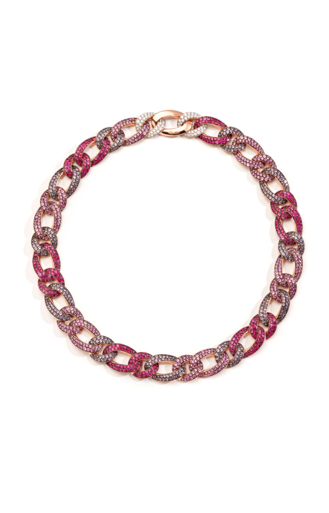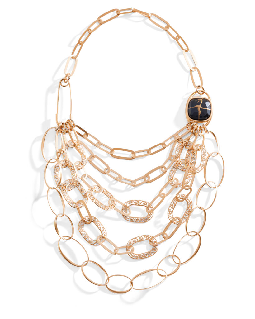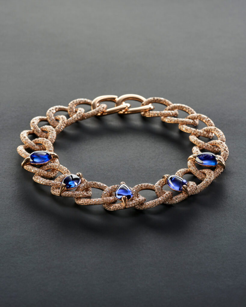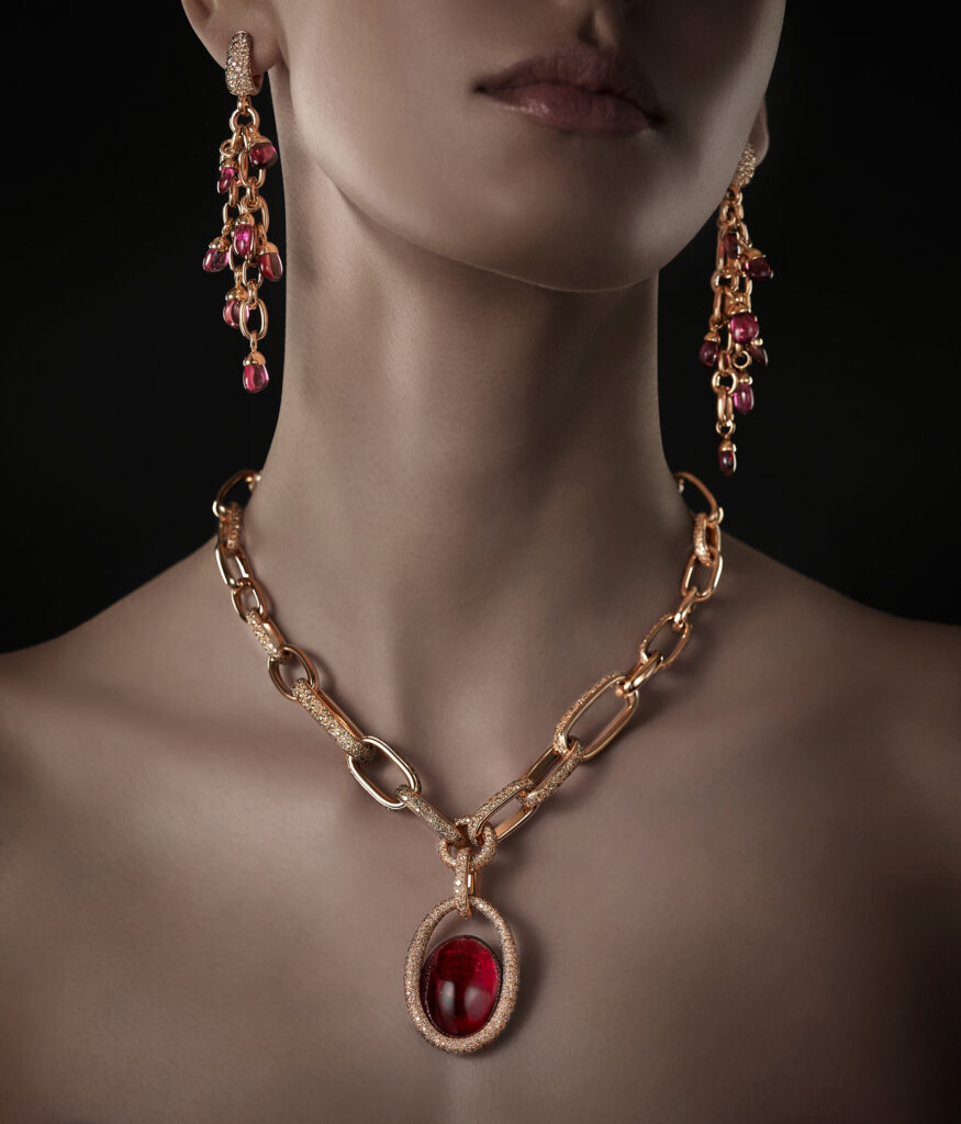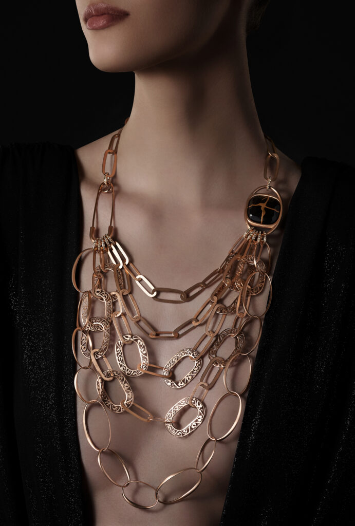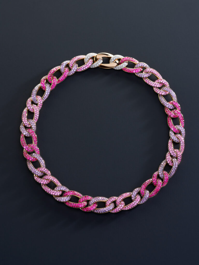Après avoir insufflé sa liberté de ton à sa première collection de haute joaillerie, La Gioia, présentée en 2020, Pomellato célèbre aujourd’hui un double renouveau. A la métamorphose de pièces vintage s’ajoute la création ex nihilo de modèles faisant écho à l’une des grandes spécialités de Pomellato, les chaînes et gourmettes. Un choix audacieux car ce type de bijoux est très peu exploité dans la haute joaillerie. En mettant ainsi en lumière les maillons d’or, Pomellato fait évoluer le style et le porté de ces pièces et les transporte dans un registre plus contemporain.