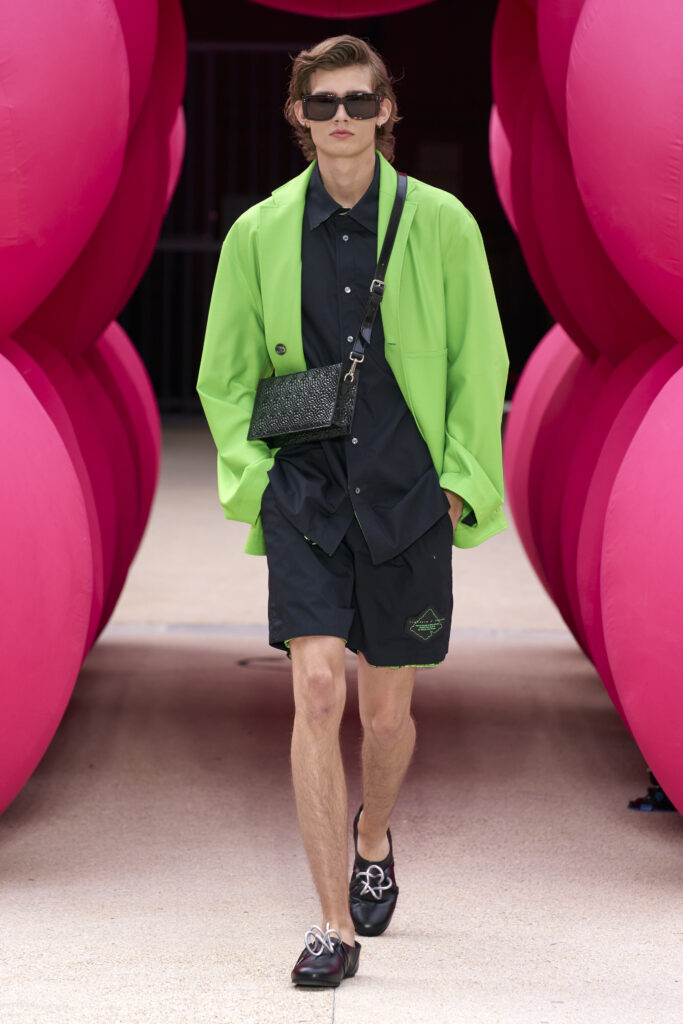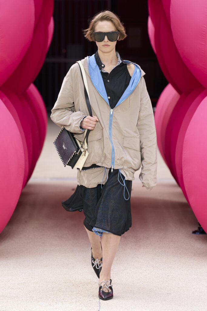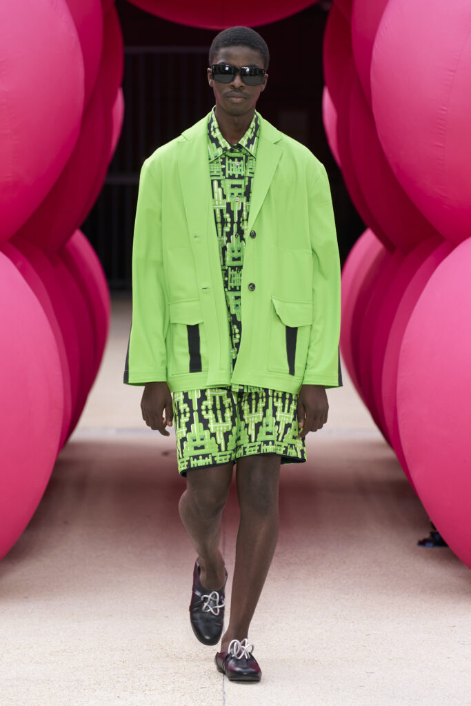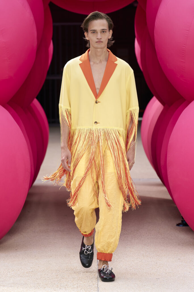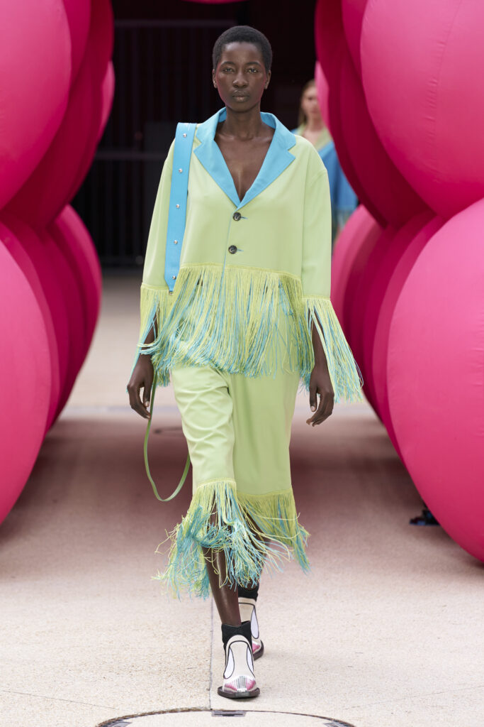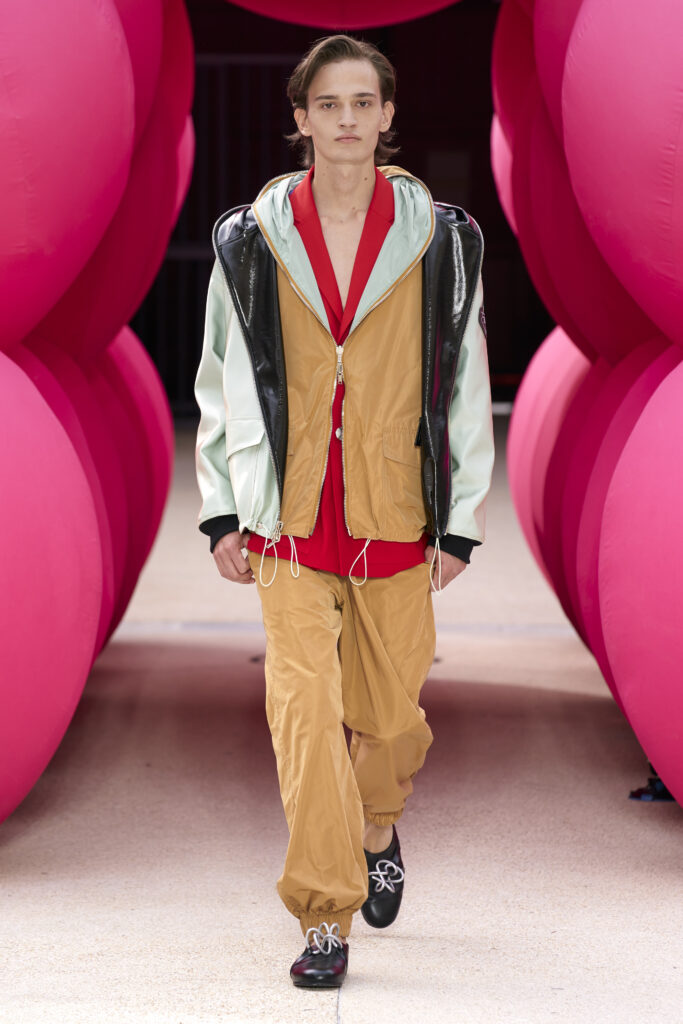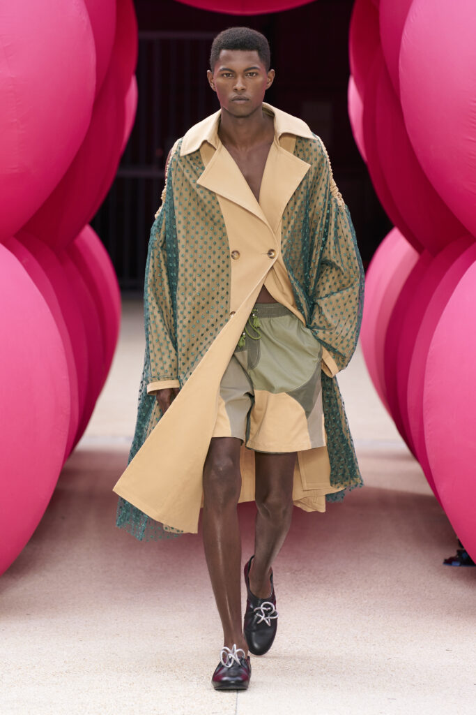 Les imprimés surréalistes, imaginés par Edward Crutchley, se joignent à cet imaginaire coloré, le tout agrémenté de lunettes Linda Farrow. Les couleurs sable, khaki et grège rappellent le calme d’un désert, auquel des plages de couleurs fluo viennent s’engouffrer, sous le rythme frénétique du live de Lewis Ofman.