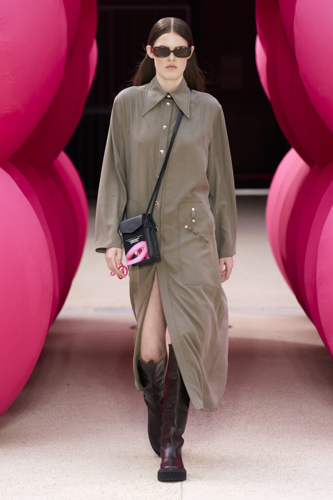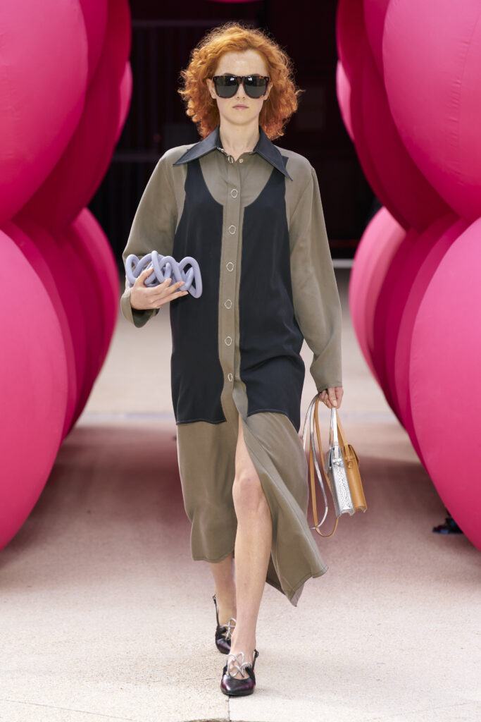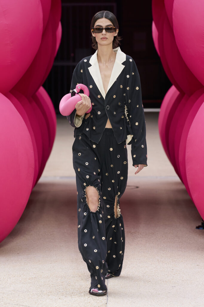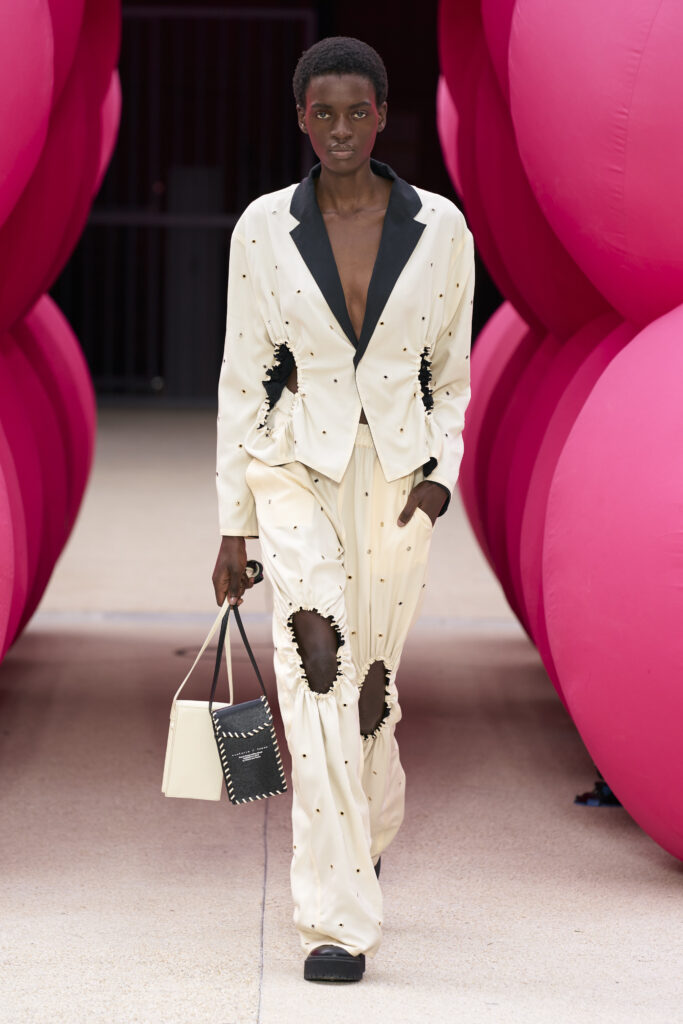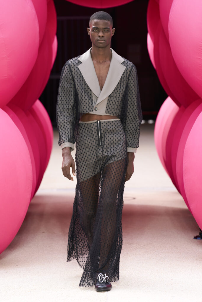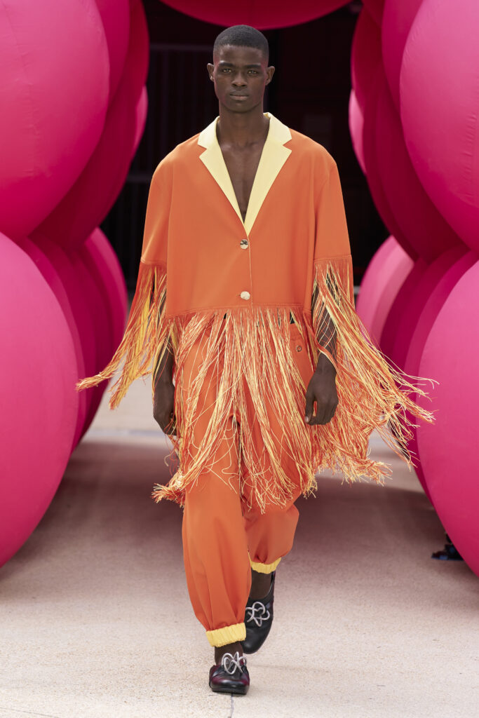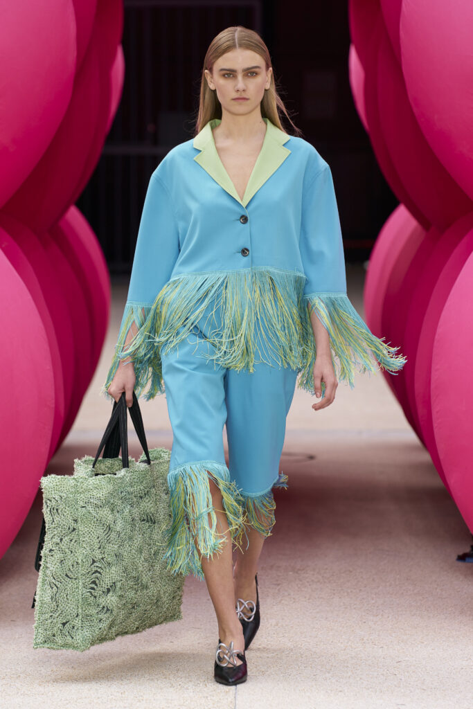 Les imprimés surréalistes, imaginés par Edward Crutchley, se joignent à cet imaginaire coloré, le tout agrémenté de lunettes Linda Farrow. Les couleurs sable, khaki et grège rappellent le calme d’un désert, auquel des plages de couleurs fluo viennent s’engouffrer, sous le rythme frénétique du live de Lewis Ofman.