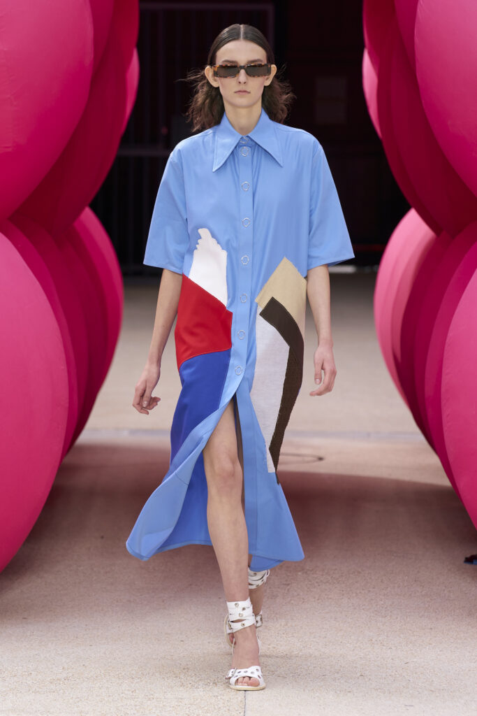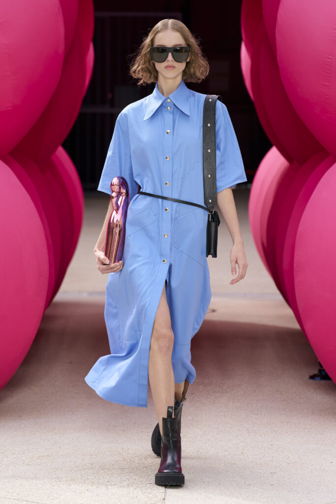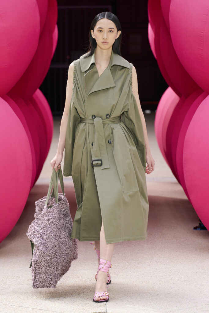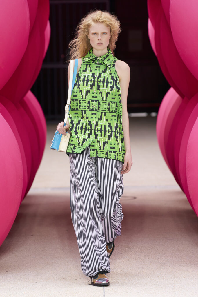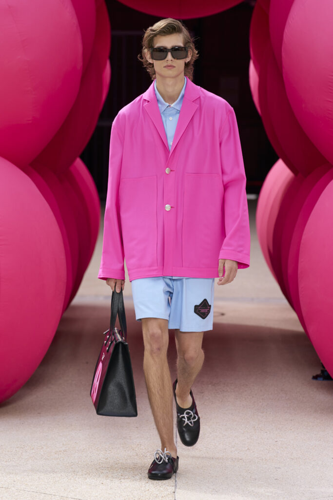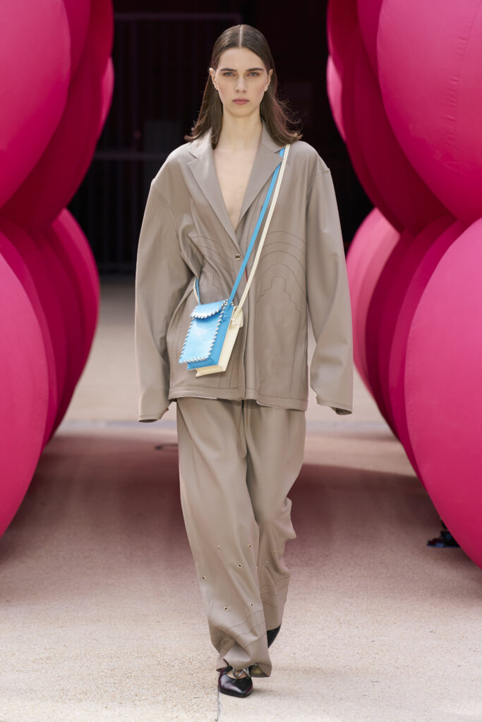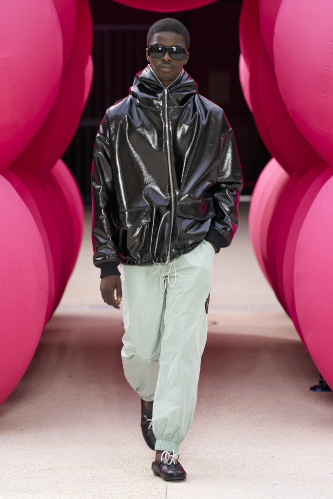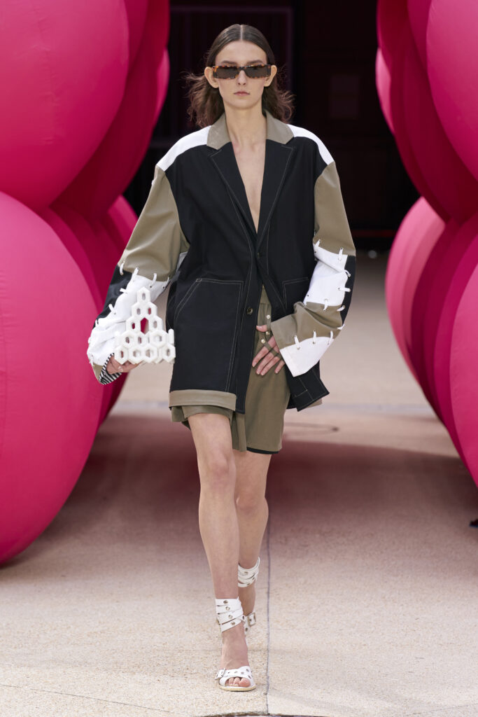 Les imprimés surréalistes, imaginés par Edward Crutchley, se joignent à cet imaginaire coloré, le tout agrémenté de lunettes Linda Farrow. Les couleurs sable, khaki et grège rappellent le calme d’un désert, auquel des plages de couleurs fluo viennent s’engouffrer, sous le rythme frénétique du live de Lewis Ofman.
