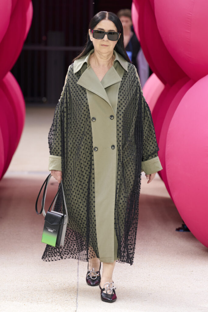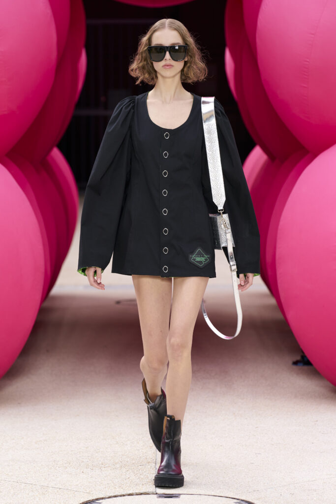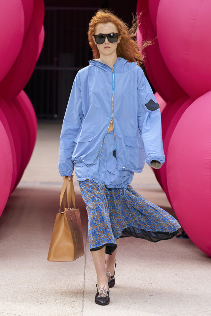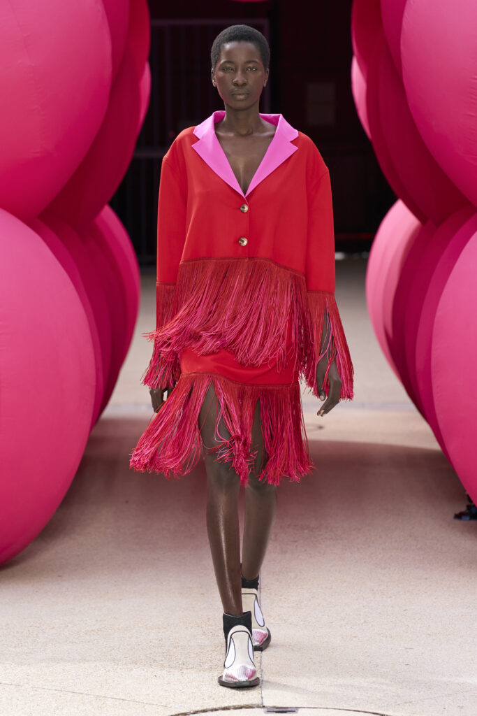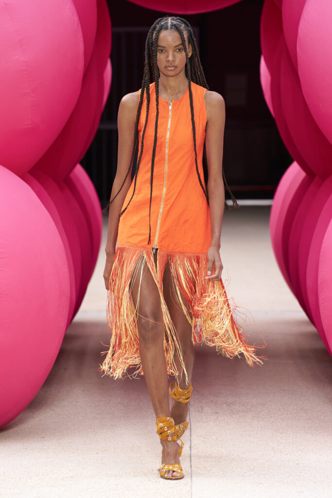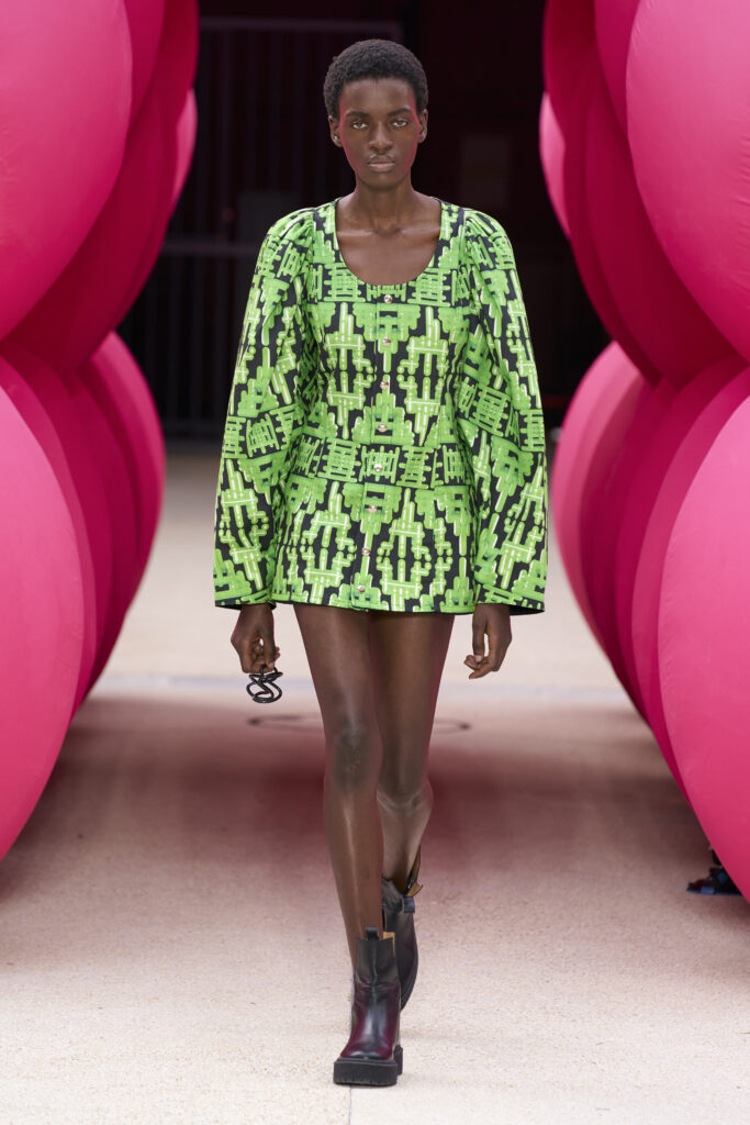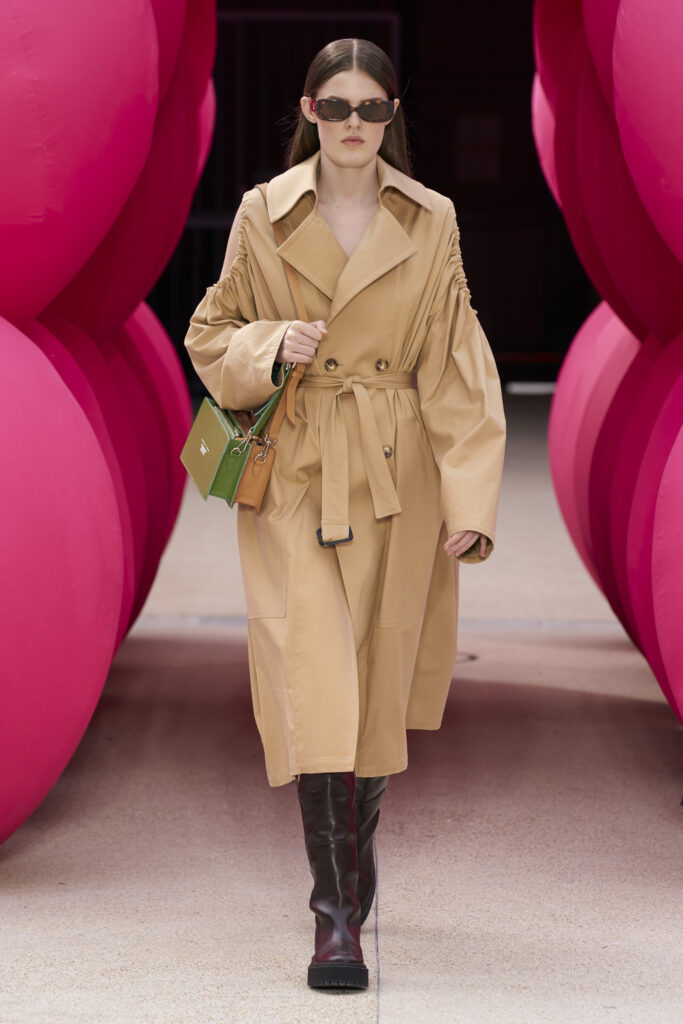 Les imprimés surréalistes, imaginés par Edward Crutchley, se joignent à cet imaginaire coloré, le tout agrémenté de lunettes Linda Farrow. Les couleurs sable, khaki et grège rappellent le calme d’un désert, auquel des plages de couleurs fluo viennent s’engouffrer, sous le rythme frénétique du live de Lewis Ofman.