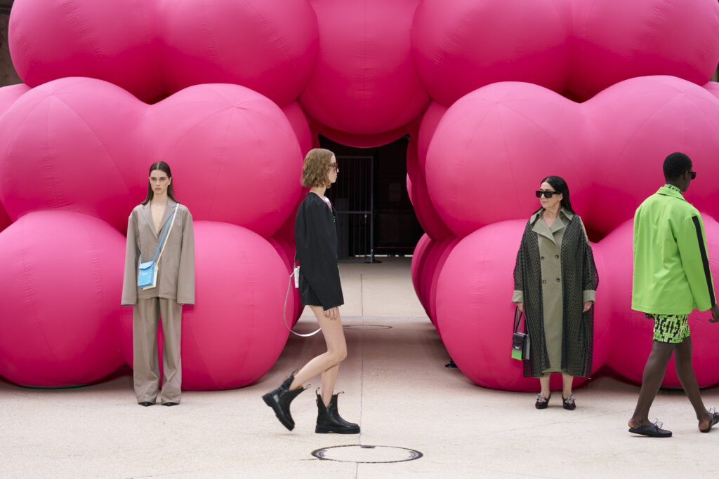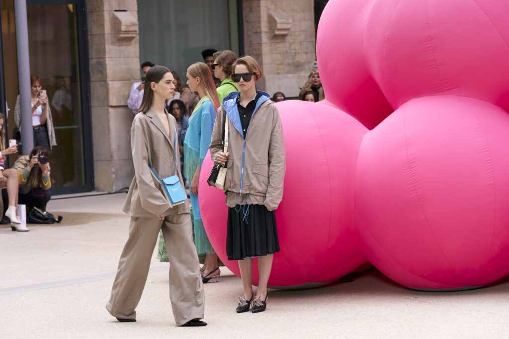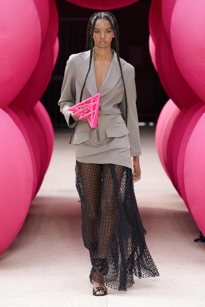 La pyramide gonflable rose fluo au centre du catwalk, sert d’inspiration de base à la collection. Fruit de l’imagination de l’artiste Cyril Lancelin, elle met en lumière l’idée de Mirage. Son travail, entre digital et physique ainsi que son utilisation de matériaux recyclés se joint à la vision de Victoria et Tomas.