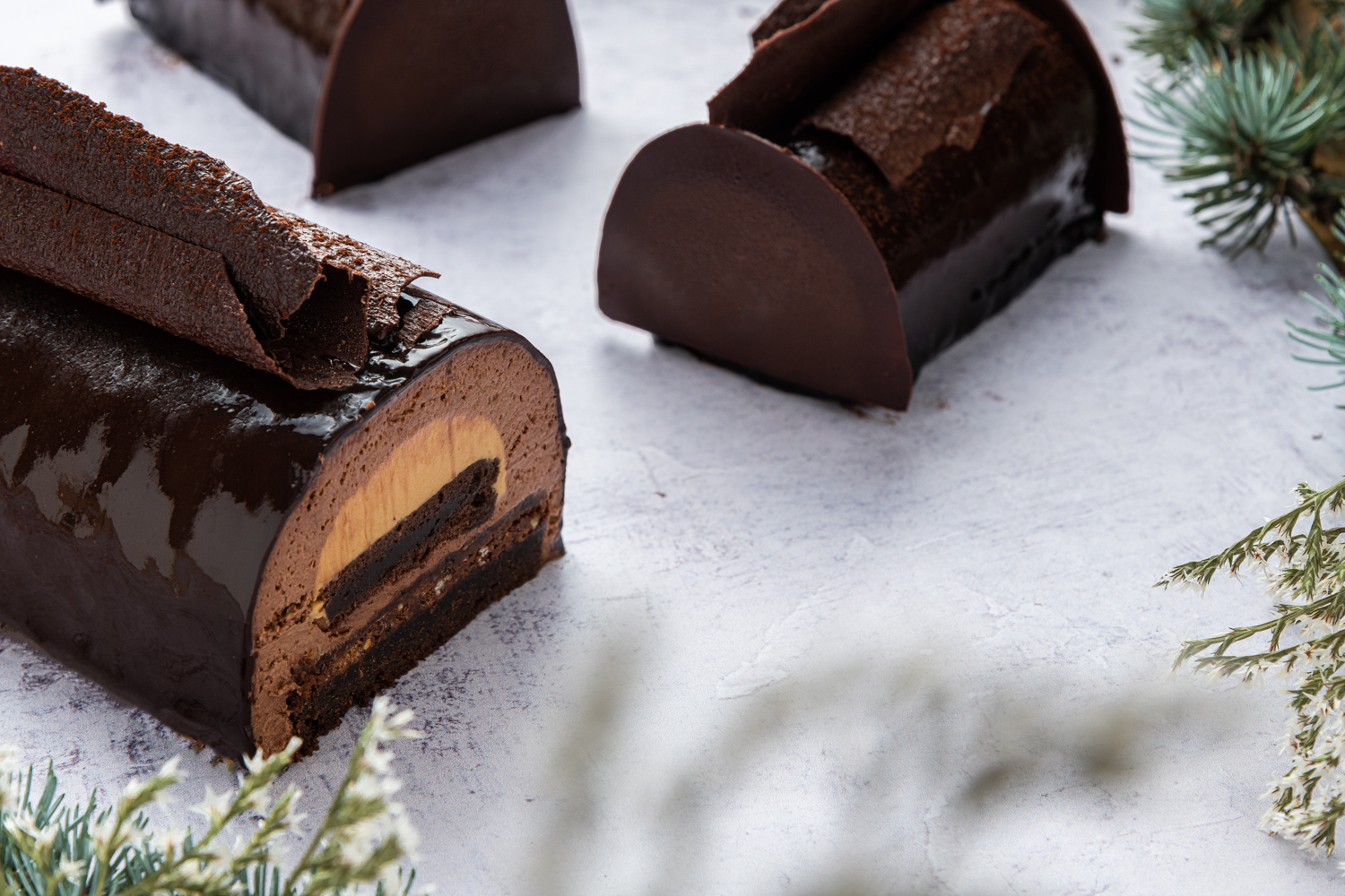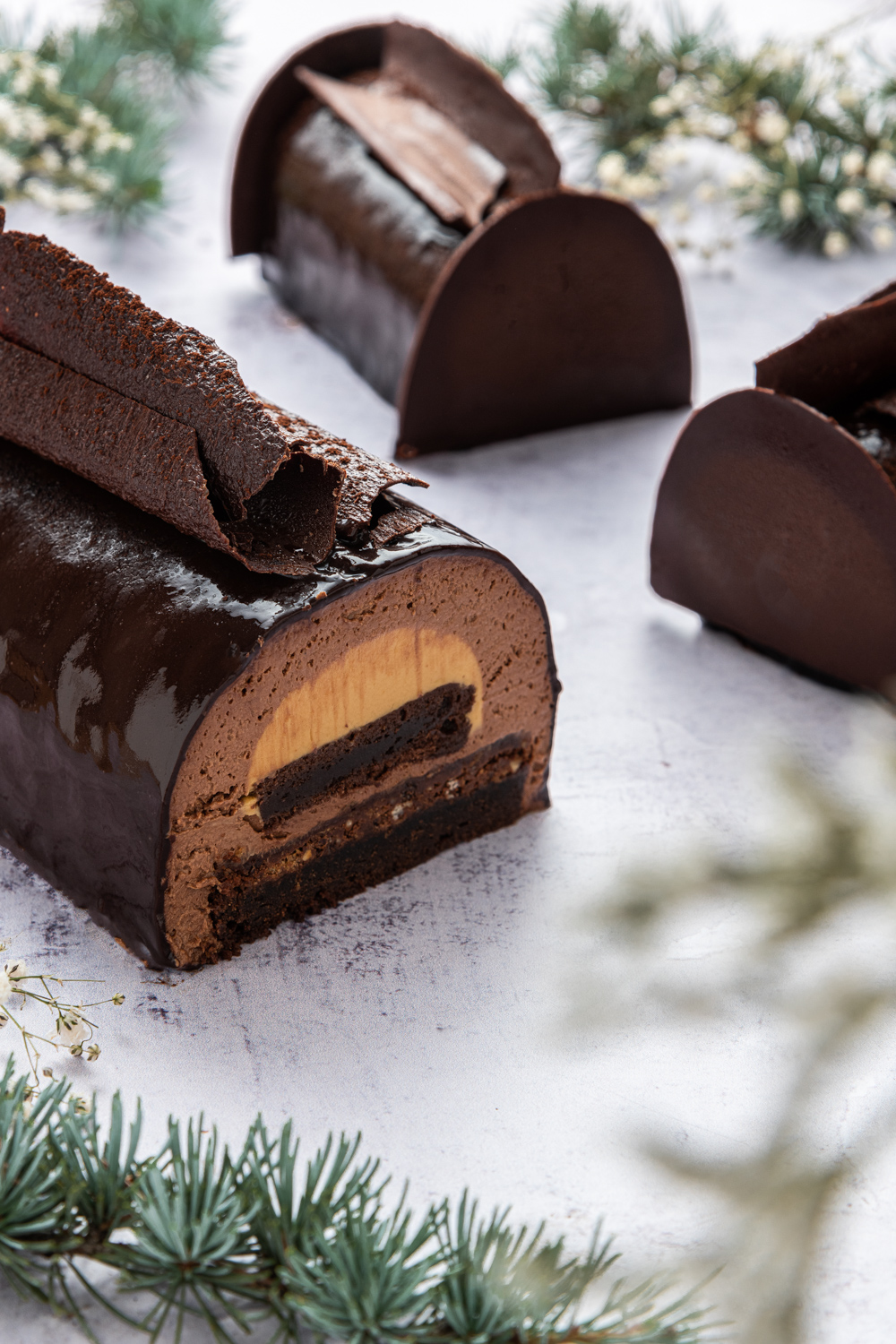 La bûche au chocolat, caramel et tonka est la bûche de Noël par excellence qui plaira à tous !