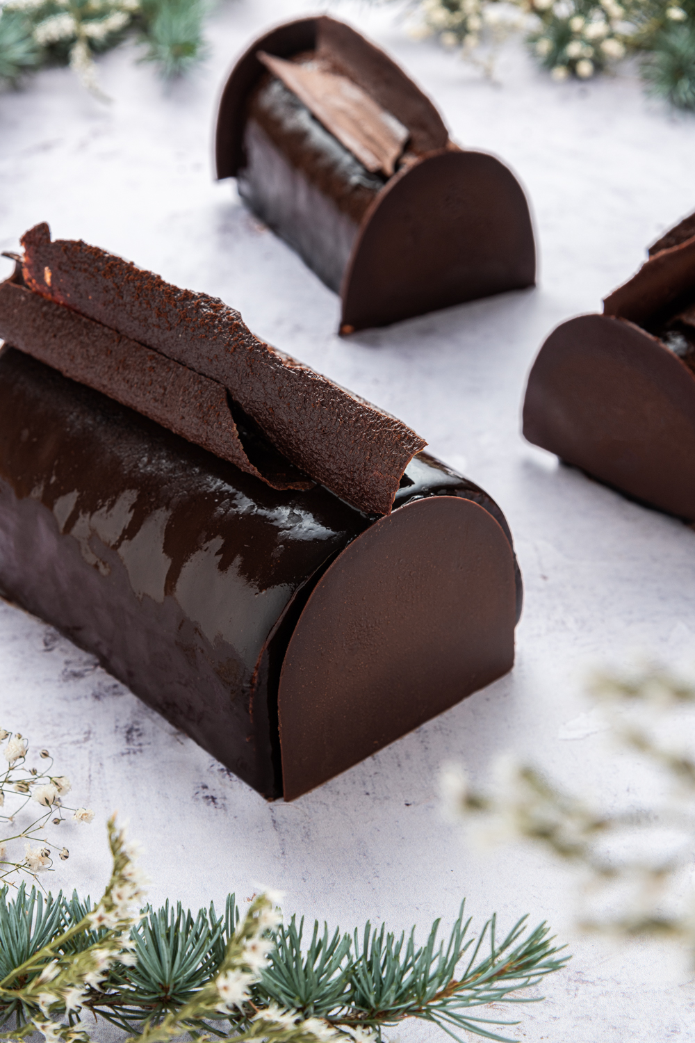 Elle se compose d’un biscuit moelleux au chocolat doux surmonté d’un biscuit croustillant travaillé au sucre muscovado, apportant toute sa mâche à la bûche.