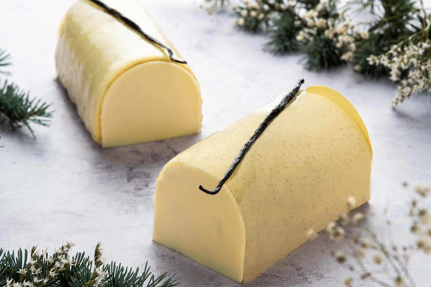 Découvrez un croustillant duja et vanille constituant la base de la bûche, contrastant avec la texture moelleuse d’un biscuit roulé vanille dans lequel est poché un crémeux à la vanille de Madagascar.