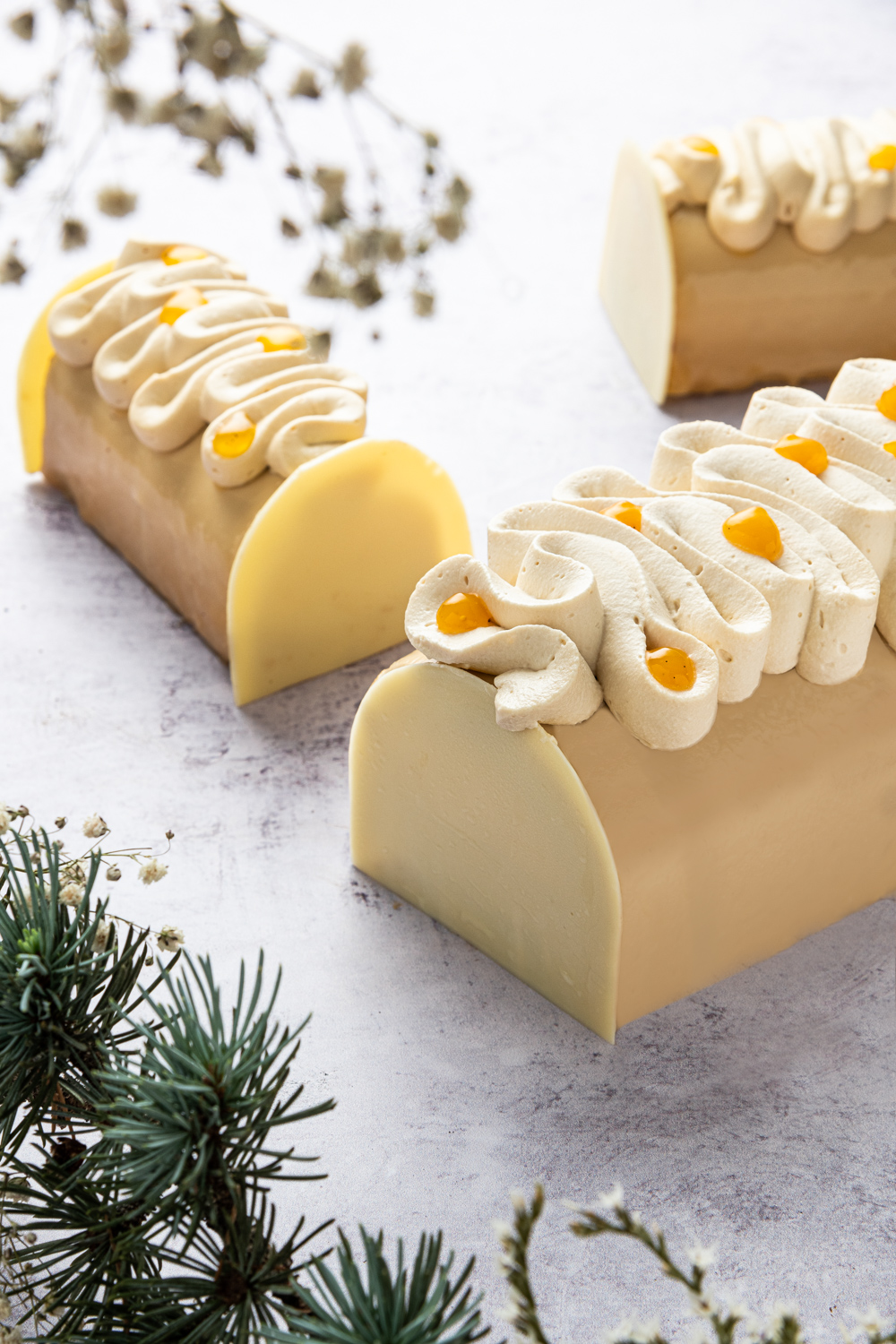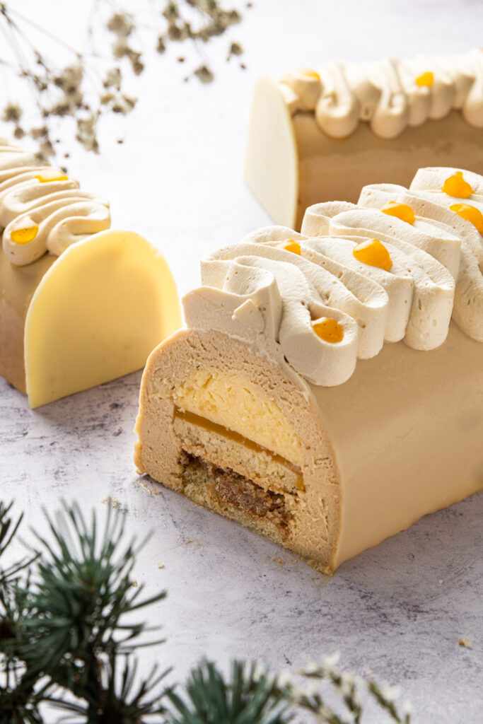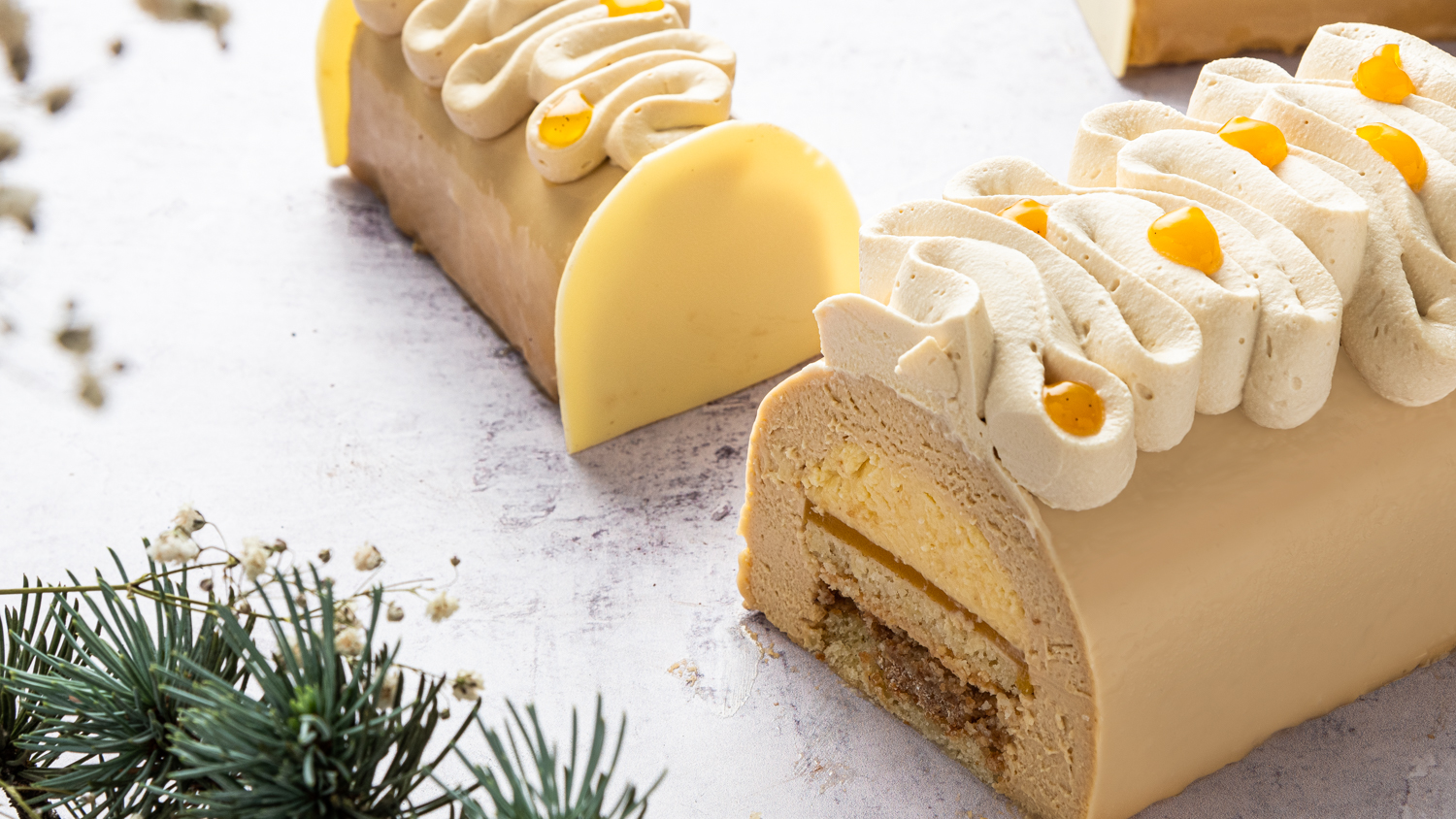 Une délicate mousse dulce de leche entre en scène pour recouvrir ces deux couches de biscuits. Cette dernière apporte douceur et gourmandise à la bûche, contrastant avec un crémeux vif au yuzu et un confit de kumquat,