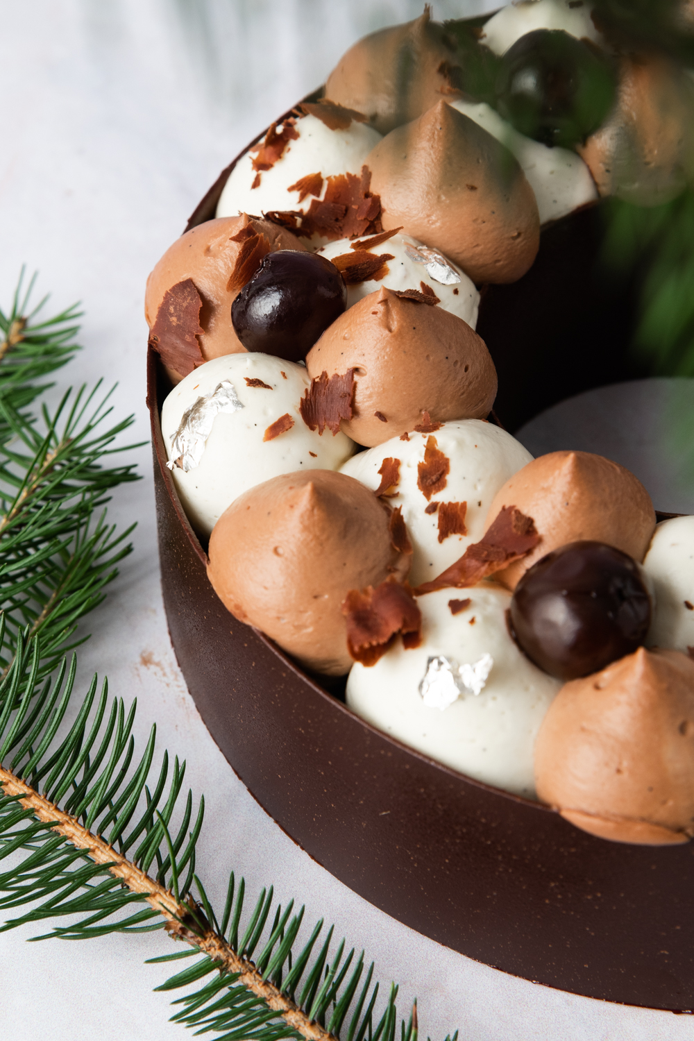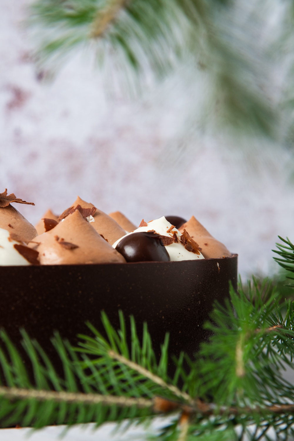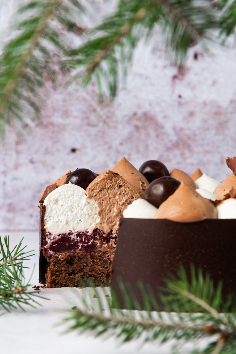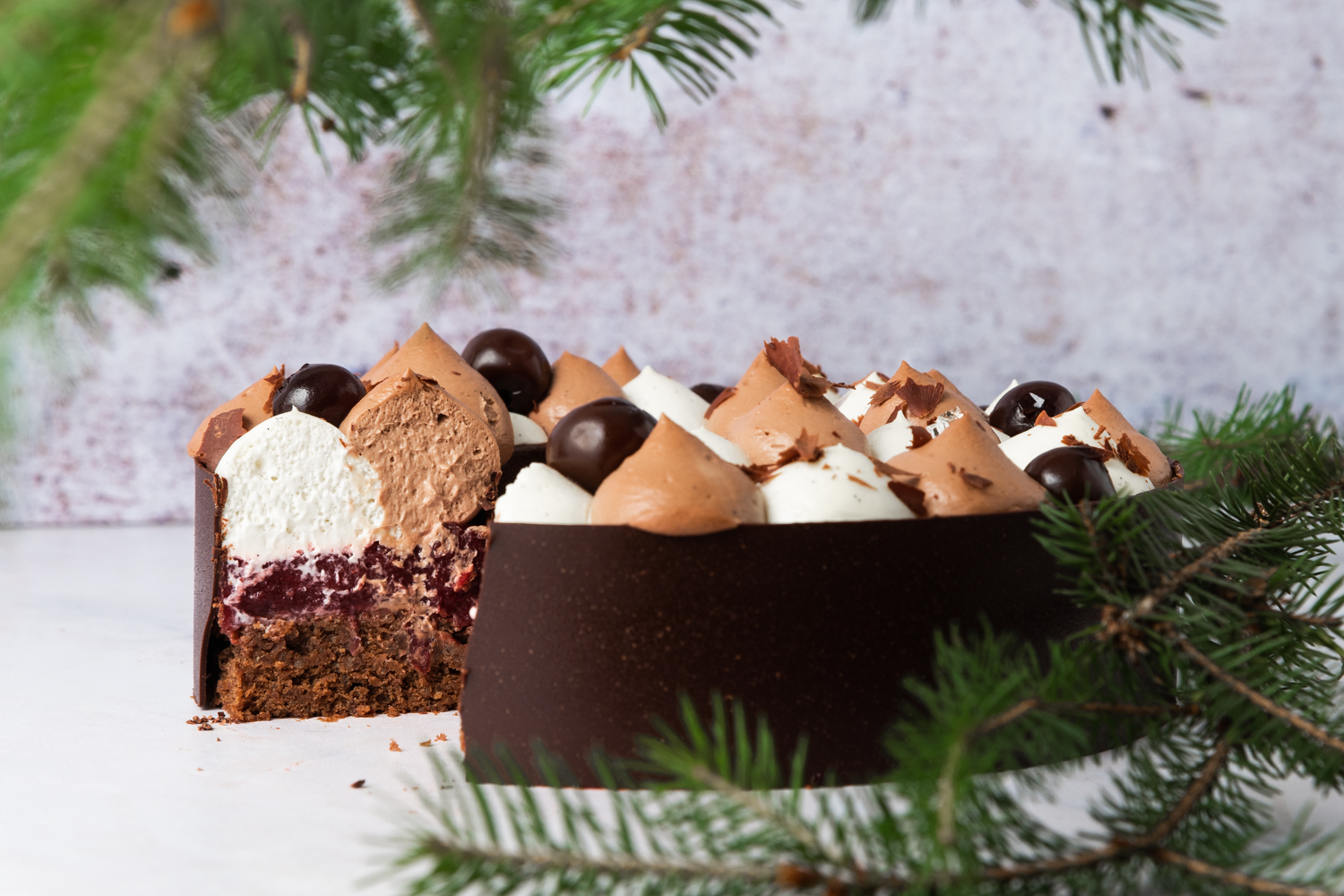 Pour cette création exclusive Philippe Conticini Paris x Galeries Lafayette Gourmet, le Chef Philippe Conticini vous invite dans son univers empli d’émotions à déguster cette Forêt-Noire, conviviale et gourmande à souhaits. Découvrez l’onctuosité d’une crème au chocolat noir adoucie grâce à une crème fouettée mascarpone à la vanille très soyeuse en bouche, toutes deux pochées sur un confit de cerises Amarena, une petite griotte italienne confite avec beaucoup de goût et aux légères notes d’amande. La dégustation se poursuit avec un moelleux biscuit au chocolat constituant la base de ce gâteau, pour finalement se conclure avec quelques cerises Amarena déposées sur les crèmes, apportant gourmandise, mâche et brillance. Ces dernières sont soulignées par des copeaux de chocolat noir et quelques feuilles argentées. Le tout est encerclé dans une coque en chocolat, de quoi craquer à coup sûr pour cette Forêt-Noire !