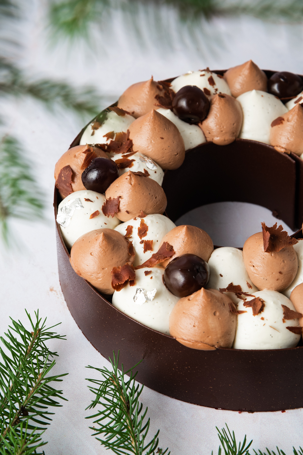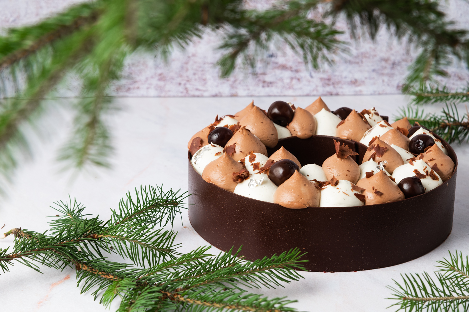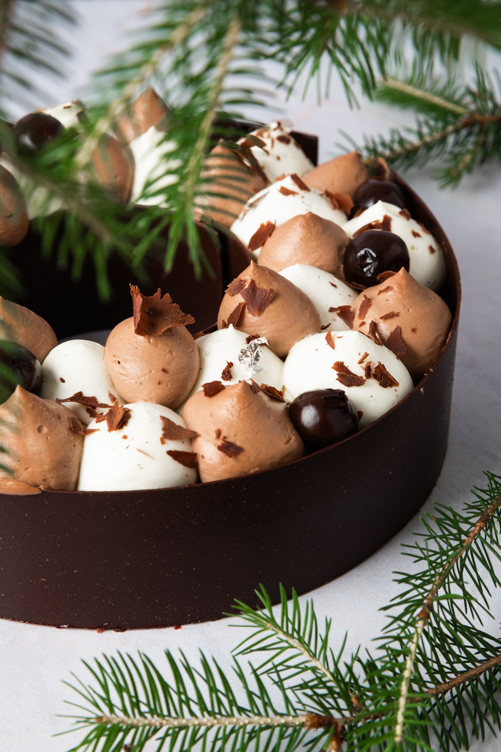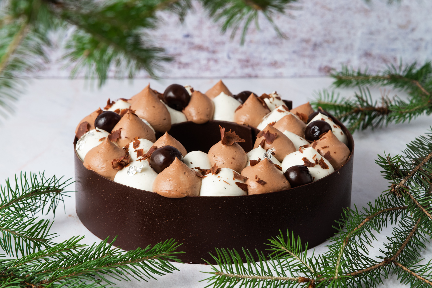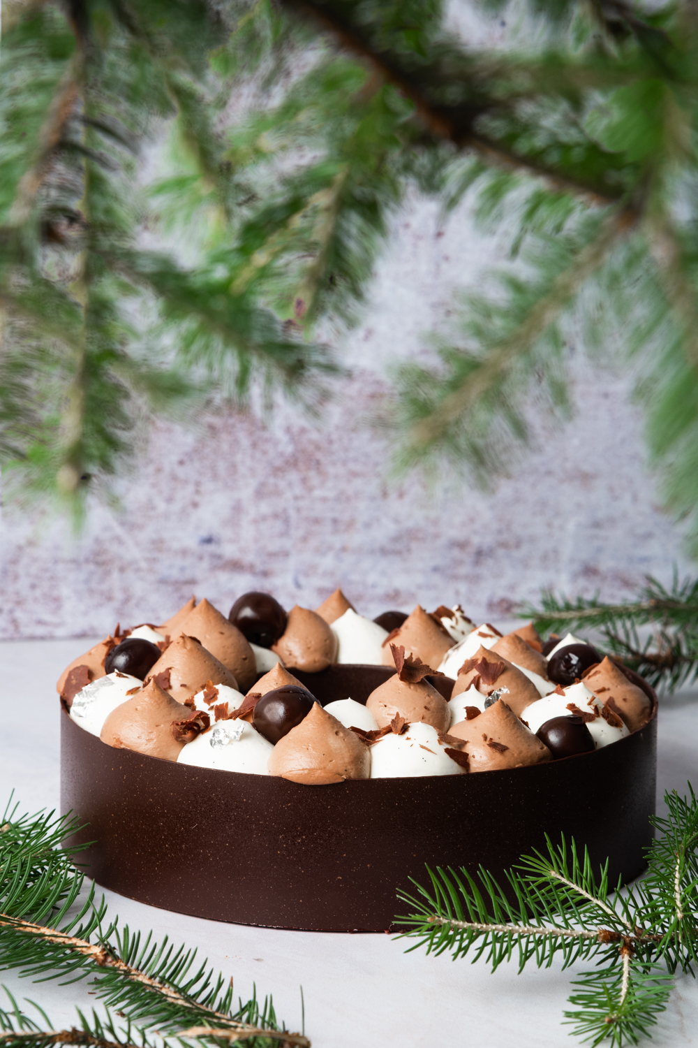 Pour cette création exclusive Philippe Conticini Paris x Galeries Lafayette Gourmet, le Chef Philippe Conticini vous invite dans son univers empli d’émotions à déguster cette Forêt-Noire, conviviale et gourmande à souhaits. Découvrez l’onctuosité d’une crème au chocolat noir adoucie grâce à une crème fouettée mascarpone à la vanille très soyeuse en bouche, toutes deux pochées sur un confit de cerises Amarena, une petite griotte italienne confite avec beaucoup de goût et aux légères notes d’amande. La dégustation se poursuit avec un moelleux biscuit au chocolat constituant la base de ce gâteau, pour finalement se conclure avec quelques cerises Amarena déposées sur les crèmes, apportant gourmandise, mâche et brillance. Ces dernières sont soulignées par des copeaux de chocolat noir et quelques feuilles argentées. Le tout est encerclé dans une coque en chocolat, de quoi craquer à coup sûr pour cette Forêt-Noire !