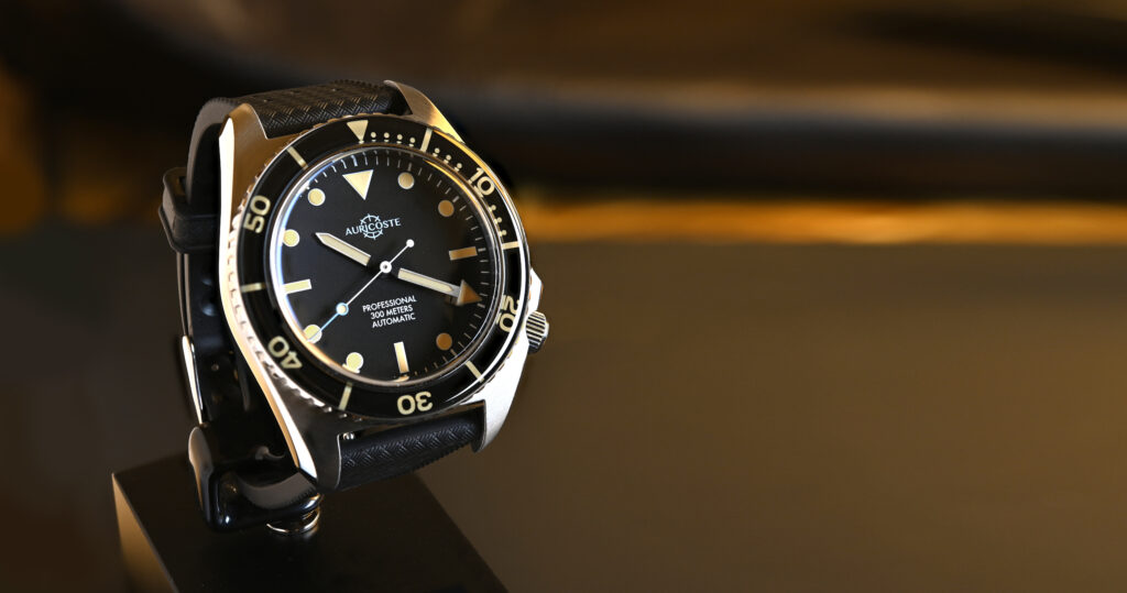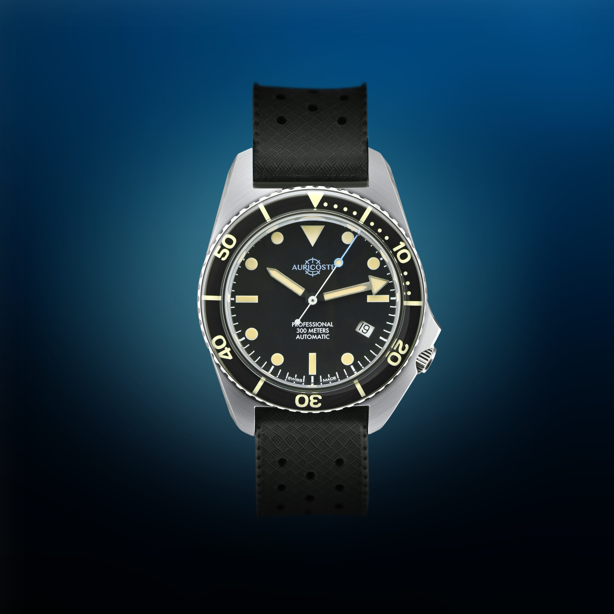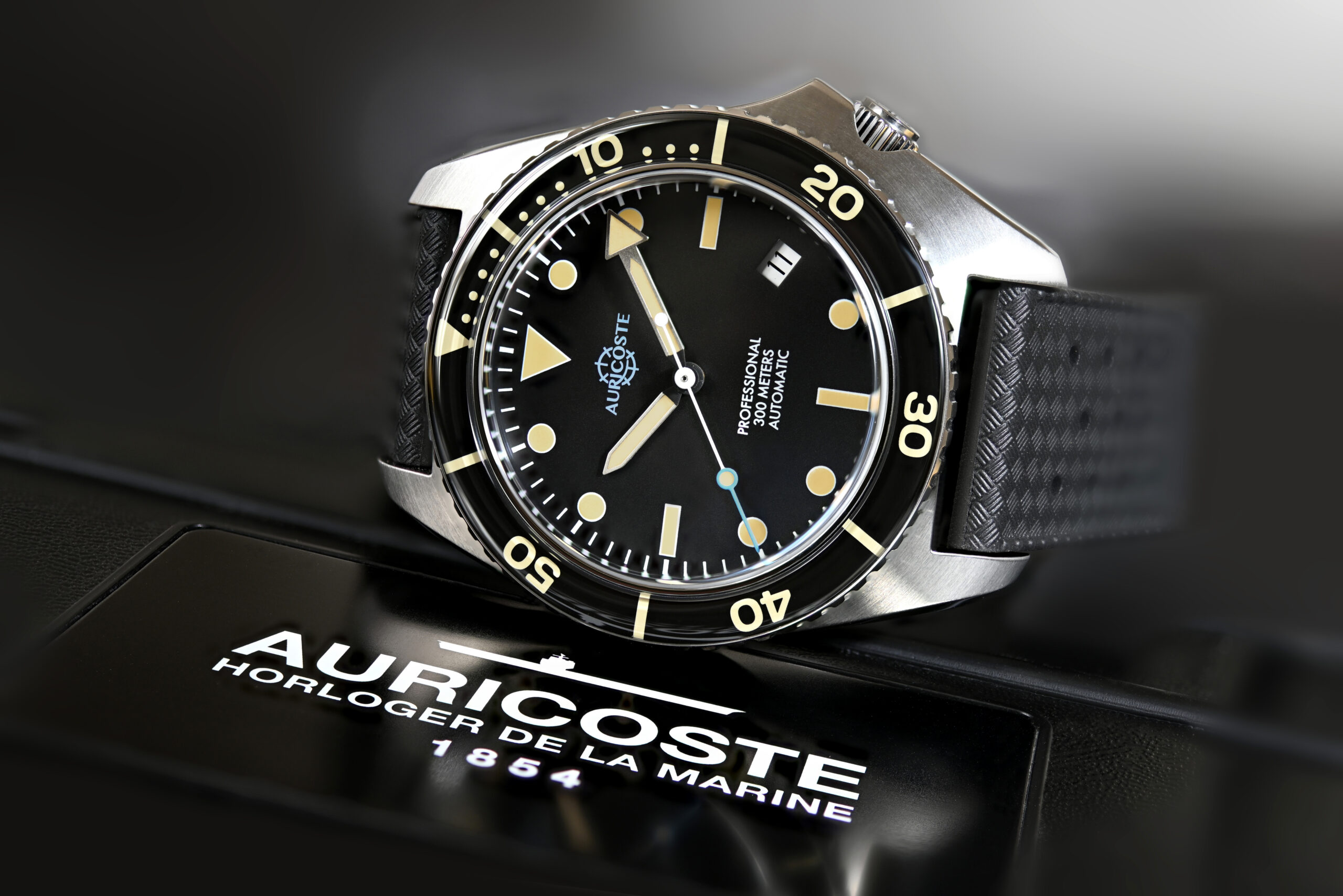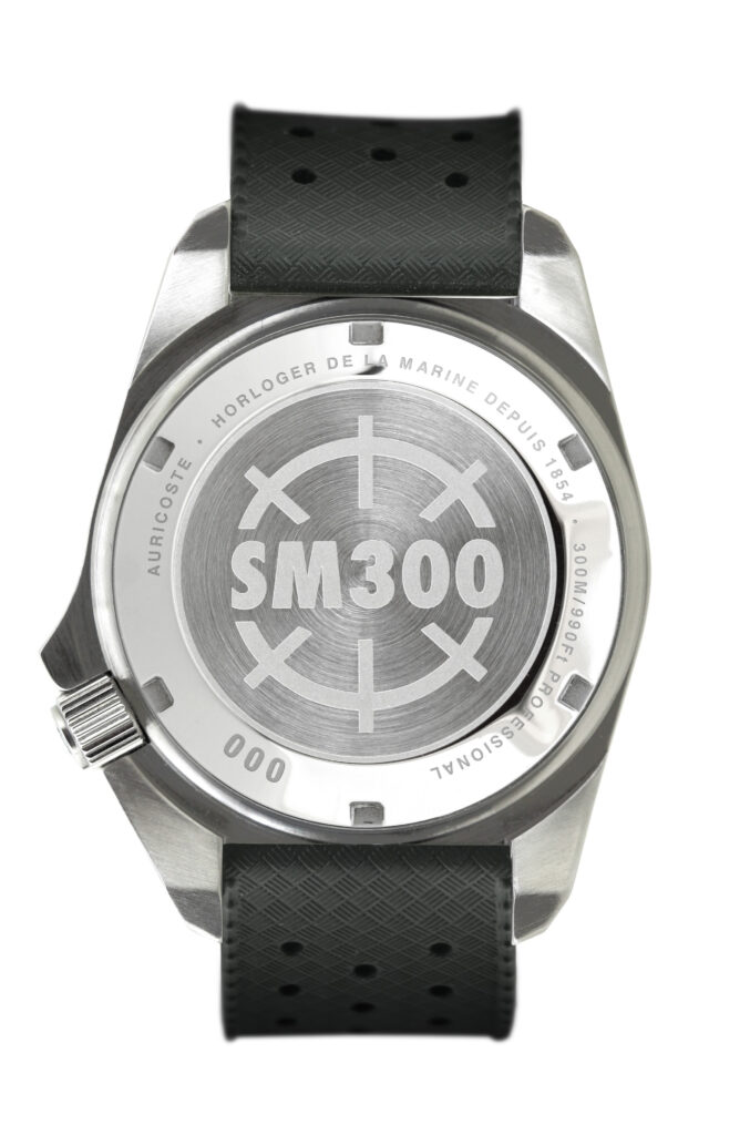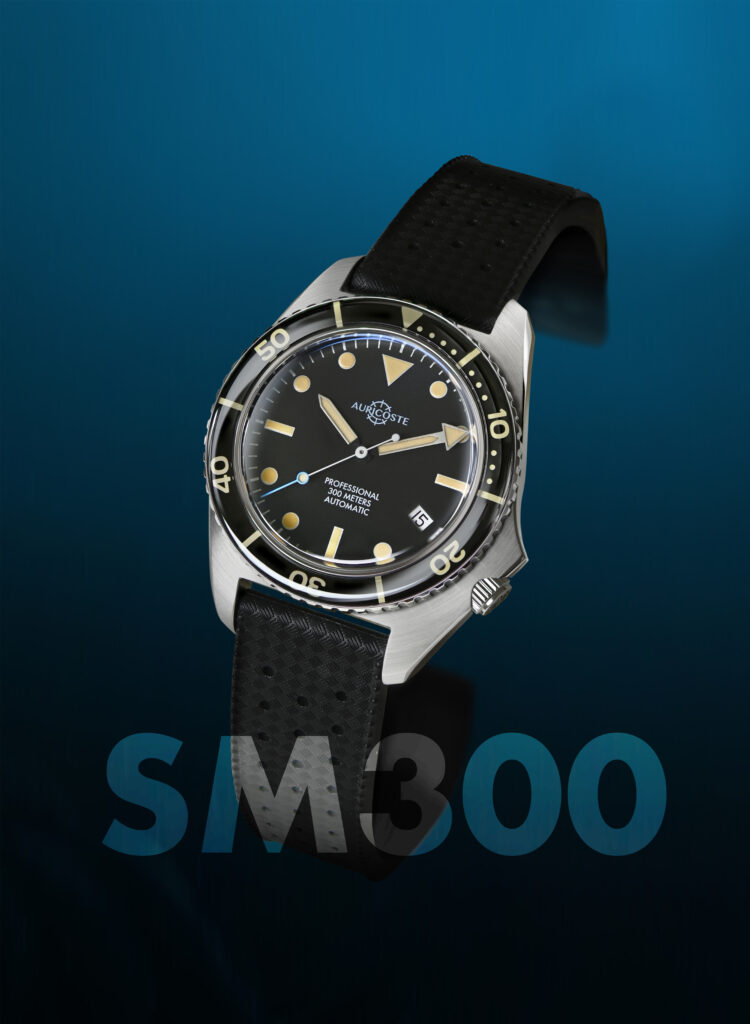 Digne héritière de la célèbre plongeuse des nageurs de combats et plongeurs démineurs de la Marine Nationale, la nouvelle Auricoste SM300 évolue à 300 mètres de profondeur, se dote d’un boitier en acier brossé 316L de 40mm, d’un verre saphir « Dôme » et d’une lunette bombée, elle aussi en verre saphir, pour un look vintage.