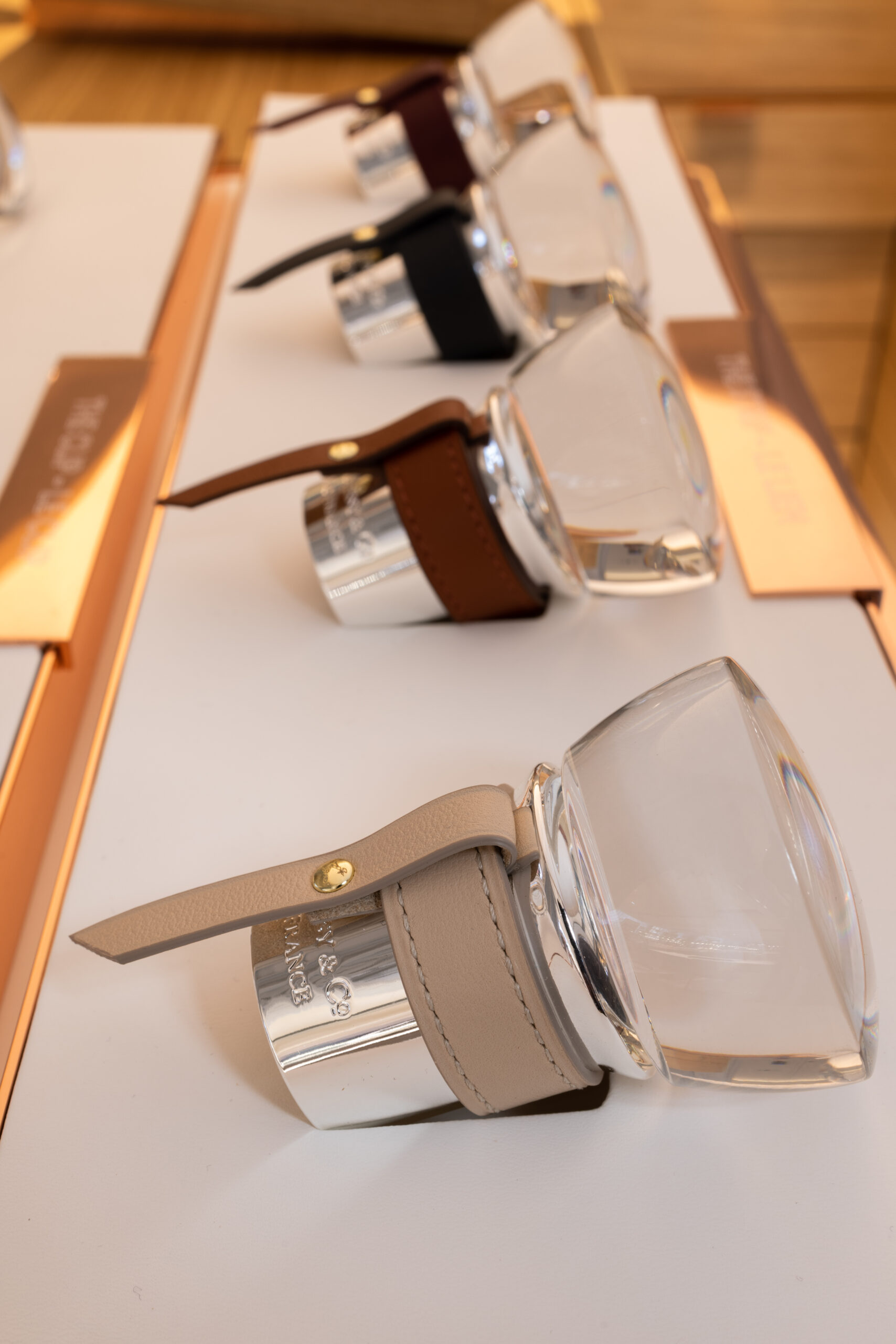 Argentée, dorée ou teintée de bronze, il sera possible de personnaliser sa carafe en faisant graver ses initiales aux esquisses de son choix. Une gravure exclusive qui n’est pas sans rappeler la calligraphie que les experts apposent sur les fûts les plus précieux de la Maison Hennessy. Qu’il préfère le « beige » en illustration à la couleur inégalée de la pierre de Charente, le « marron » en référence à celle si particulière de la terre et des pieds de vignes qui ornent la Charente, le « rouge » en hommage à la couleur de la veste de Richard Hennessy, son Fondateur ou encore le « gris » en écho au chai du Fondateur, lieu singulier qui renferme les eaux-de-vie les plus précieuses de la Maison Hennessy, le visiteur pourra personnaliser sa carafe en choisissant un accessoire (clip ou lien) en cuir puis en sélectionnant la couleur de son choix. Epousant harmonieusement le col de la carafe, ces accessoires s’inspirent de l’art de la tonnellerie et des cerclages de bois qui habillent les barriques de la Maison Hennessy.