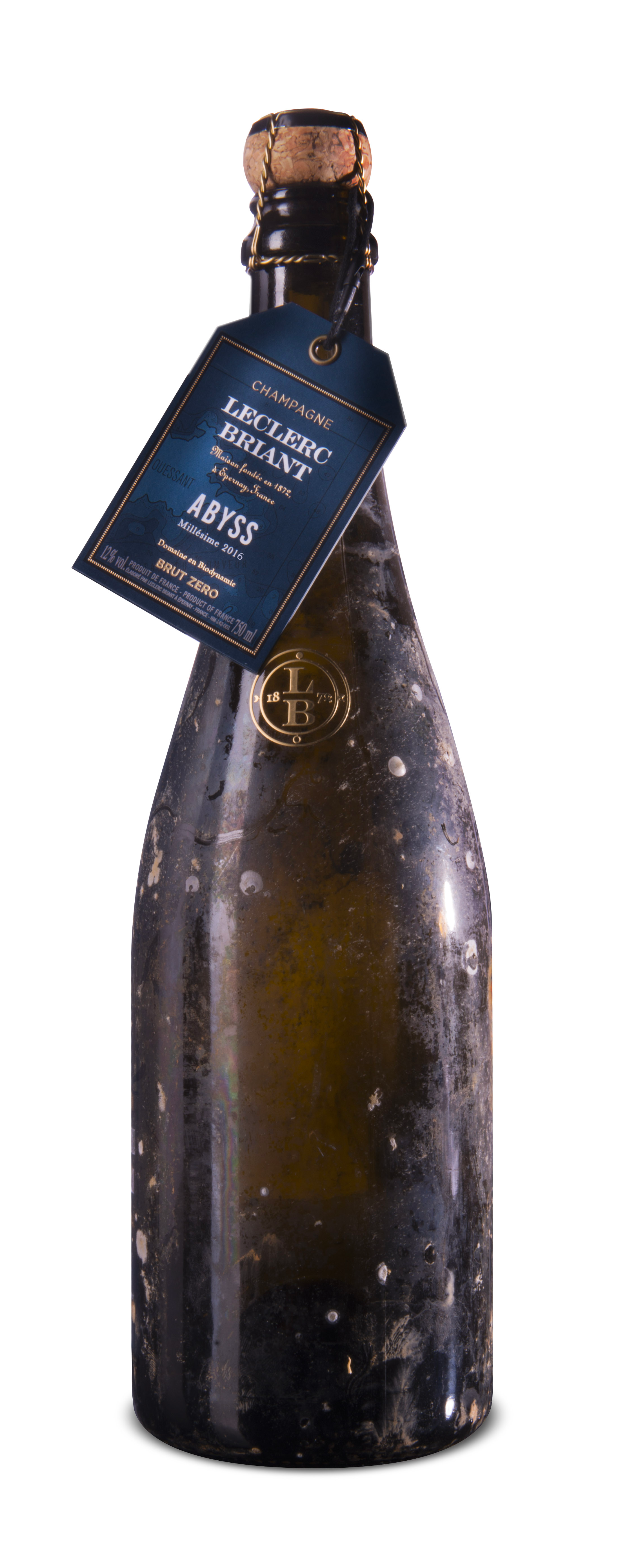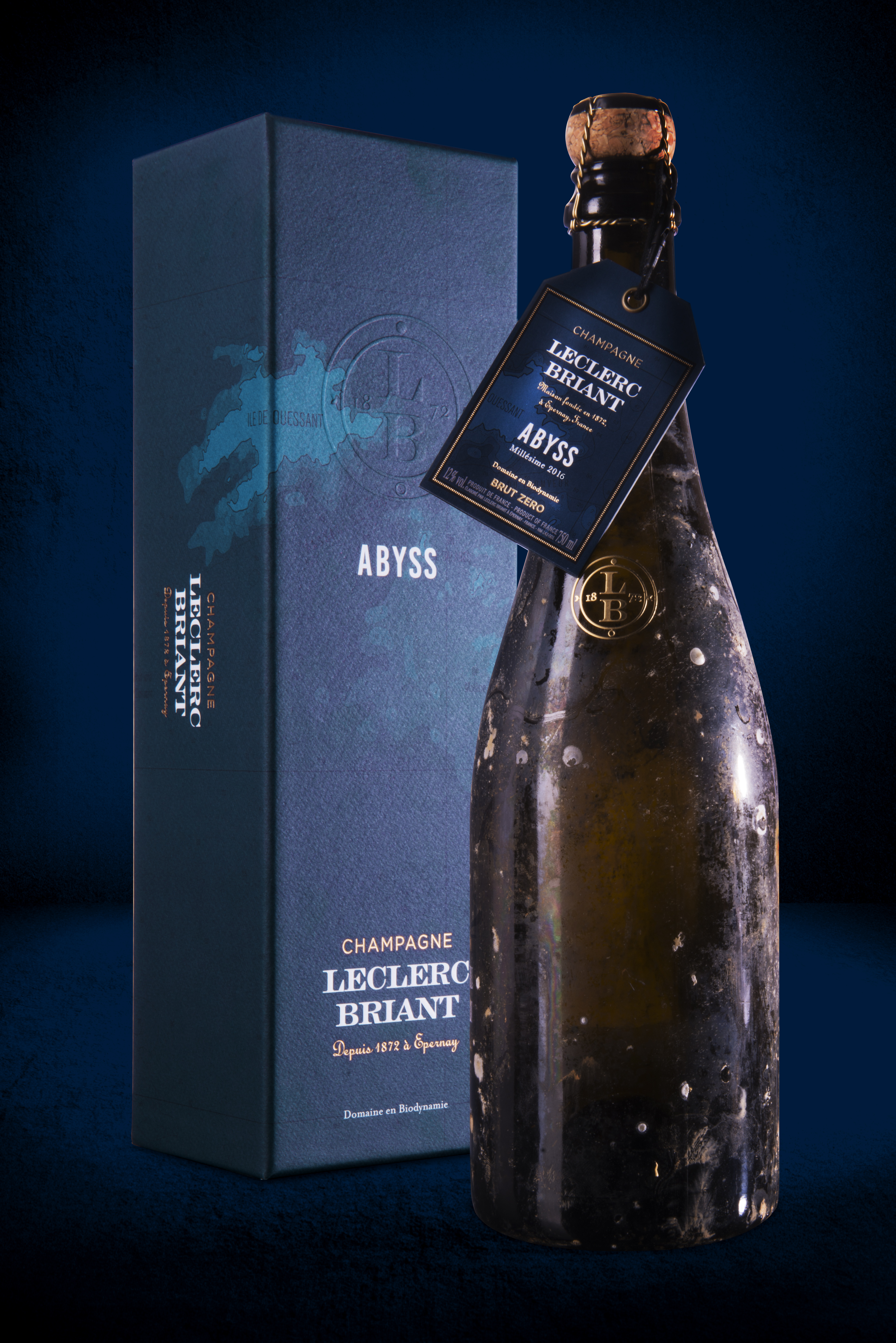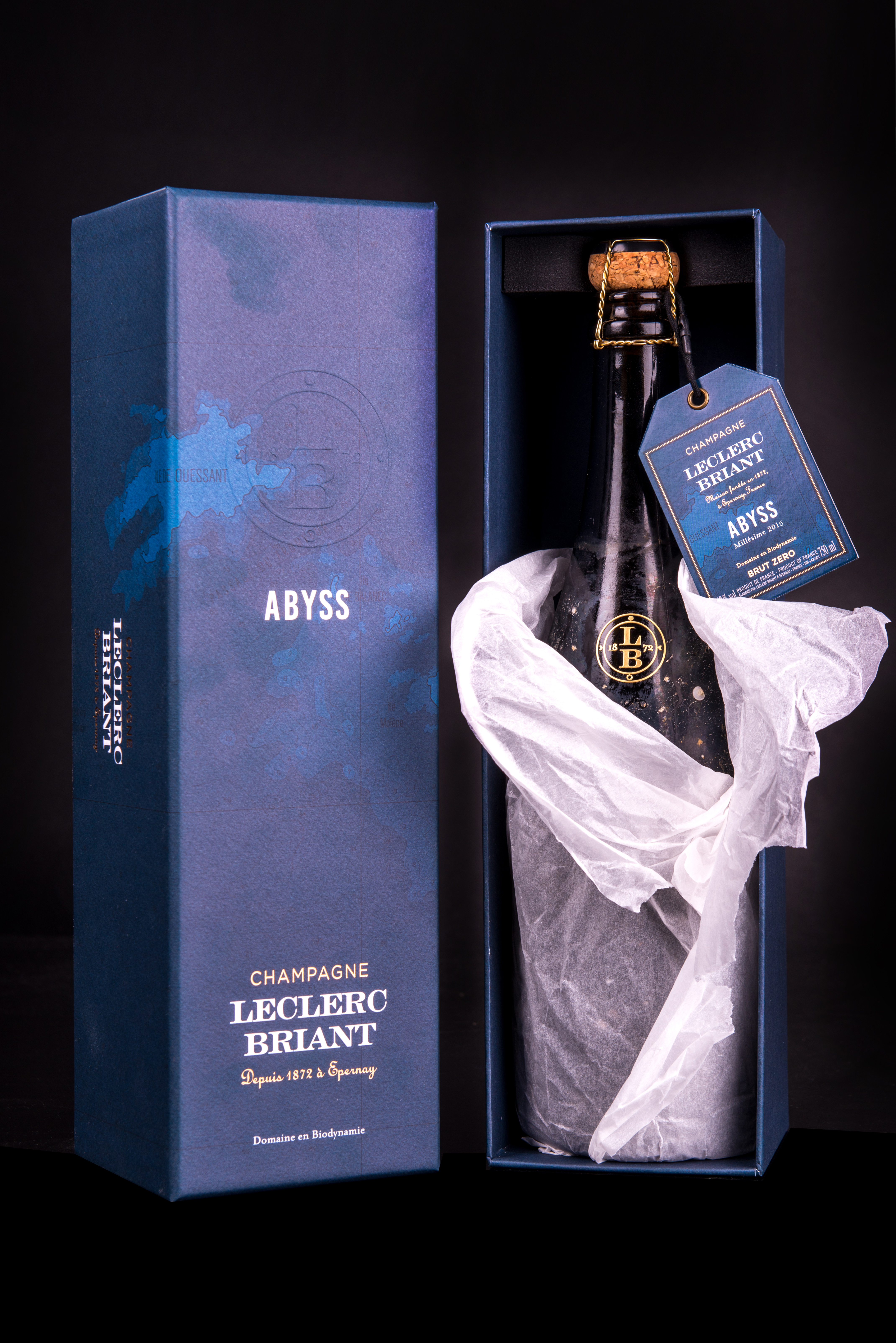 Abyss, cuvée unique spécialement dédiée à un affinage sous-marin, porte le caractère salin jusque sur sa bouteille, marquée par les vestiges d’une année passée à plus de 60 mètres de profondeur au large de l’Île de Ouessant en Bretagne.