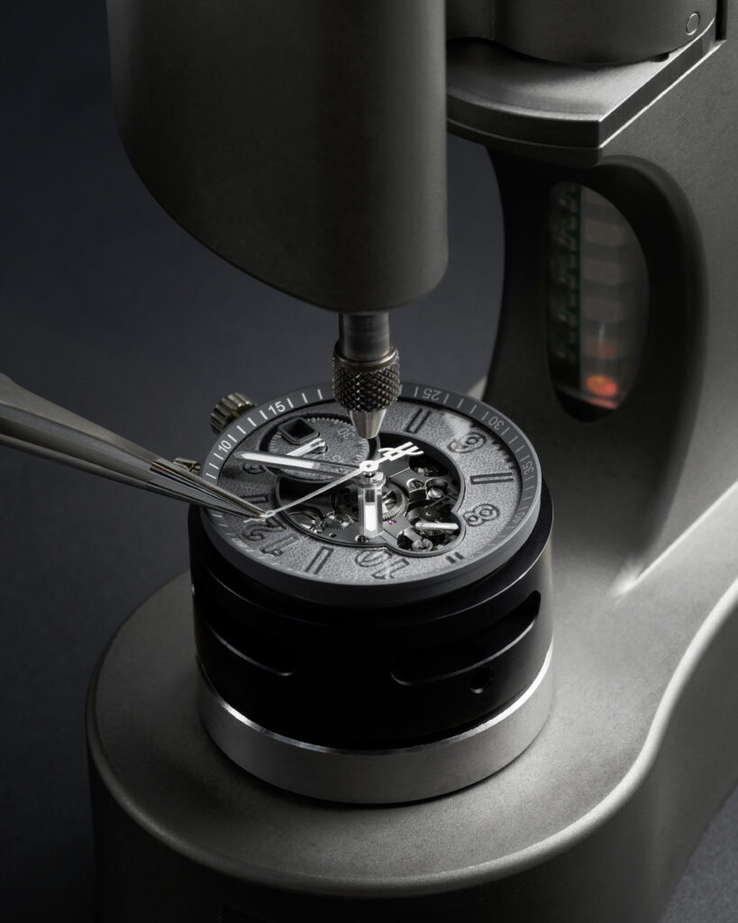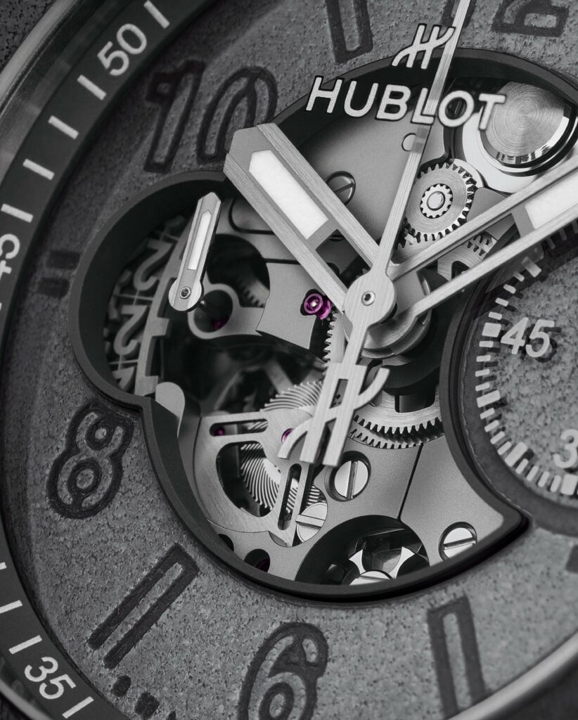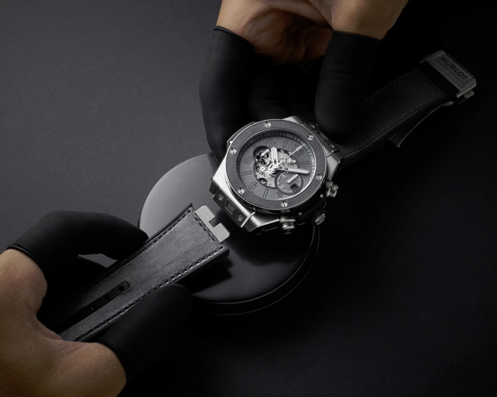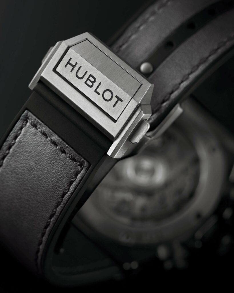 Pour ce modèle, Hublot a repris à son compte sa nouvelle conception de lunette, réalisée en deux parties. À l’aide d’une résine adhésive et rigide, la première pièce de la lunette – en cuir, d’environ 1mm d’épaisseur – est insérée sur la seconde en titane grise, puis vissée sur le boîtier de la montre. La lunette pourra donc continuer à se patiner au fil du temps, tout comme le bracelet.