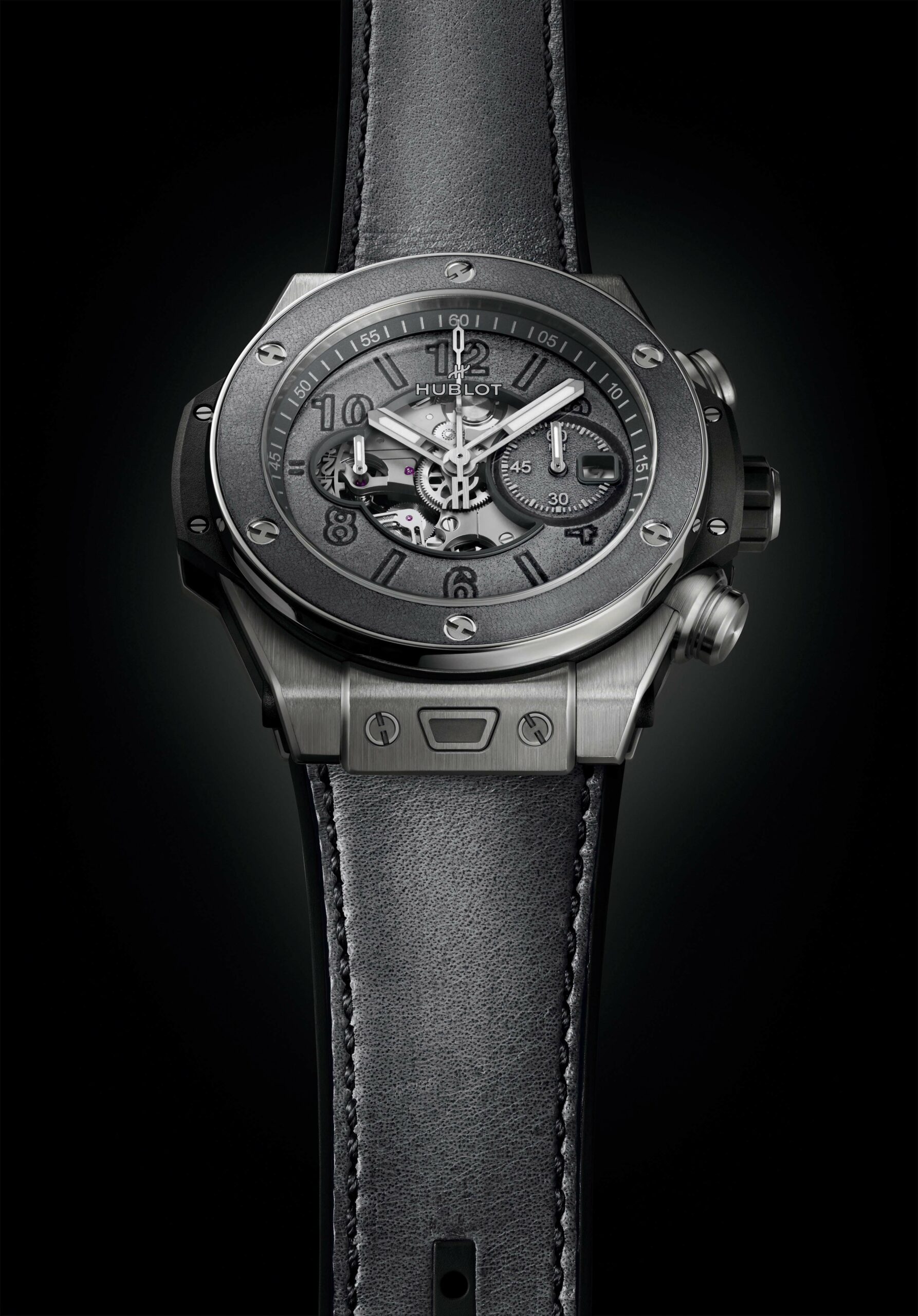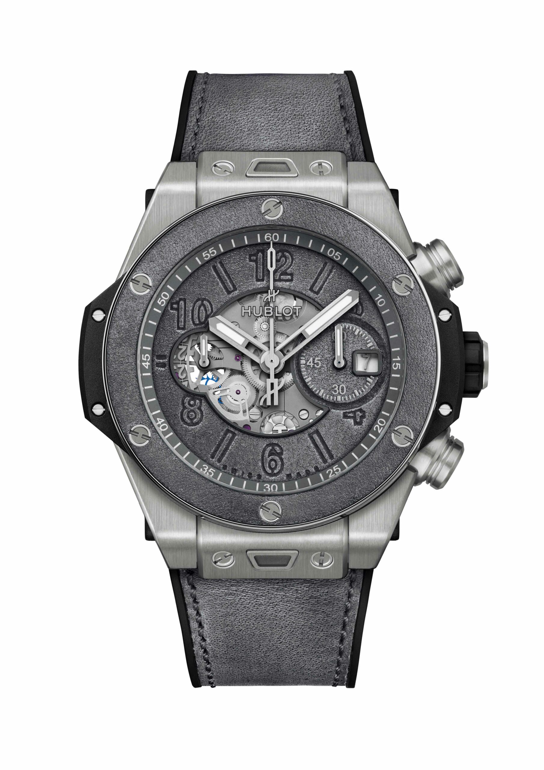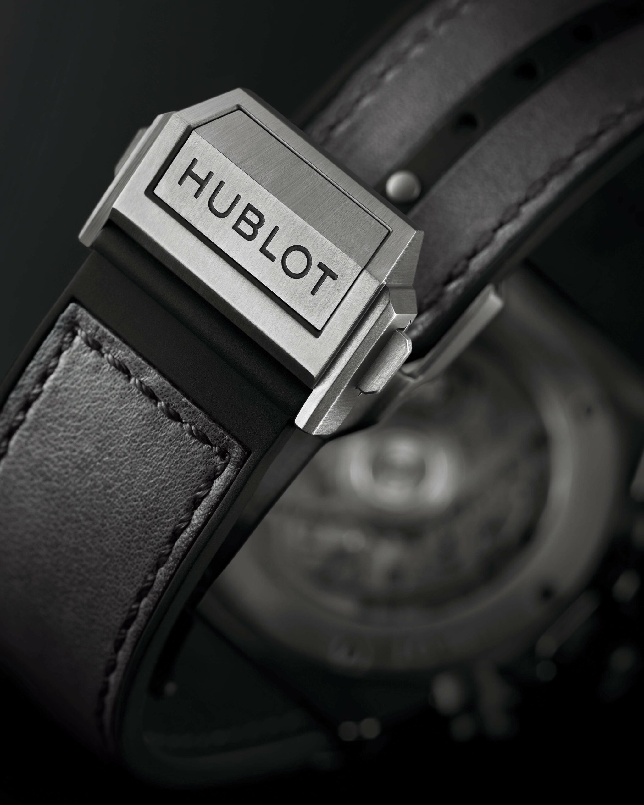Pour ce modèle, Hublot a repris à son compte sa nouvelle conception de lunette, réalisée en deux parties. À l’aide d’une résine adhésive et rigide, la première pièce de la lunette – en cuir, d’environ 1mm d’épaisseur – est insérée sur la seconde en titane grise, puis vissée sur le boîtier de la montre. La lunette pourra donc continuer à se patiner au fil du temps, tout comme le bracelet.